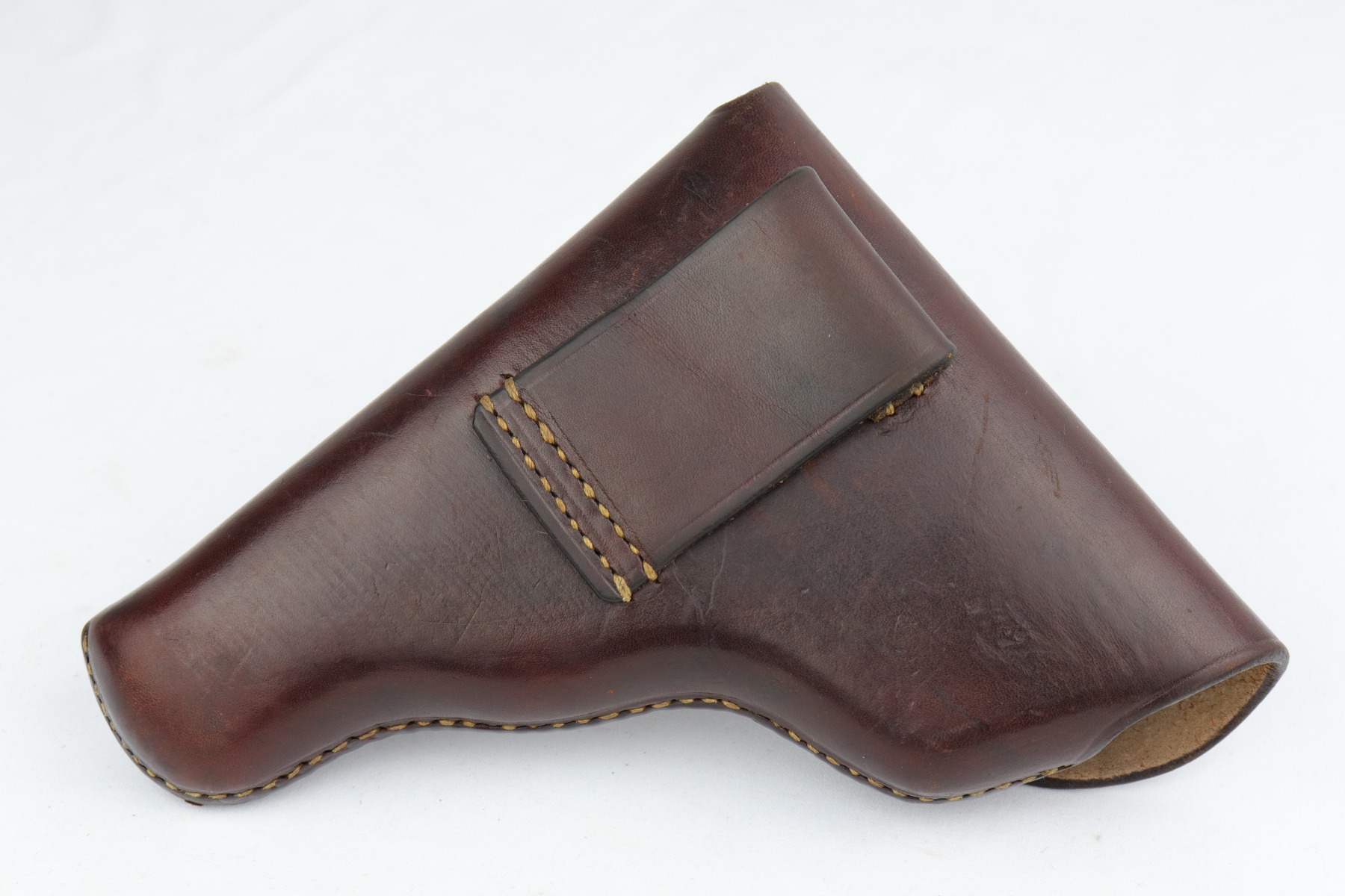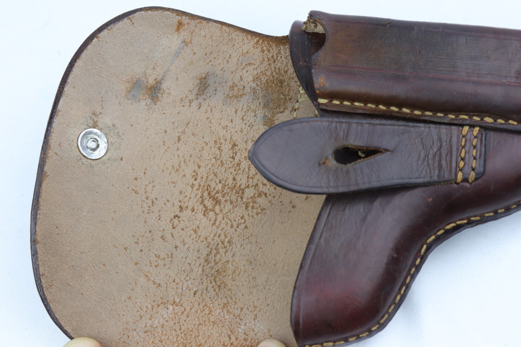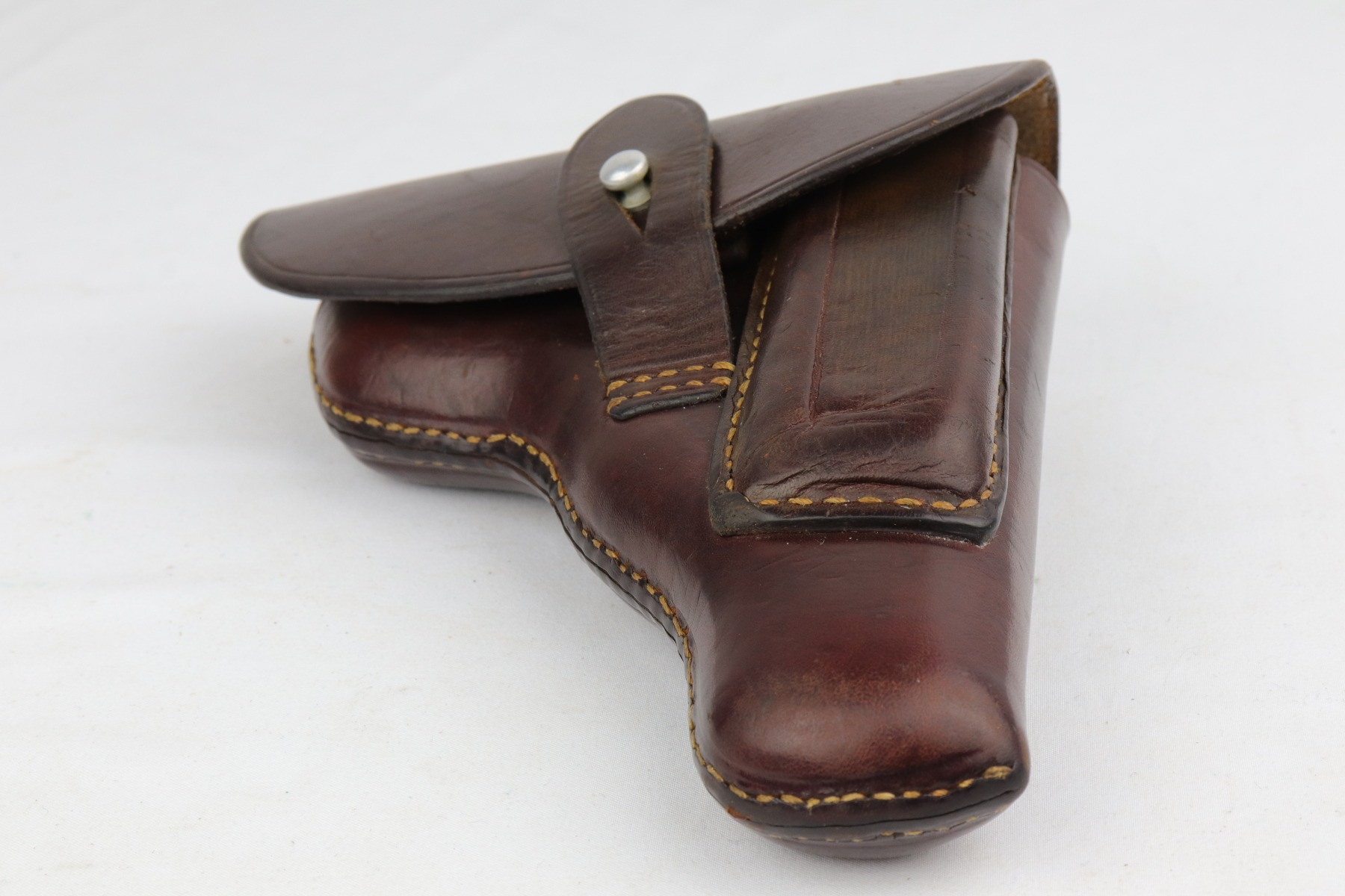 4/10/19 – This is an original hoffman style holster from the WW2 era. The holster has no maker markings or stamps, but the style of leather and stitching indicates late 1930s / early 1940s. The leather is clean and strong with normal pliability. All original stitching is in tact. Fits a Walther PP or any similar sized axis pistol.
