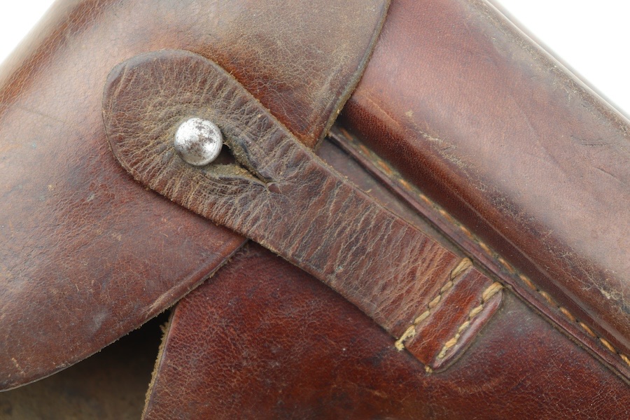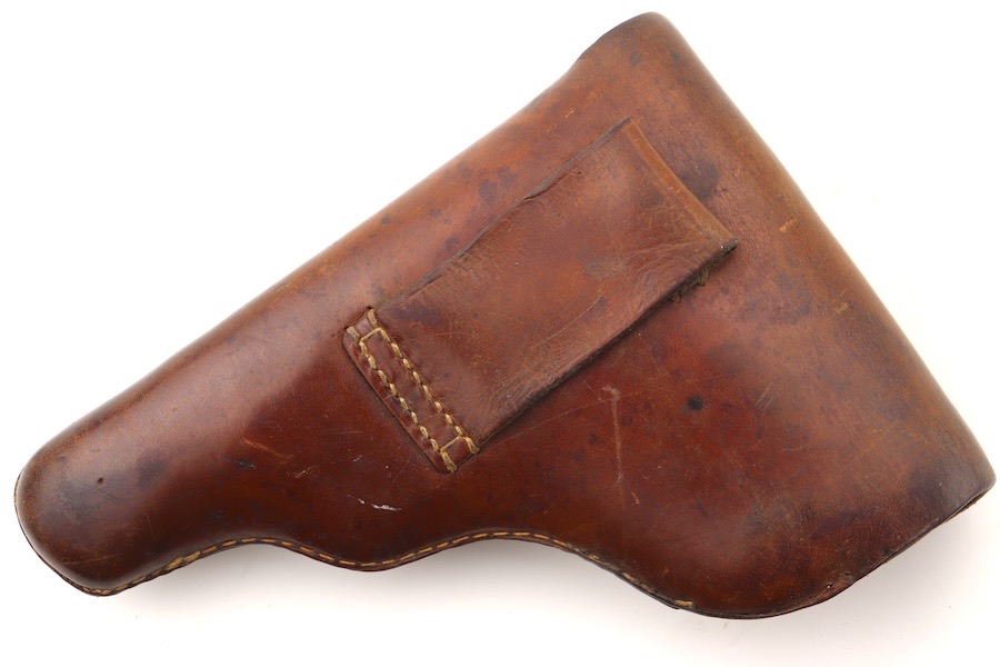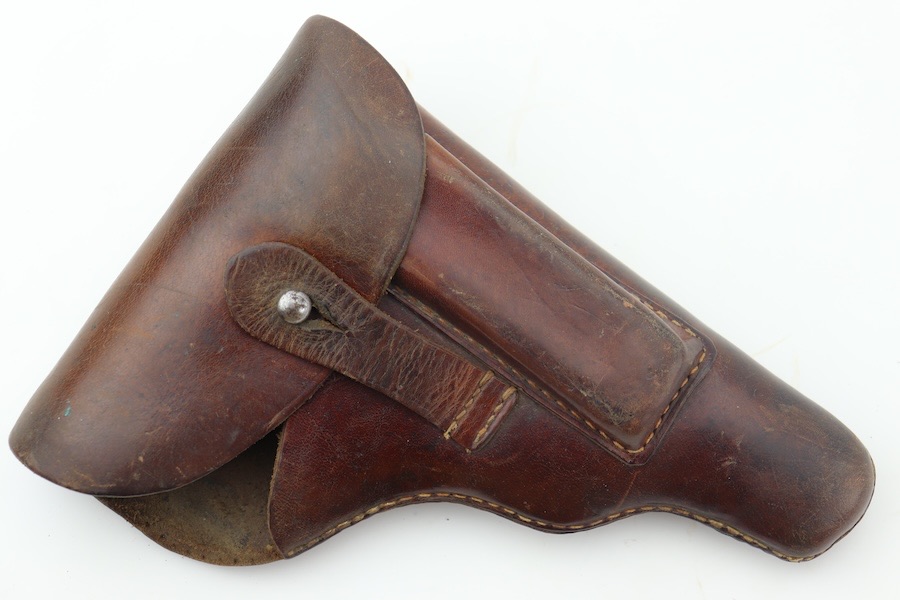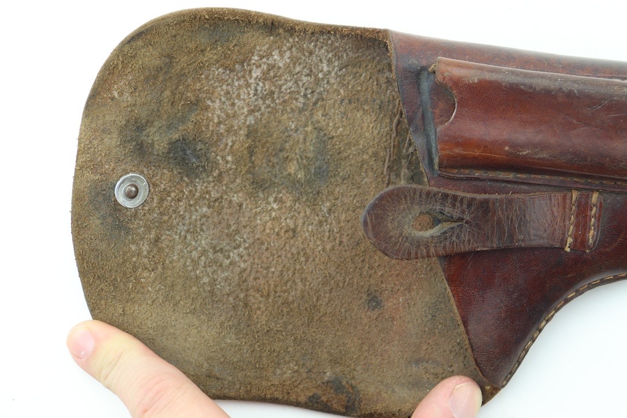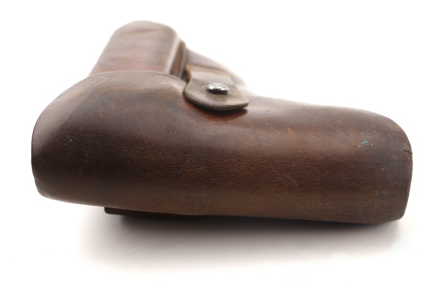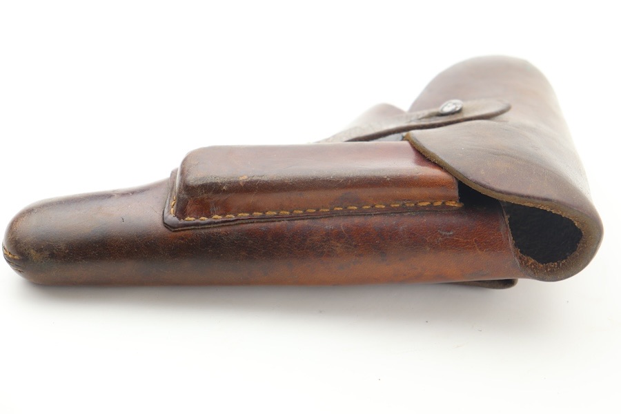 3/28/24 – This is an original hoffman style holster from the WW2 era. The holster has no maker markings or stamps, but the style of leather and stitching indicates late 1930s / early 1940s. The leather is clean and strong with normal pliability. All original stitching is in tact. Fits a Walther PP or any similar sized axis pistol.