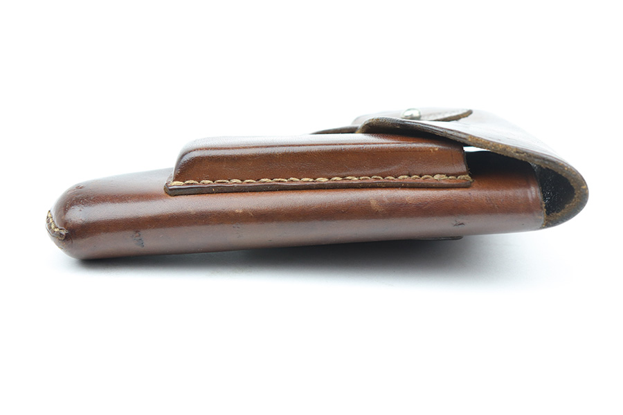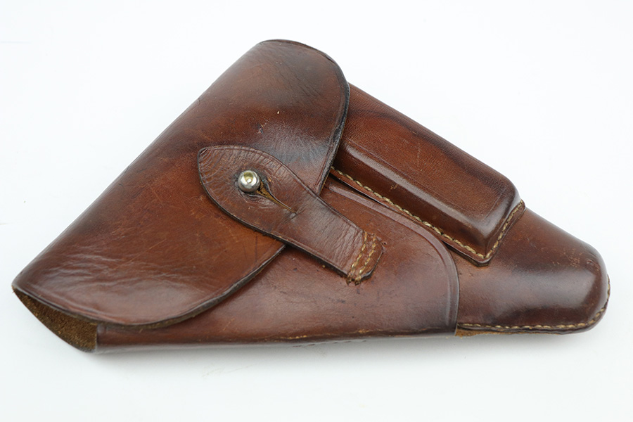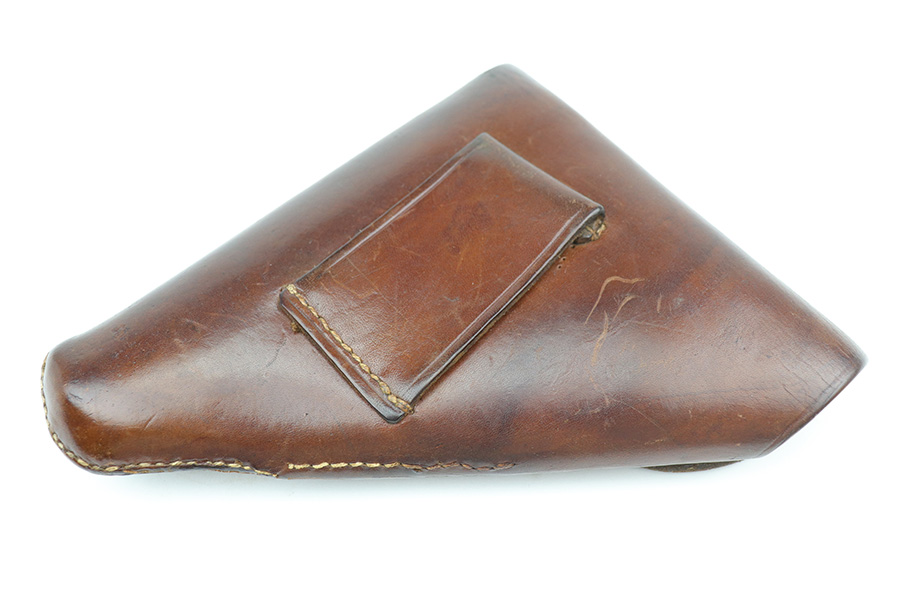 8/27/21 – This is a commercial, unmarked holster for a Mauser HSC. Also fits similar sized 7.65mm pistols. The holster has nice light brown leather that’s in a style commonly found made with “ftt” maker stamps. The leather and stitching have no major flaws or notable issues.
