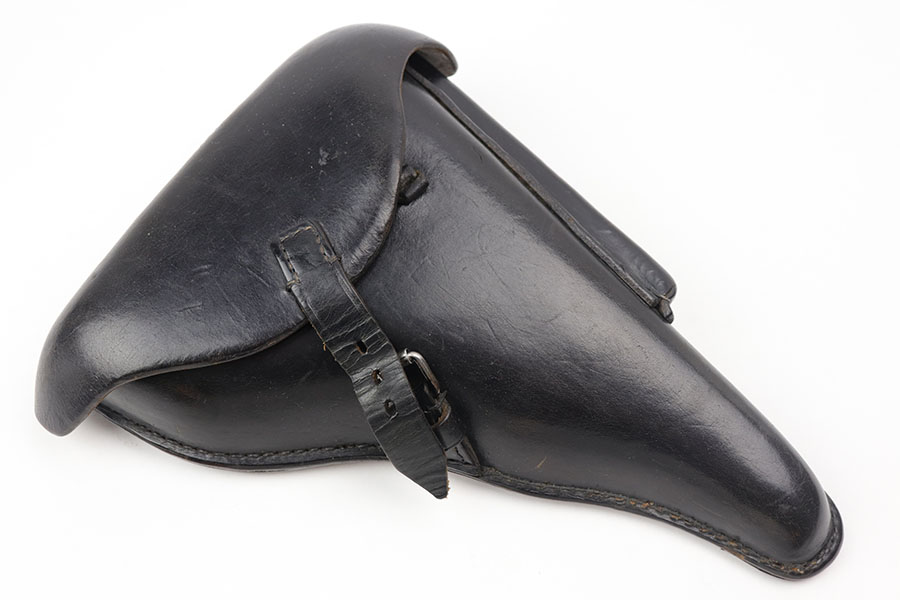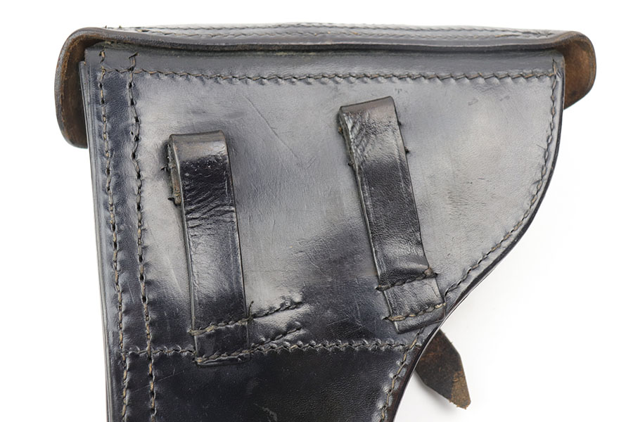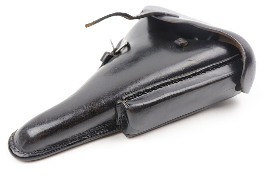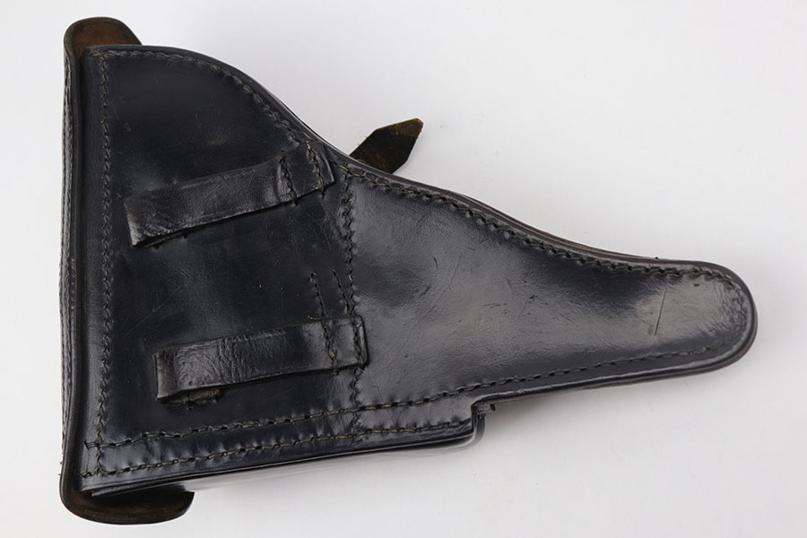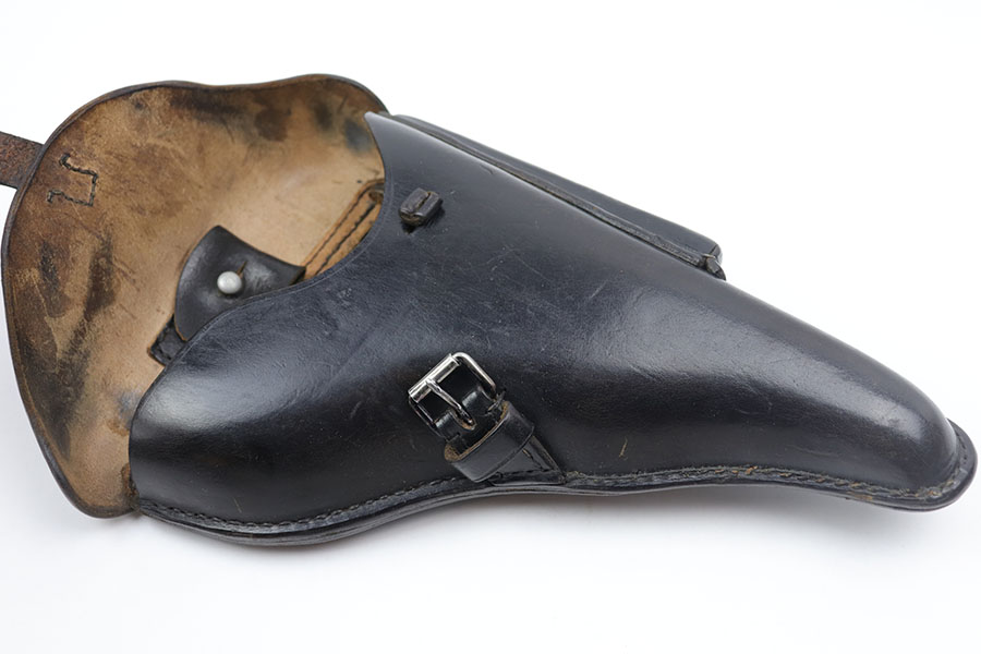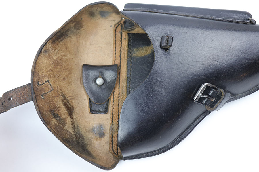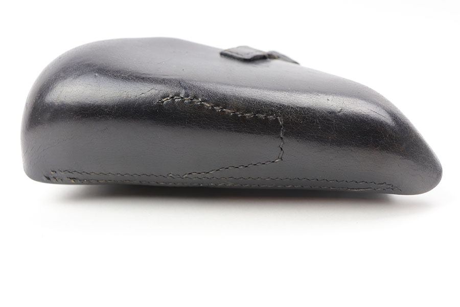 8/18/20 – This is an original, scarce commercial Krieghoff Luger holster. The holster is Krieghoff style, with a slightly different cut of leather, along with black leather and black stitching which are unique / specific to Krieghoff holsters. However, this holster has no proofs or stamps, which indicates it’s intended for a commercial Krieghoff Luger. Very nice leather has normal exterior aging but no excessive wear. All original stitching in tact as well. A great collector piece.