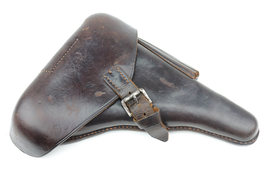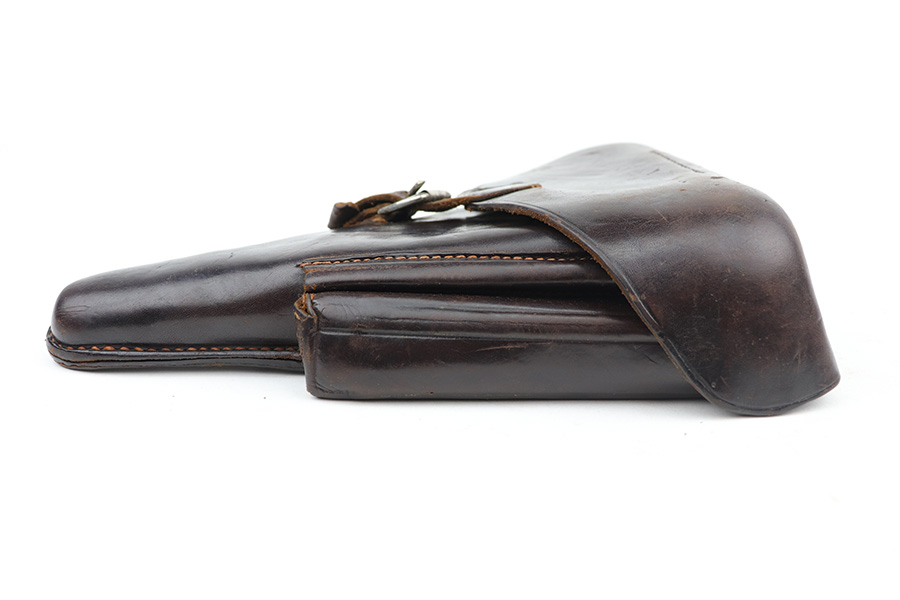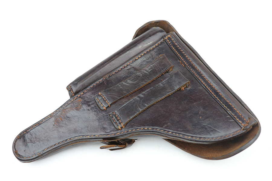 9/27/21 – This holster is for a P.08. This holster was manufactured for the commercial market in the 1920’s to 1930’s. The holster’s leather is in good condition beside minor wear and tear. The stitching is frayed in some places but mostly intact. This holster also features a place for a cleaning rod. The closure strap and buckle are in good condition.