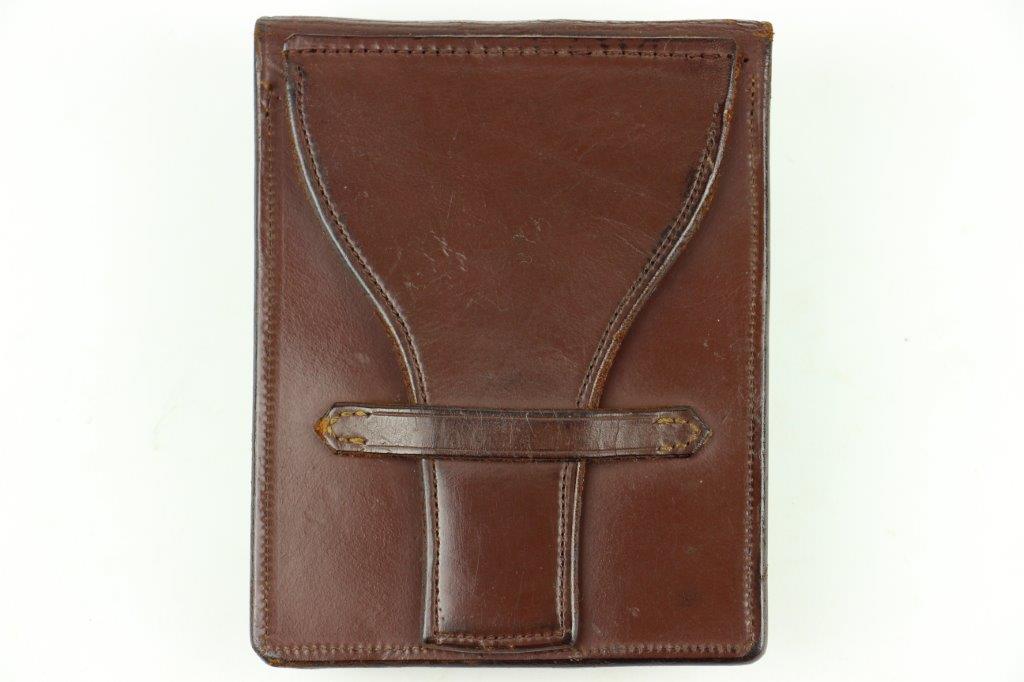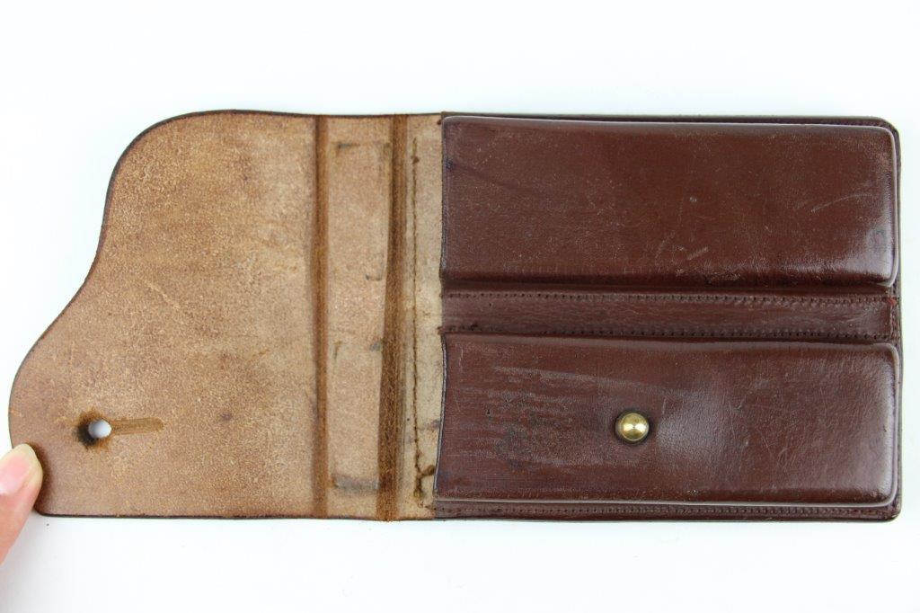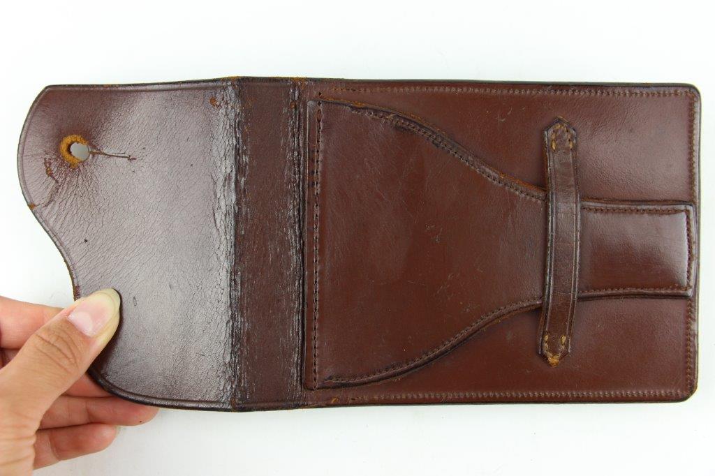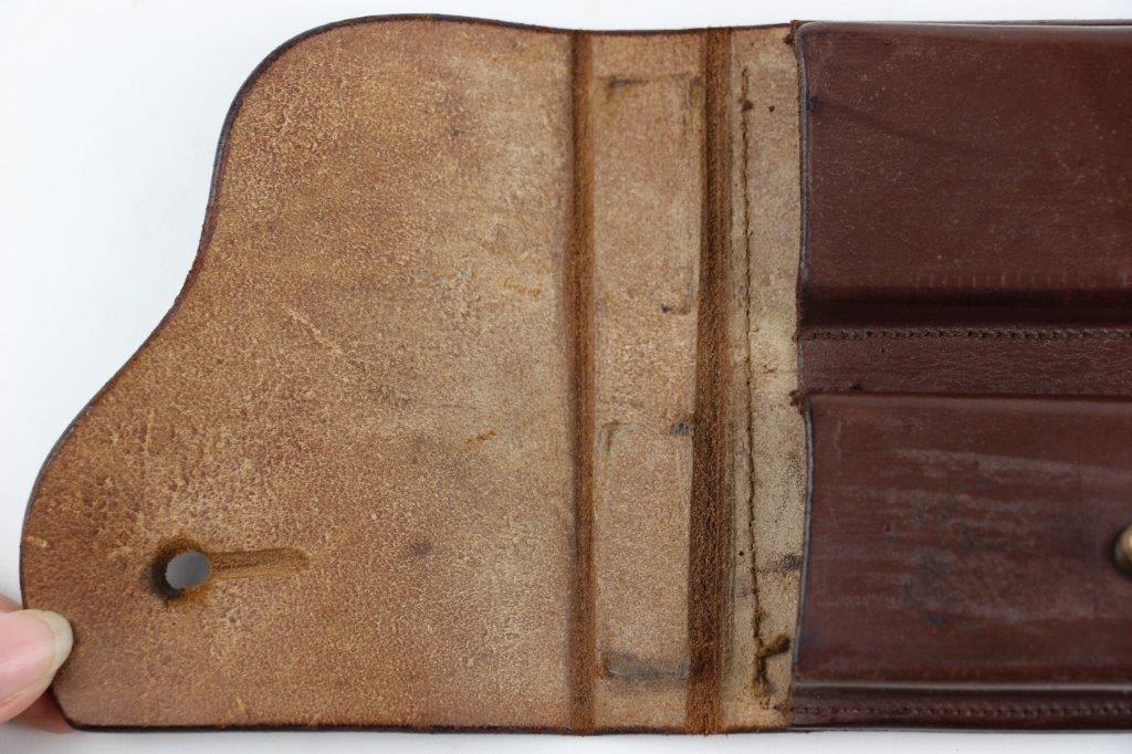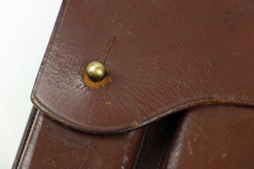 8/12/24 – This is an unmarked leather dual magazine pouch that holds 2 standard M1911 magazines. The leather is aged slightly but excellent overall condition with no major flaws. Light surface wrinkling on the bent portions of leather, which is normal. The interior leather is clean. All original stitching is tight throughout. No marking or stamps, but the style of leather and brass closure knob makes this most likely a 1920’s commercial production example.
