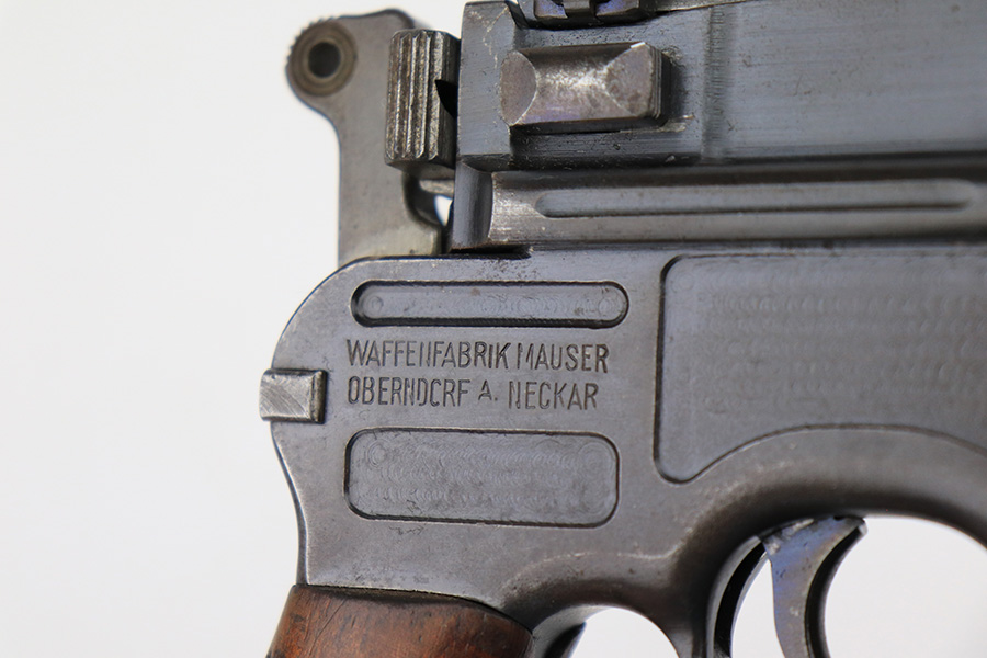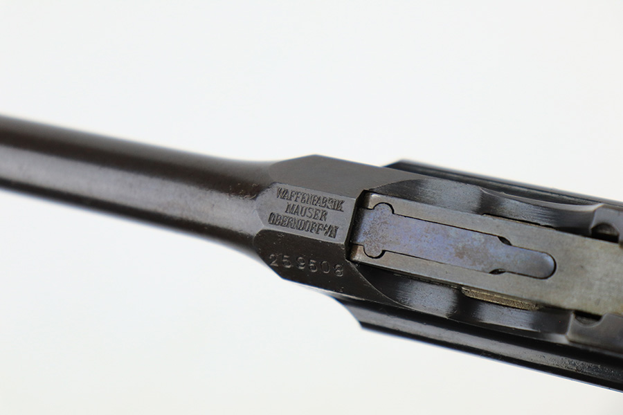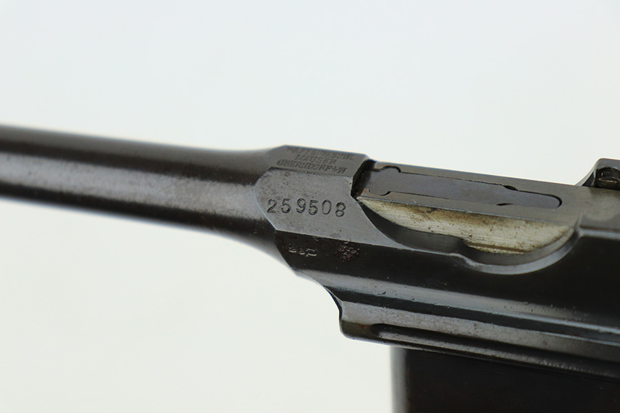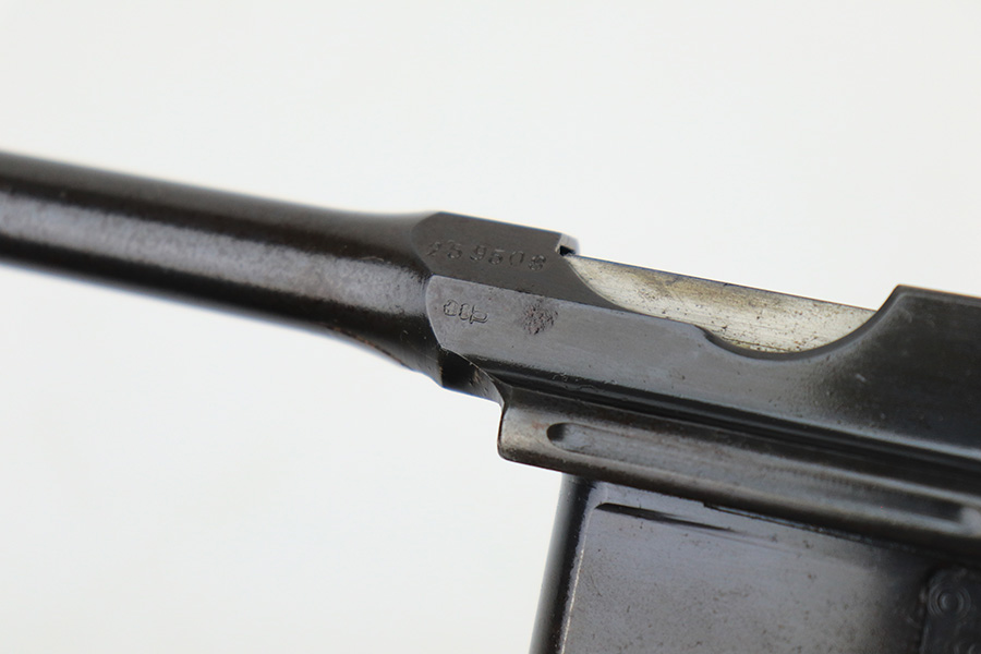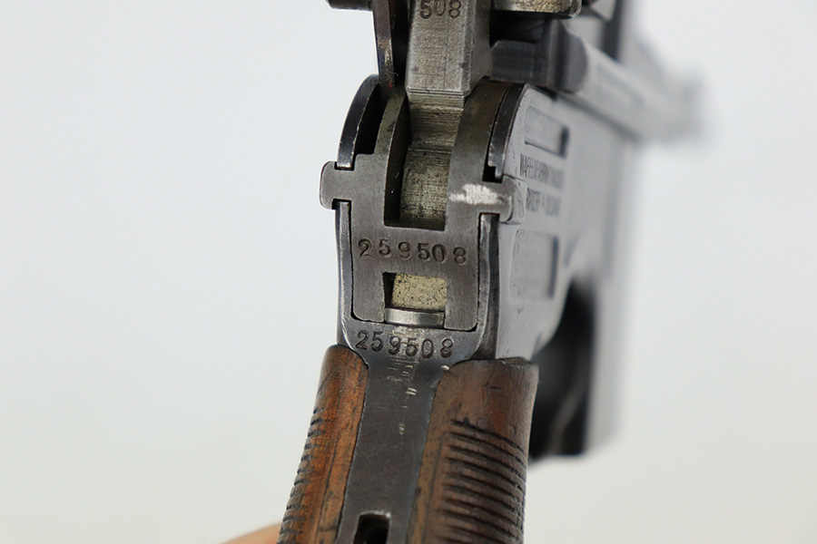 5/20/22 – This is a nice example of a Mauser C96 Broomhandle sold in the commercial market in 1911-15. The gun is all matching and has the proper “Double Crown U” proofs. There isn’t much actual finish loss, but there is brown patina under the bluing on most of the gun. Tiny dots of oxidation and freckling throughout. There is a small textured scratch on the underside of the barrel. Comes with slightly worn wood grips that are numbered and matching to the gun. The bore has poor rifling with pitting and oxidation throughout.