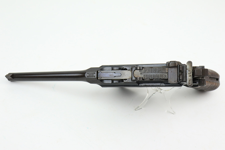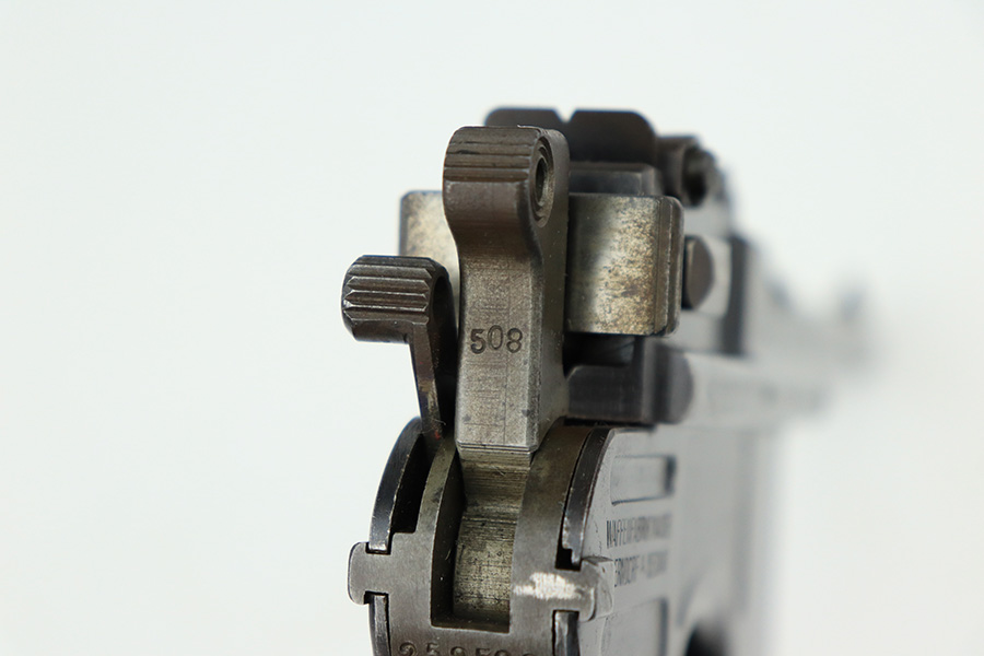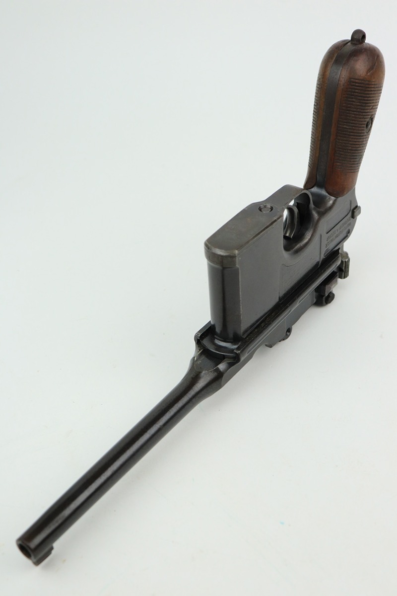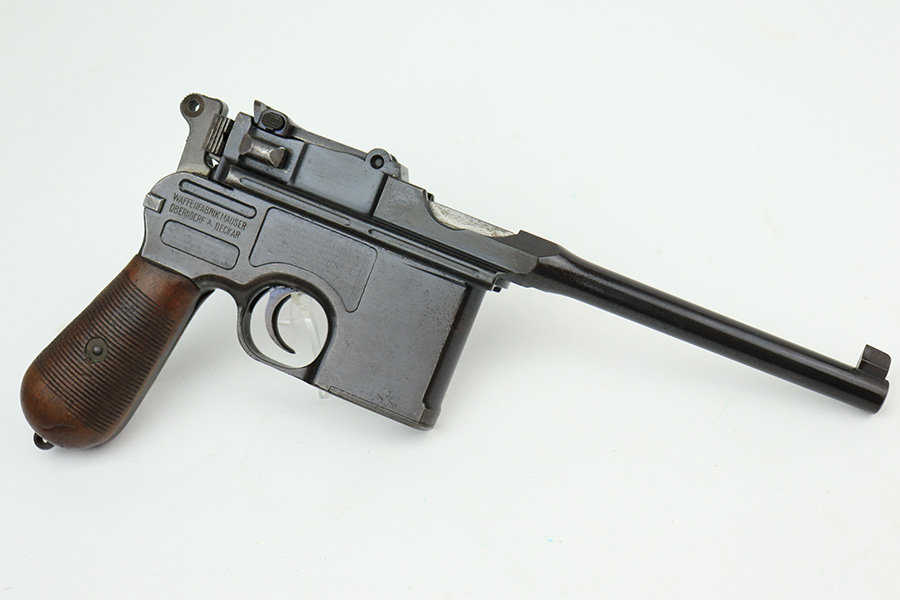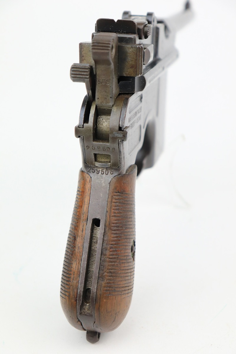 5/20/22 – This is a nice example of a Mauser C96 Broomhandle sold in the commercial market in 1911-15. The gun is all matching and has the proper “Double Crown U” proofs. There isn’t much actual finish loss, but there is brown patina under the bluing on most of the gun. Tiny dots of oxidation and freckling throughout. There is a small textured scratch on the underside of the barrel. Comes with slightly worn wood grips that are numbered and matching to the gun. The bore has poor rifling with pitting and oxidation throughout.