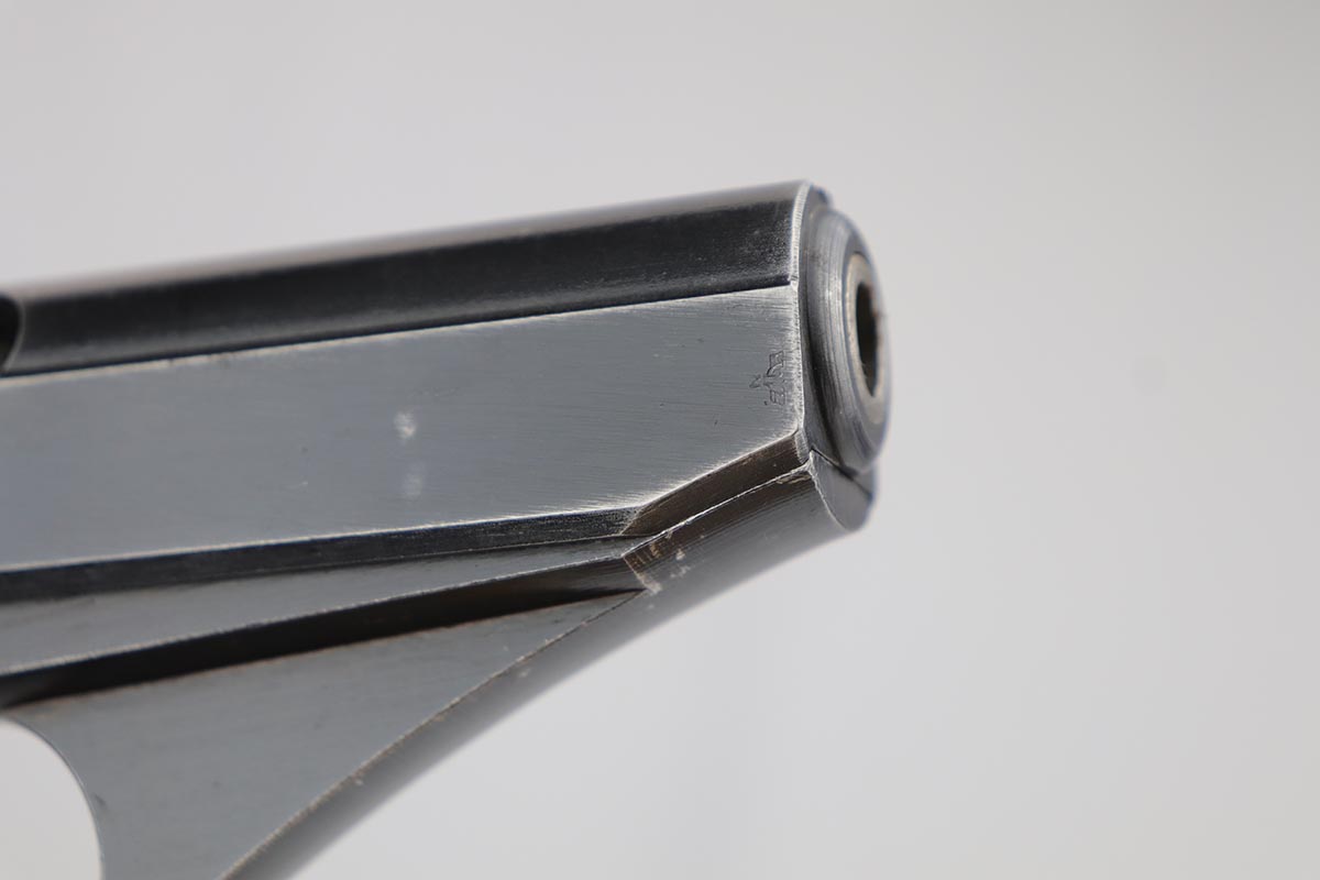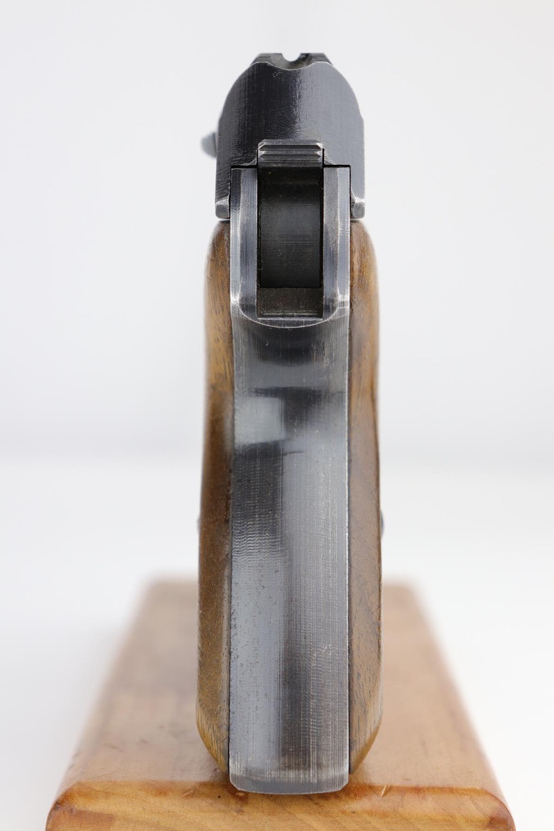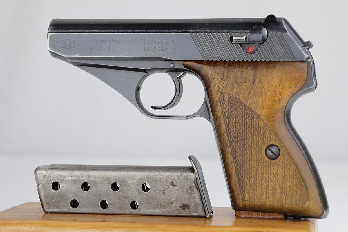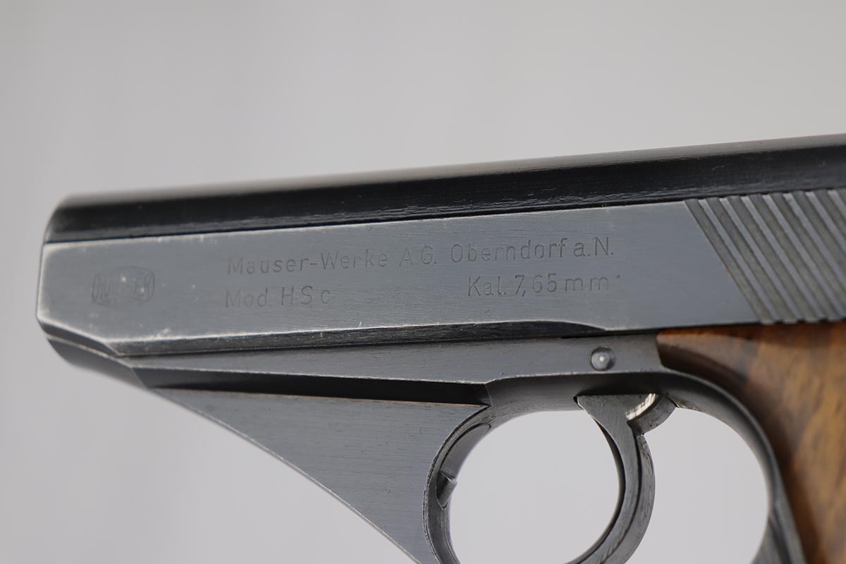 8/26/19 – This is a 4th variation WW2 wartime production Mauser HSc. The pistol is commercial production with eagle/N proof stamps. The wartime blued finish is excellent, with some normal thinning on the front and back straps, along with some muzzle wear and normal slide wear. The overall condition is about 94%. The bore is in great shape with very strong rifling and minor residue / signs of use. Comes with an original magazine with the Mauser logo on the base, but the base is slightly bent upward. Guaranteed original and fully functional.
