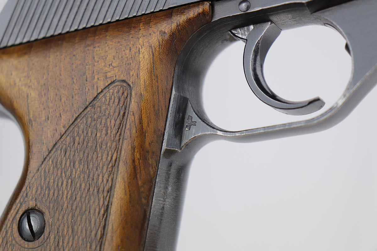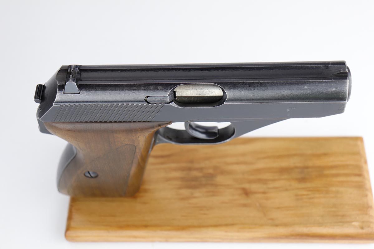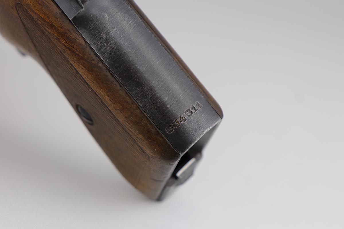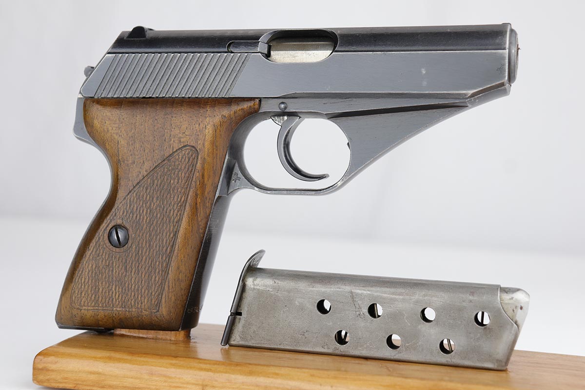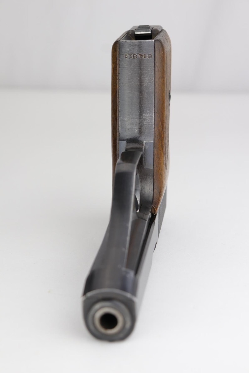8/26/19 – This is a 4th variation WW2 wartime production Mauser HSc. The pistol is commercial production with eagle/N proof stamps. The wartime blued finish is excellent, with some normal thinning on the front and back straps, along with some muzzle wear and normal slide wear. The overall condition is about 94%. The bore is in great shape with very strong rifling and minor residue / signs of use. Comes with an original magazine with the Mauser logo on the base, but the base is slightly bent upward. Guaranteed original and fully functional.