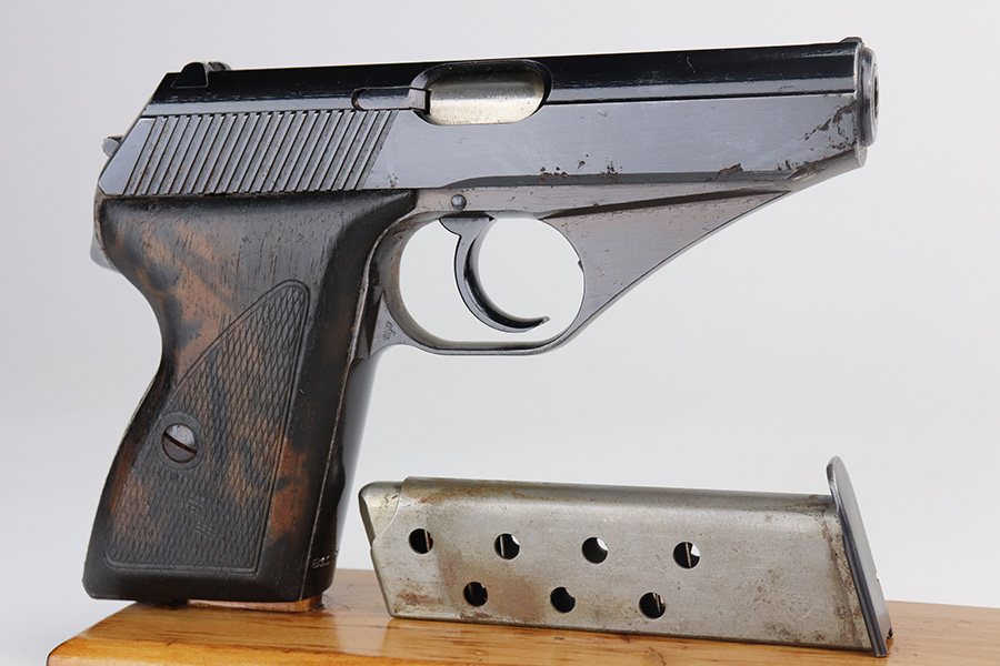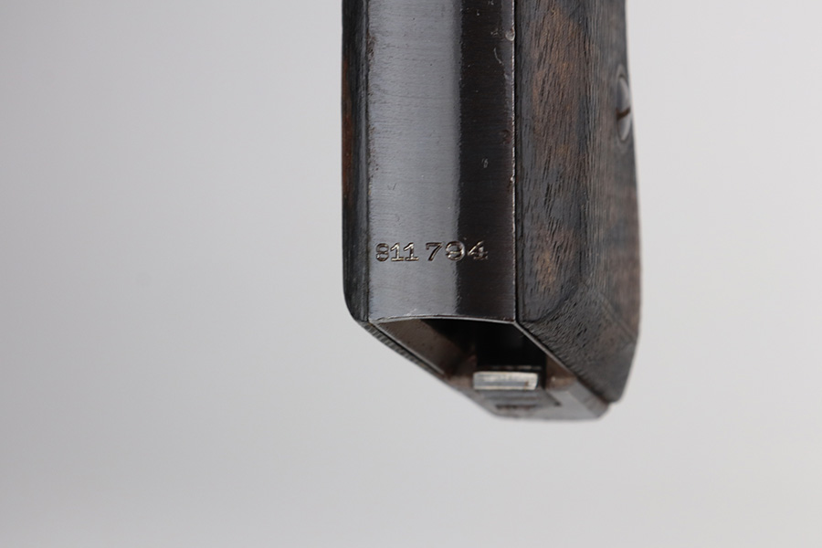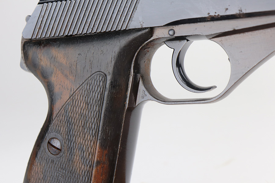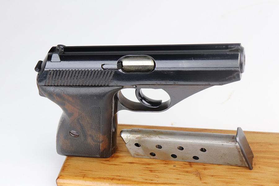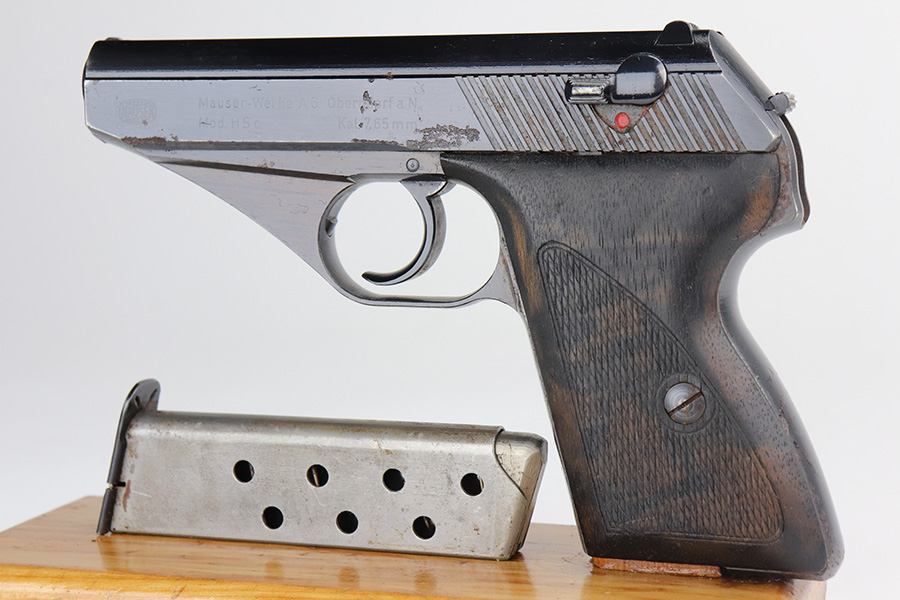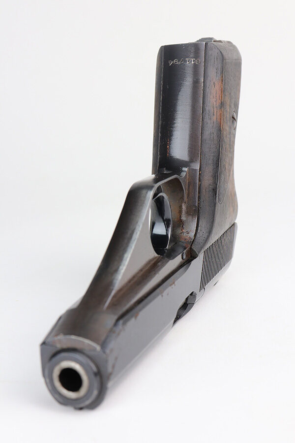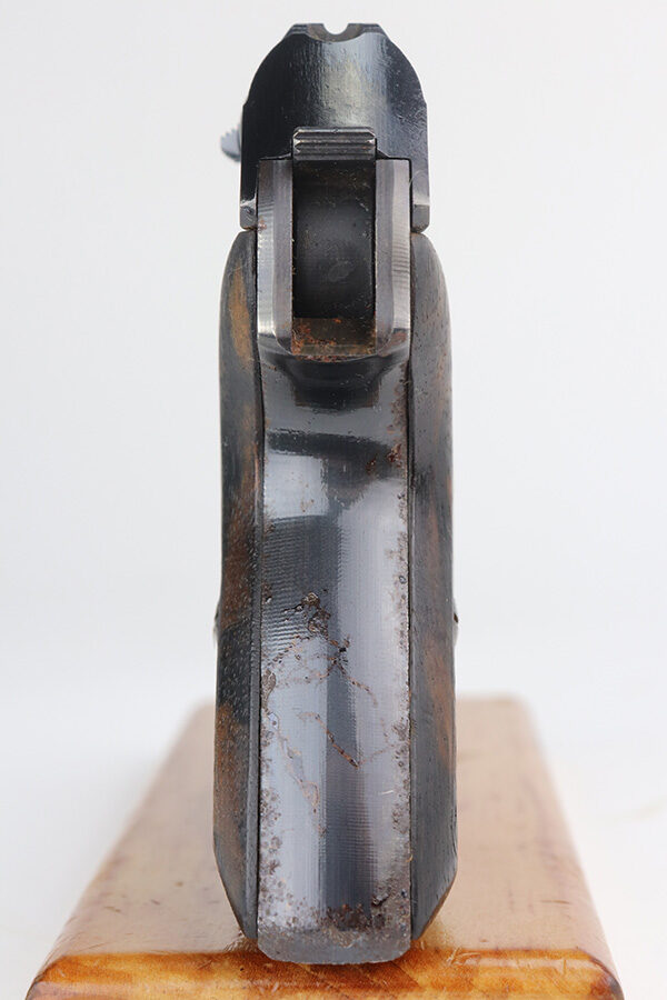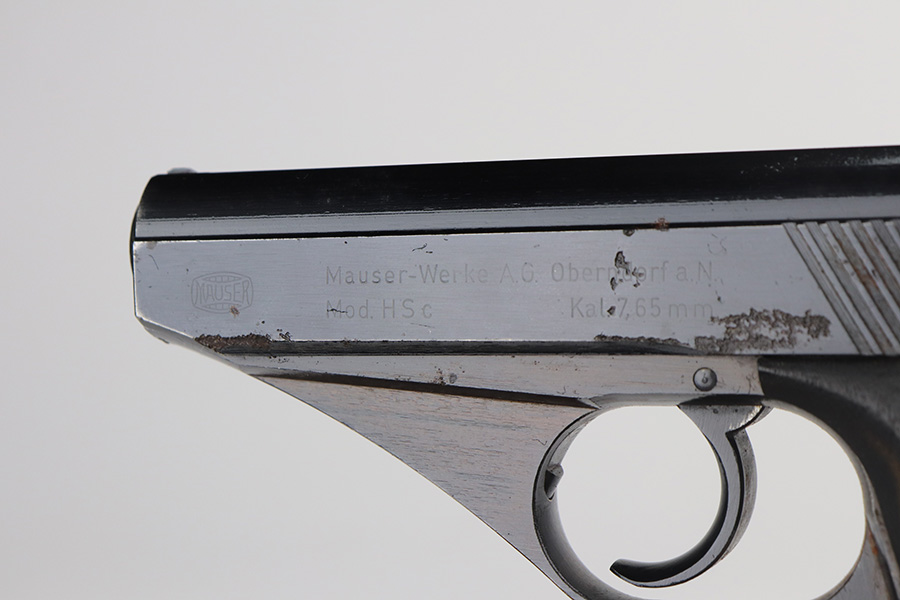 6/9/21 – This is a nice example of a Mauser HSC sold in the commercial market in 1943. It is matching and has the proper “Eagle N” proofs. It has retained more than 98% of its bluing. While there is very little actual finish loss, there are areas of oxidation and heavy pitting on both sides of the slide, around the muzzle, and on the back strap. Comes with nice wood grips and a blank-bottom magazine. Mint bore.