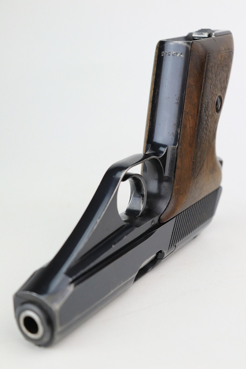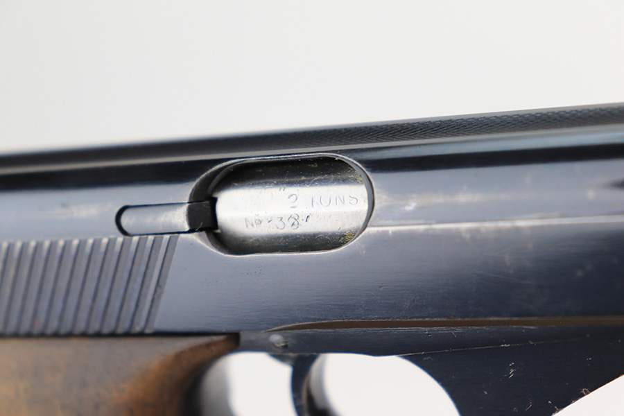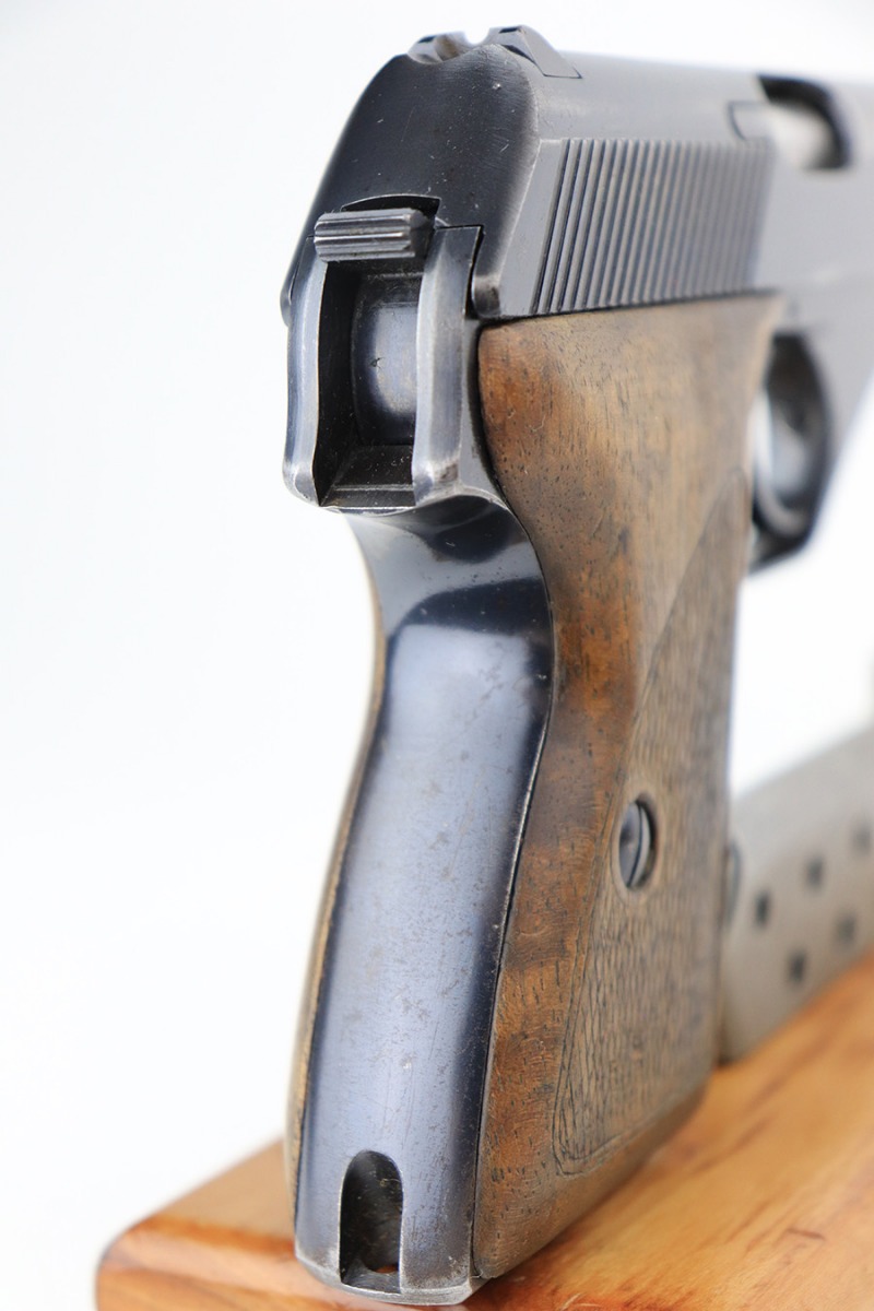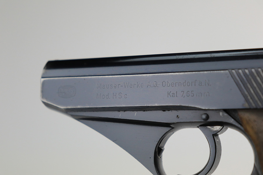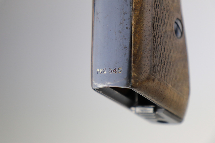 4/22/22 – This is an excellent example of a Mauser HSC sold in the commercial market in 1942. It is all matching and has the proper commercial “Eagle N” proofs. This particular gun must’ve ended up in England at some point, because it has a few British proofs. It has retained about 95% of its original high polish finish. The majority of the wear is along the round edge of the right side of the slide. There is also minor muzzle wear. Some very light scratches and freckling on the grip straps. Comes with nice wood grips (small chip in the top corner of the left panel) and one period-correct magazine. The bore has good rifling with very minor pin-pricking throughout.