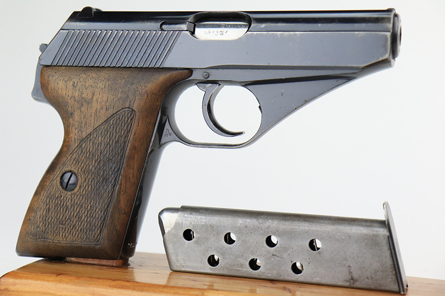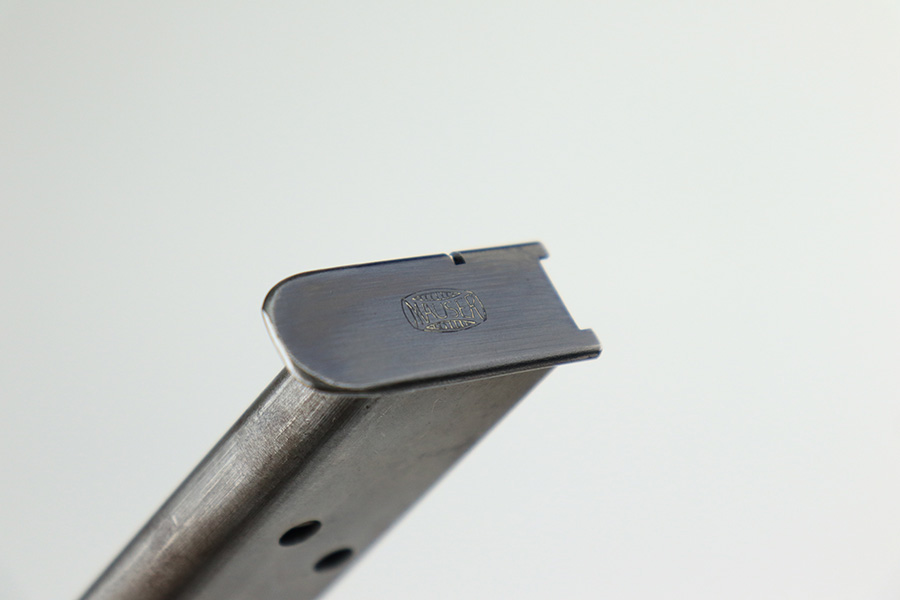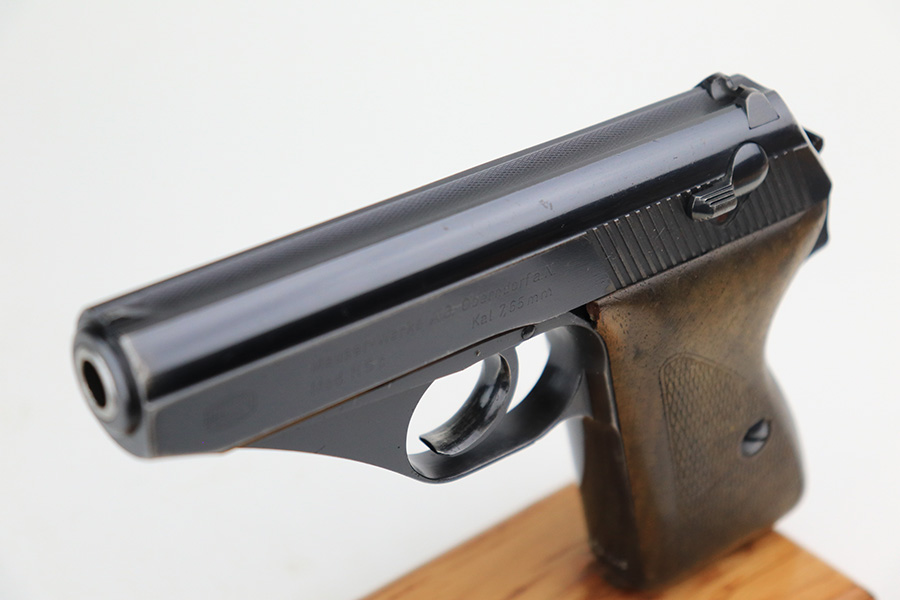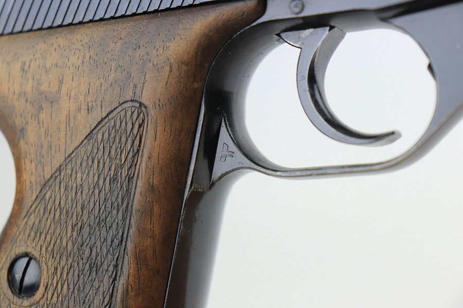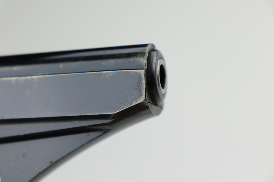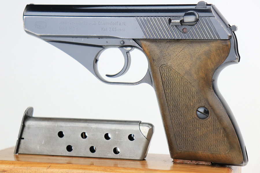 4/22/22 – This is an excellent example of a Mauser HSC sold in the commercial market in 1942. It is all matching and has the proper commercial “Eagle N” proofs. This particular gun must’ve ended up in England at some point, because it has a few British proofs. It has retained about 95% of its original high polish finish. The majority of the wear is along the round edge of the right side of the slide. There is also minor muzzle wear. Some very light scratches and freckling on the grip straps. Comes with nice wood grips (small chip in the top corner of the left panel) and one period-correct magazine. The bore has good rifling with very minor pin-pricking throughout.