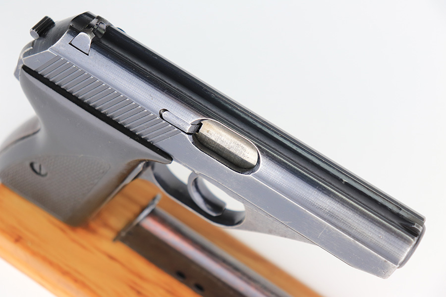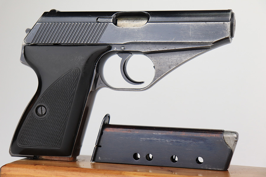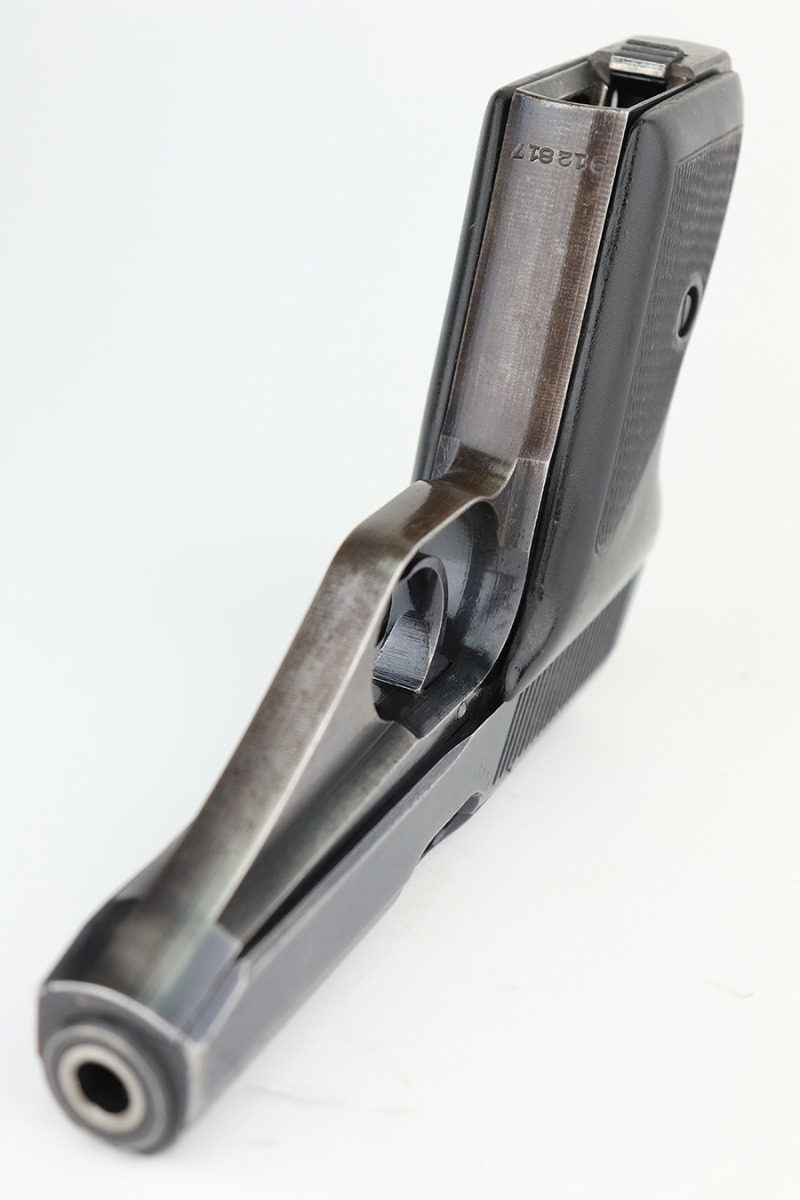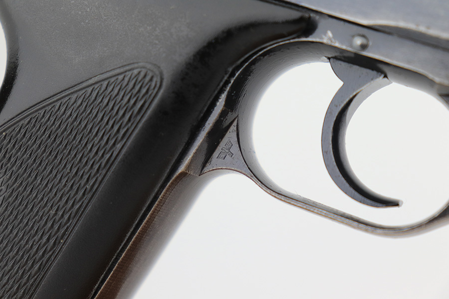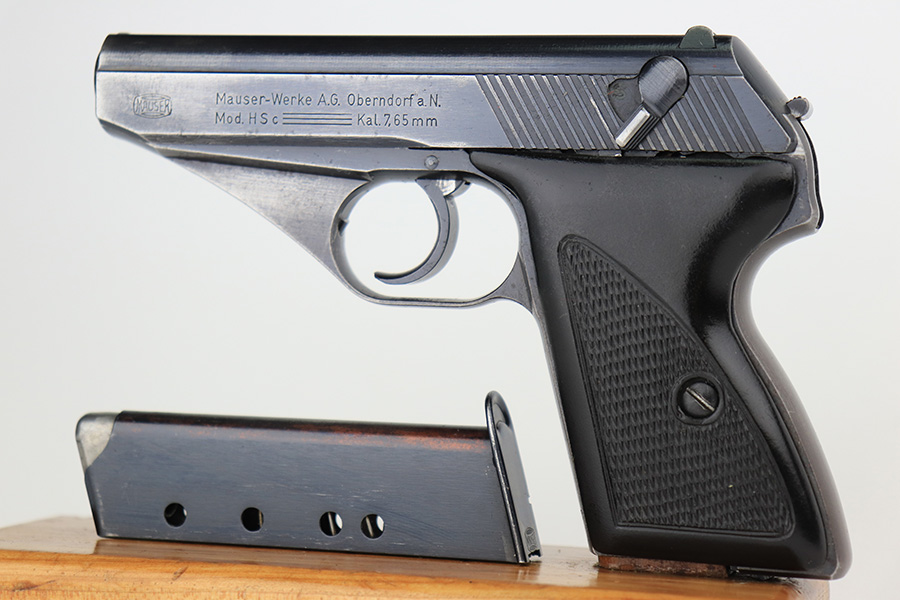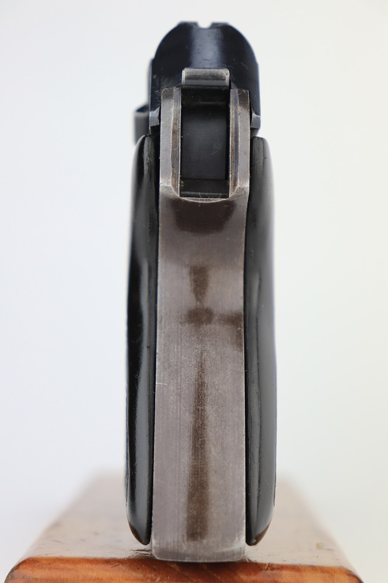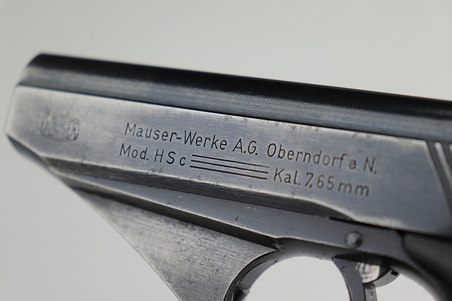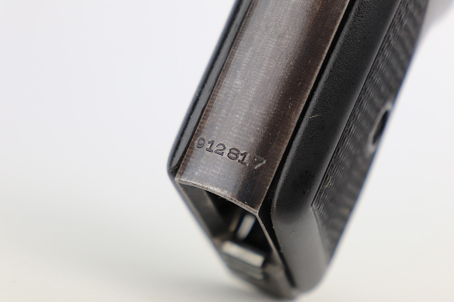 3/17/23 – This is a Mauser HSC sold in the commercial market in 1944. It is all matching and lacks any military proofs. It has retained roughly 75% of its original finish. There are areas of thinning throughout and some light brown patina on the grip straps. Fitted with nice post-war black plastic grips and comes with a post-war magazine. Mint bore.