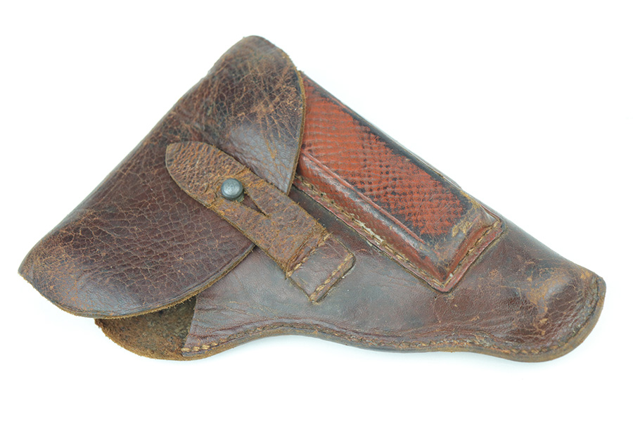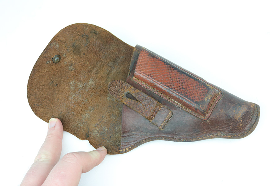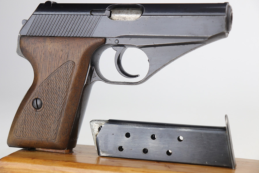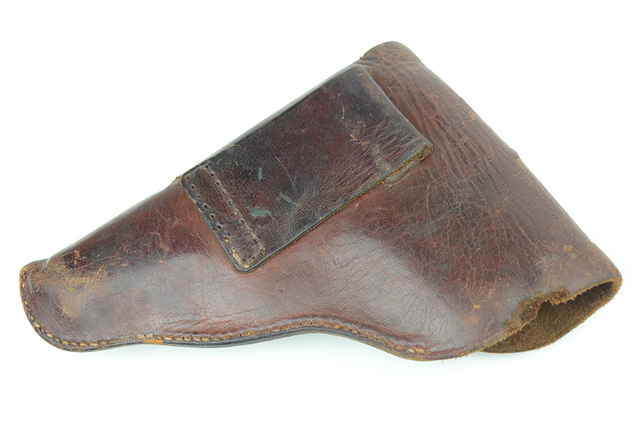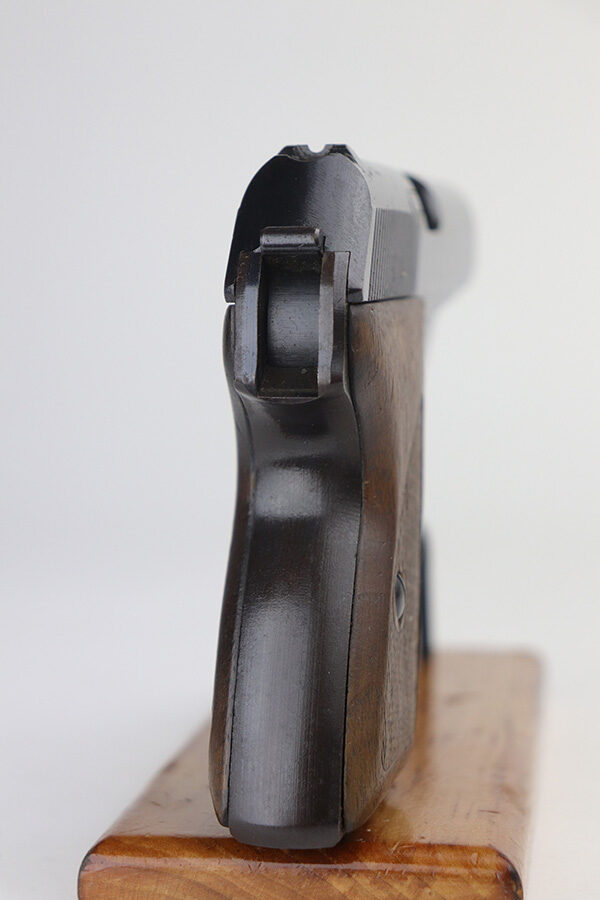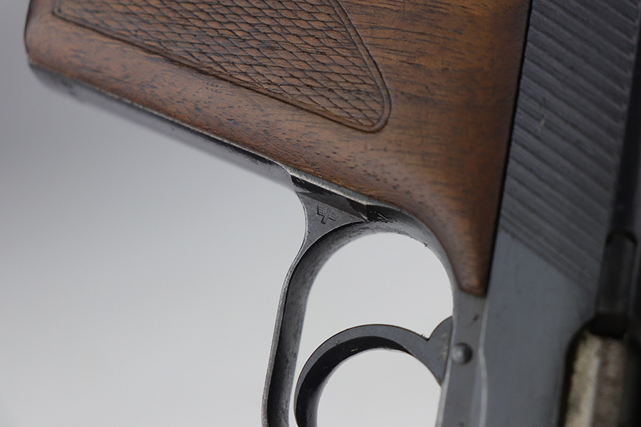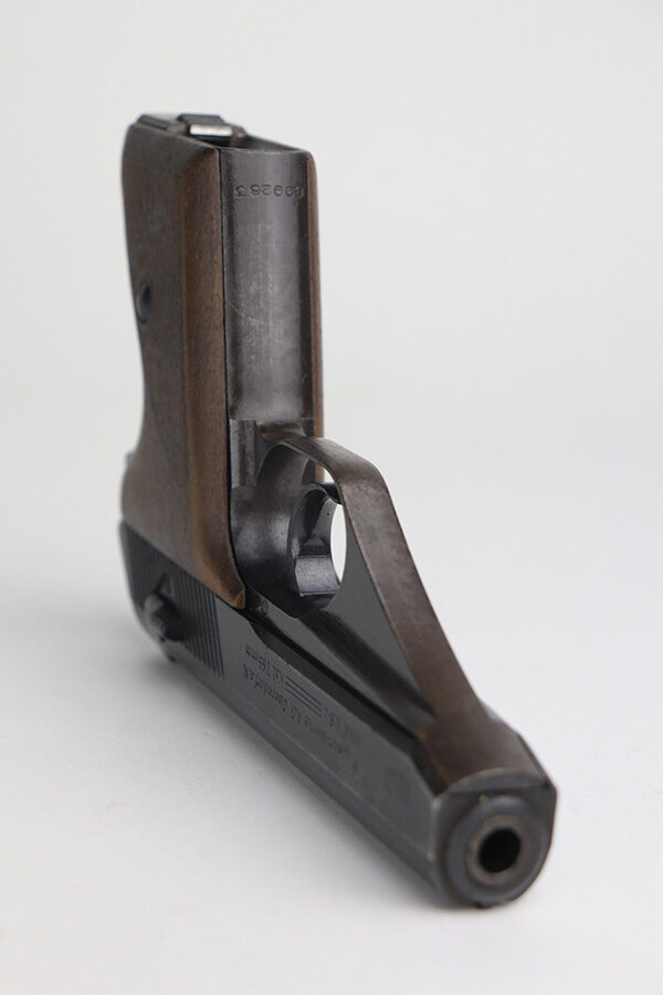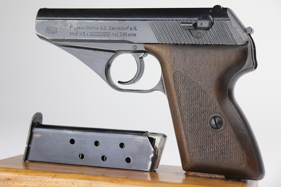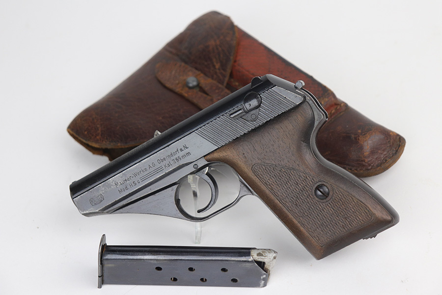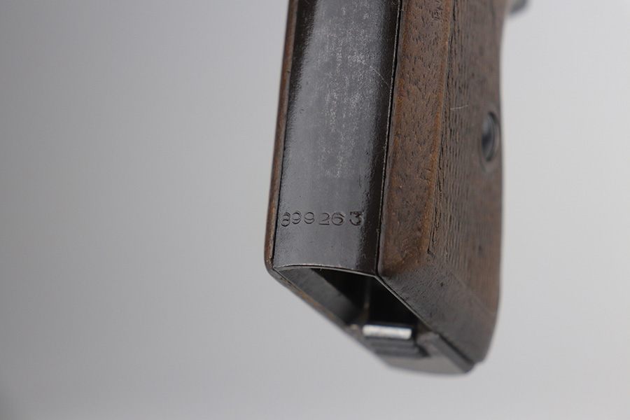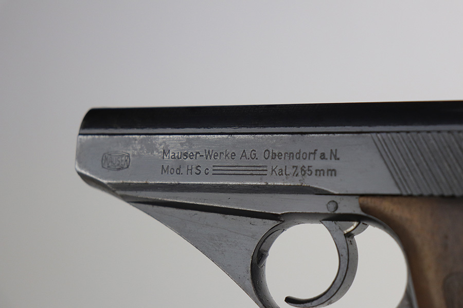 11/23/21 – This is a very nice example of a Mauser HSC sold in the commercial market in 1944. it is all matching, has no military proofs, and has the proper “Eagle N” commercial proofs on the right side of the slide and frame. It comes as a rig with a generic un-marked tan leather holster and one period-correct magazine. There is a small tear on the left side of the holster, and most of the stitching on the belt loop is missing. The gun has retained about 92-93% of its finish. There are areas of minor thinning on the front strap, underside of the frame, and left side of the slide. There is also minor muzzle wear and a light streak of wear on the round edge of the left side of the slide. Spotty oxidation throughout, most noticeable on the front grip strap, underside of the frame, and the left side of the slide. Brown patina on both grip straps. Comes with excellent wood grips. The bore has strong rifling with minor freckling in the grooves.