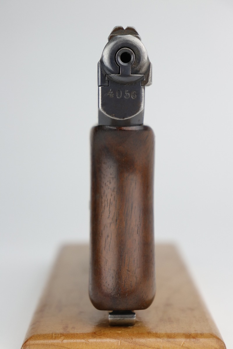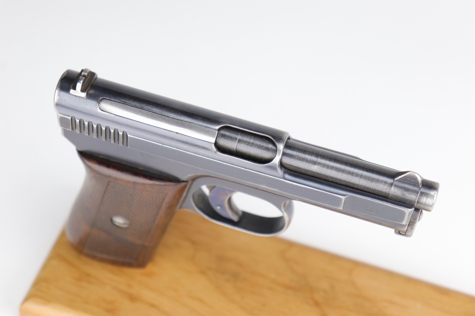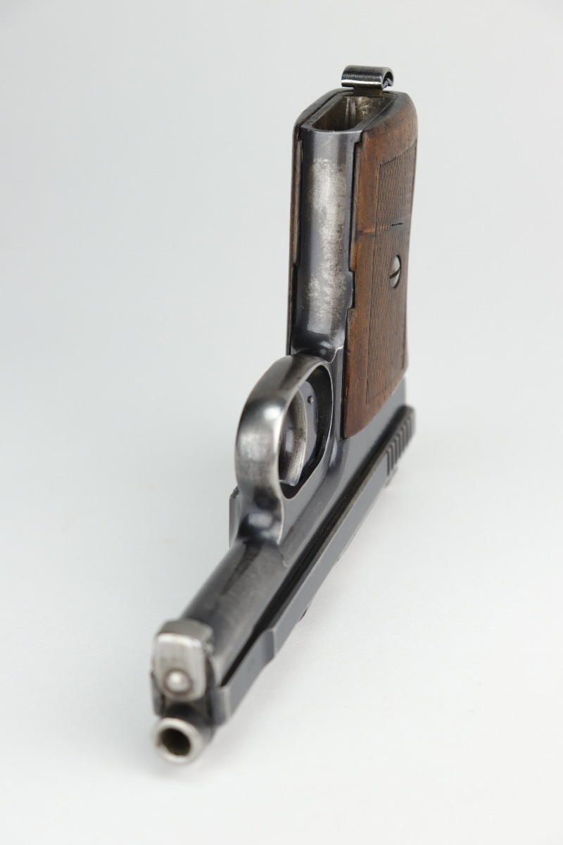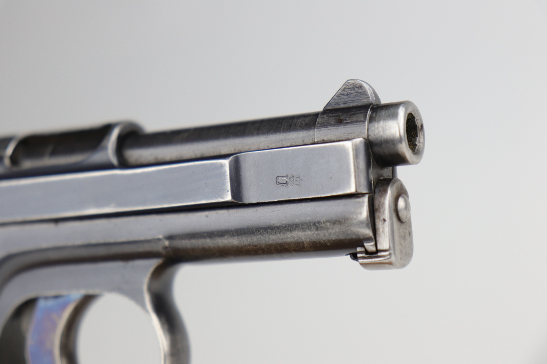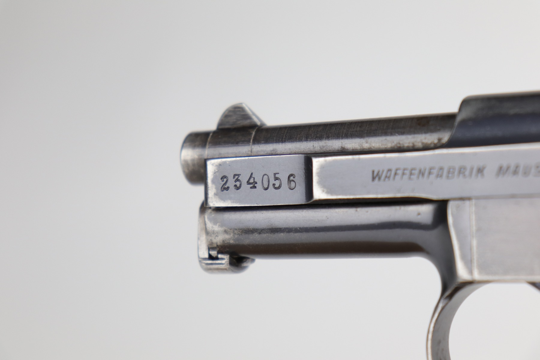 10/16/20 – This is a nice example of a commercially-made Mauser Model 1910 pistol, chambered in .25 ACP. Often referred to as the “standard model”, it was made between 1921-28. The gun is matching, and there is no Mauser logo on the left side. It has retained roughly 75-80% of its original bluing. There is muzzle wear and general high edge wear. Thinning on the barrel. The entire underside of the gun and front strap are worn. The grip is nice, but there is a small crack on the right side. It comes with one period-correct magazine. The bore is very nice – strong rifling with very minor pitting in the grooves.