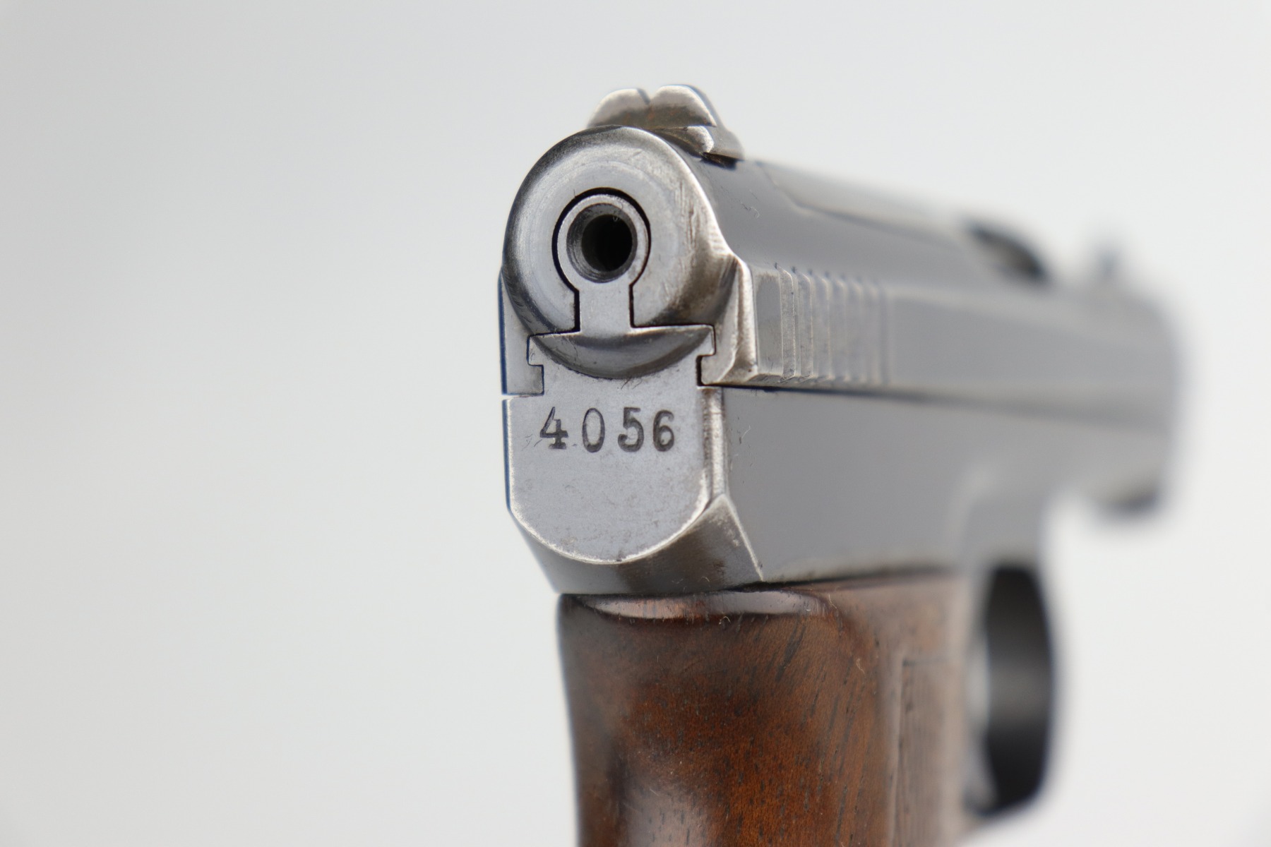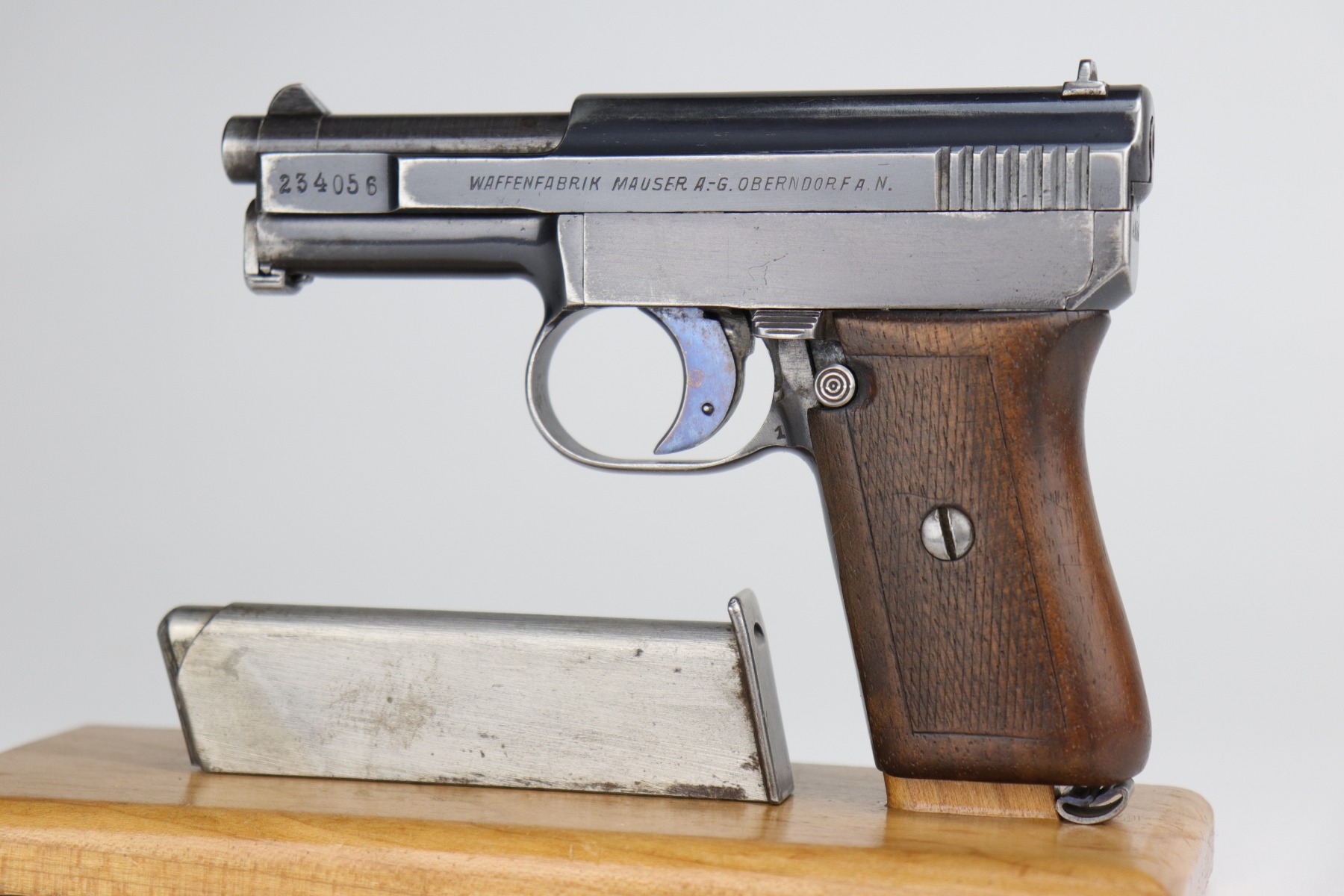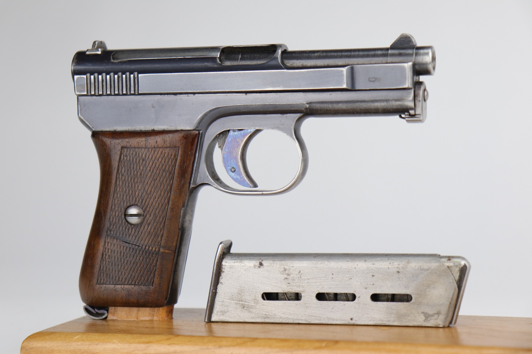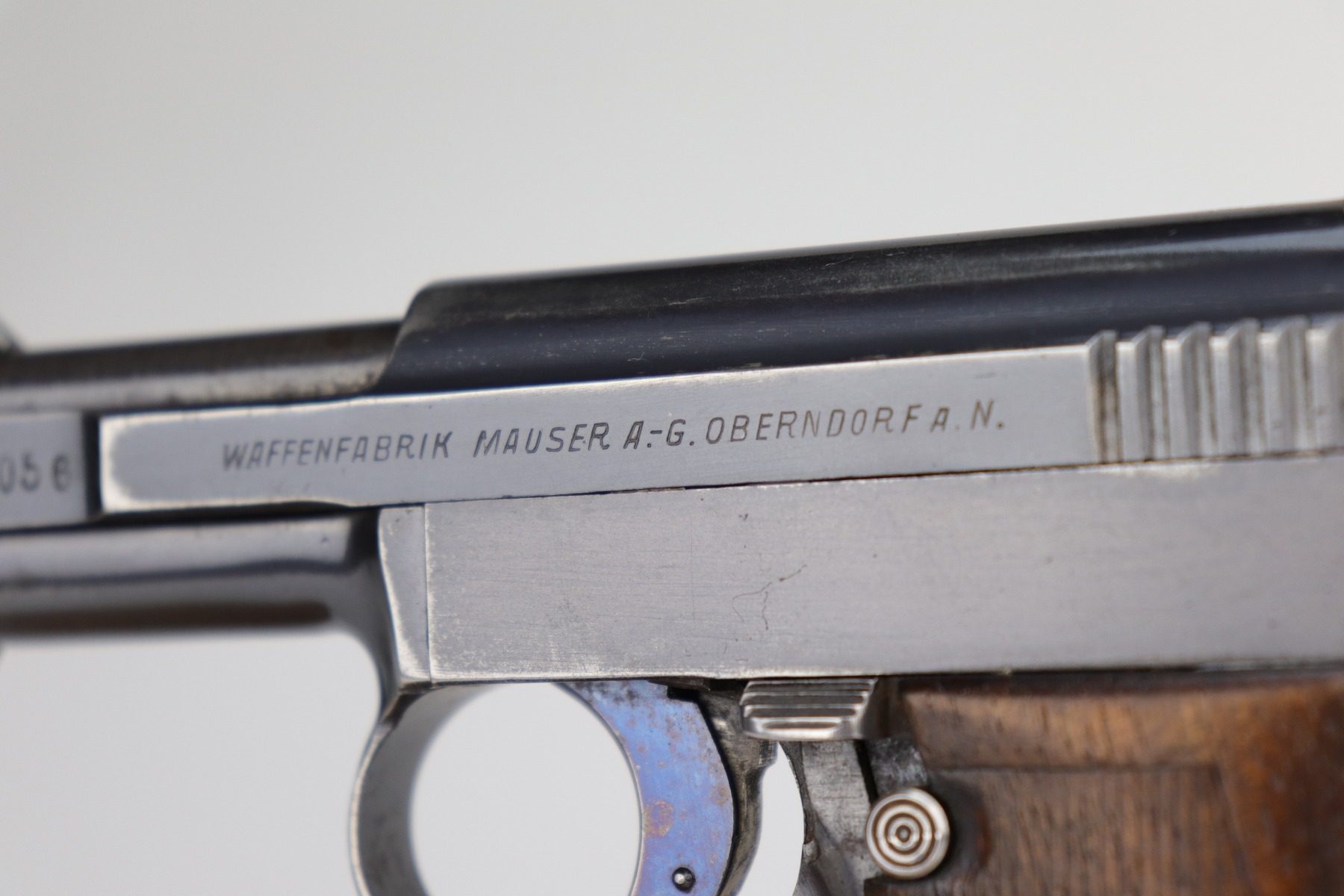 10/16/20 – This is a nice example of a commercially-made Mauser Model 1910 pistol, chambered in .25 ACP. Often referred to as the “standard model”, it was made between 1921-28. The gun is matching, and there is no Mauser logo on the left side. It has retained roughly 75-80% of its original bluing. There is muzzle wear and general high edge wear. Thinning on the barrel. The entire underside of the gun and front strap are worn. The grip is nice, but there is a small crack on the right side. It comes with one period-correct magazine. The bore is very nice – strong rifling with very minor pitting in the grooves.