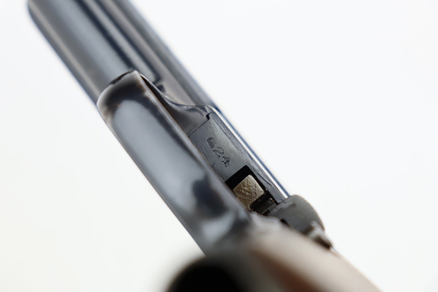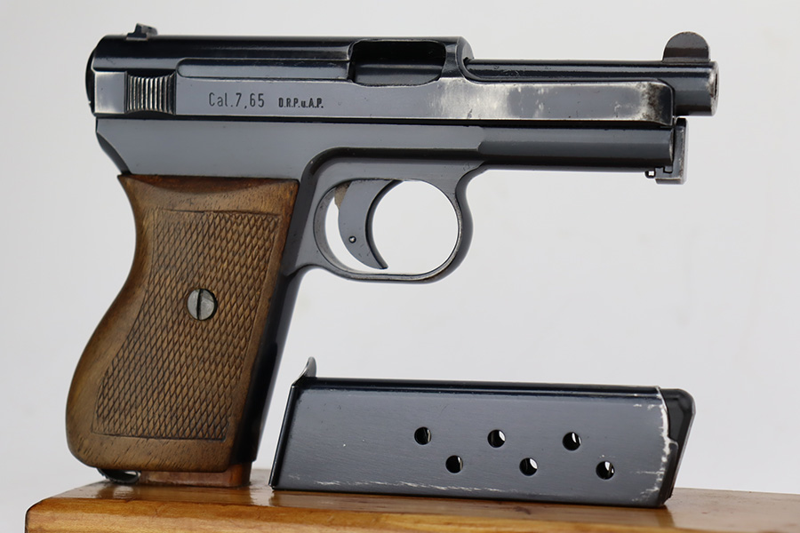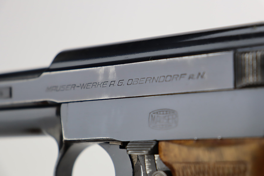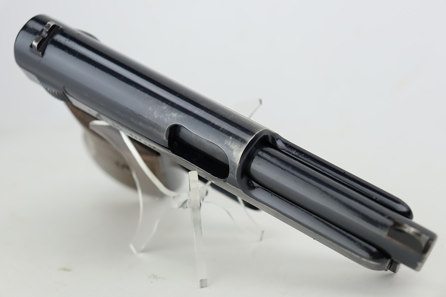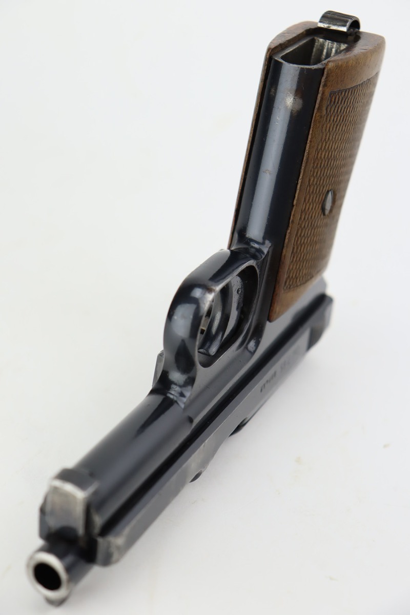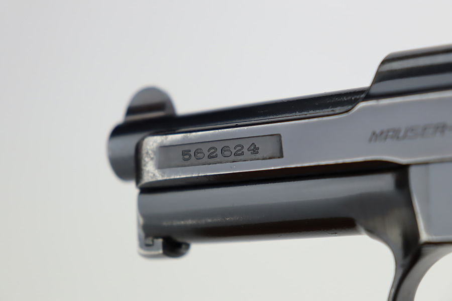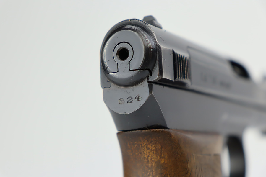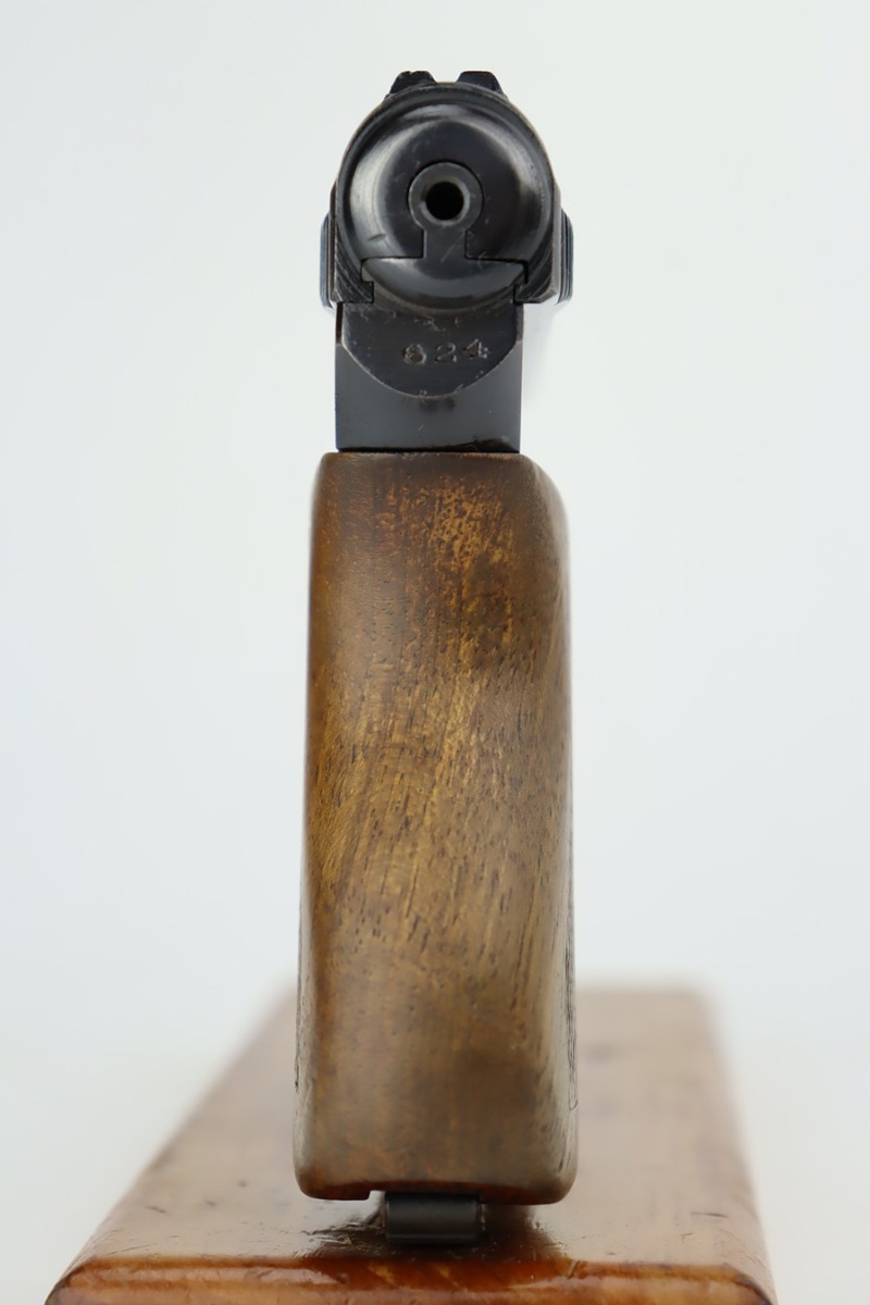 9/6/23 – This is a very nice example of a Mauser Model 1934 sold in the commercial market in the late 1930’s. It is all matching and “Double Crown U” proofed. It has retained about 90-92% of its original high polish finish. There are areas of wear around the muzzle, along both sides of the slide, and on the front strap. Fitted with a nice period-correct wood grip and a post-war magazine. Stone-mint bore.