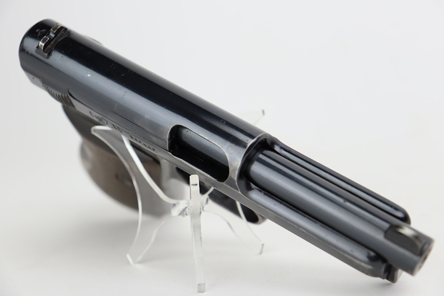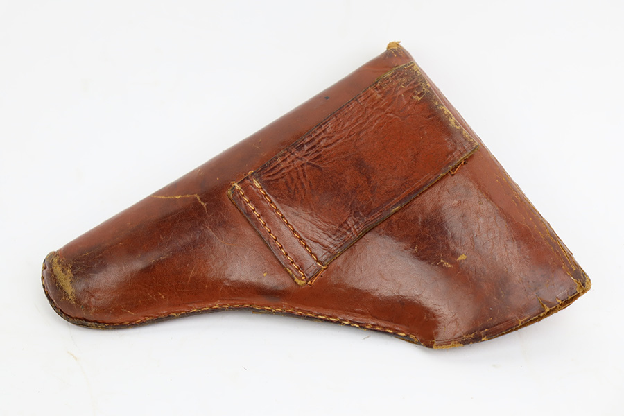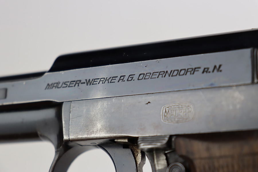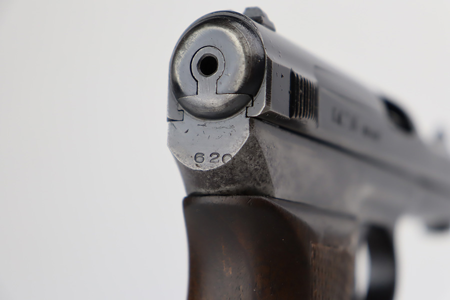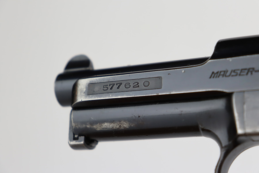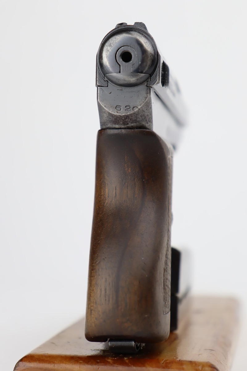 9/25/23 – This is a nice example of a Mauser Model 1934 sold in the commercial market around 1940. It is all matching and properly “Eagle N” proofed. It comes as a rig with a period-correct tan leather holster and two magazines (one is reproduction). The gun itself has retained roughly half of its original high polish finish. There are areas of splotchy wear, most obvious on the frame (where there is also some pin-pricking). Fitted with a period-correct wood grip – tiny chip in the bottom left corner. The bore has good rifling, but there is pin-pricking throughout.