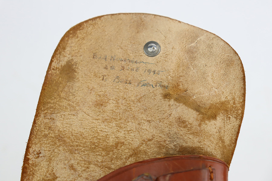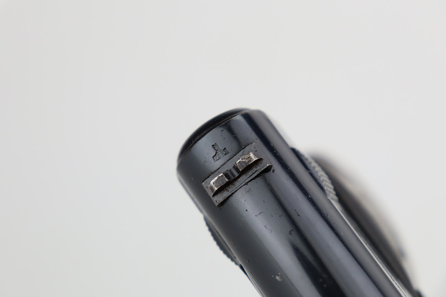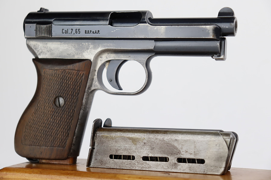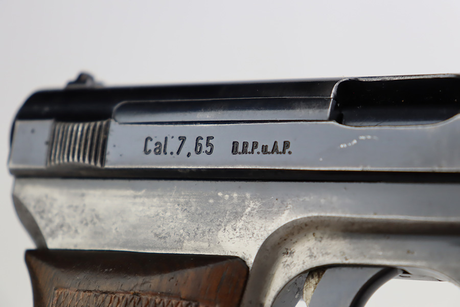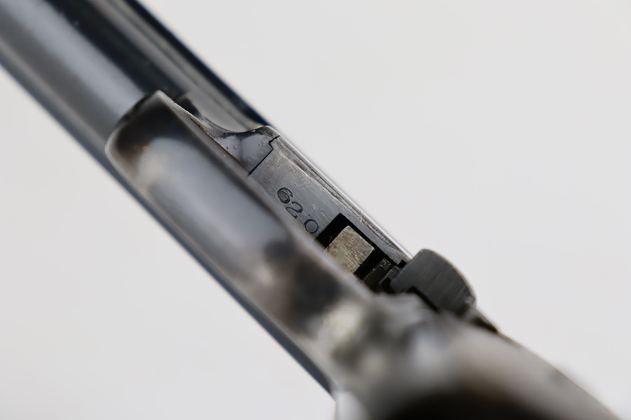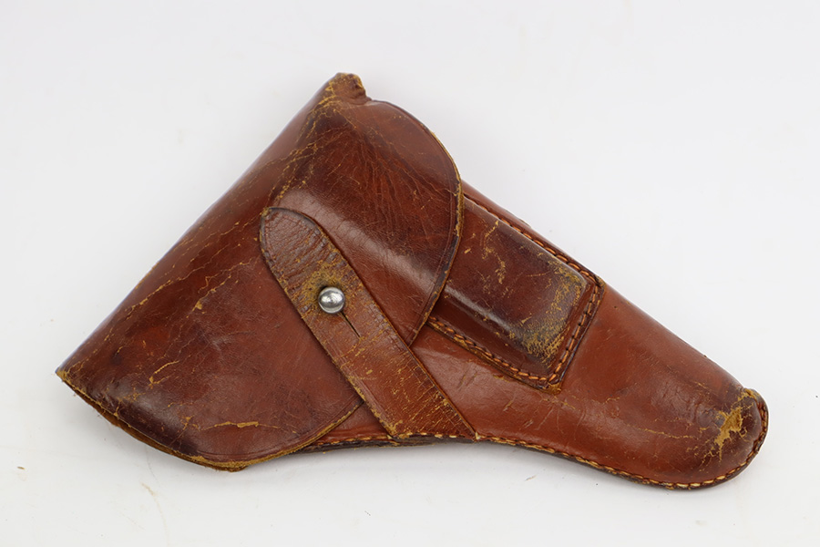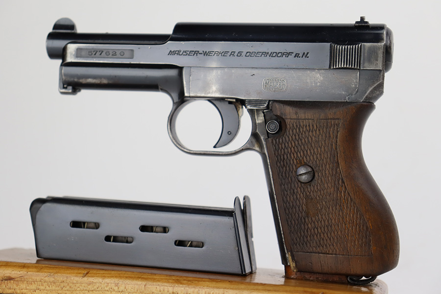 9/25/23 – This is a nice example of a Mauser Model 1934 sold in the commercial market around 1940. It is all matching and properly “Eagle N” proofed. It comes as a rig with a period-correct tan leather holster and two magazines (one is reproduction). The gun itself has retained roughly half of its original high polish finish. There are areas of splotchy wear, most obvious on the frame (where there is also some pin-pricking). Fitted with a period-correct wood grip – tiny chip in the bottom left corner. The bore has good rifling, but there is pin-pricking throughout.