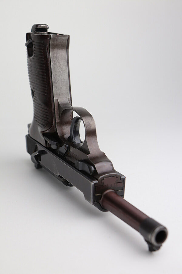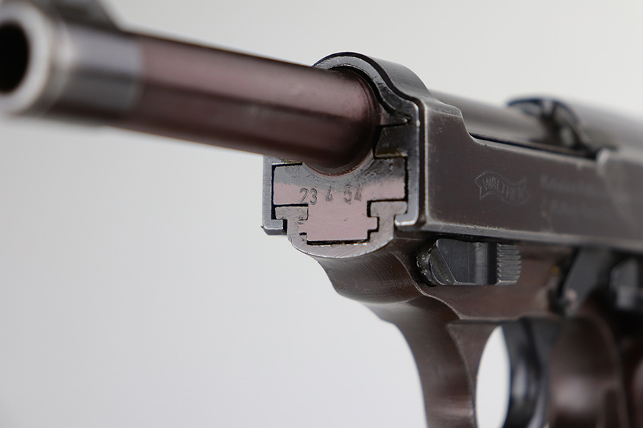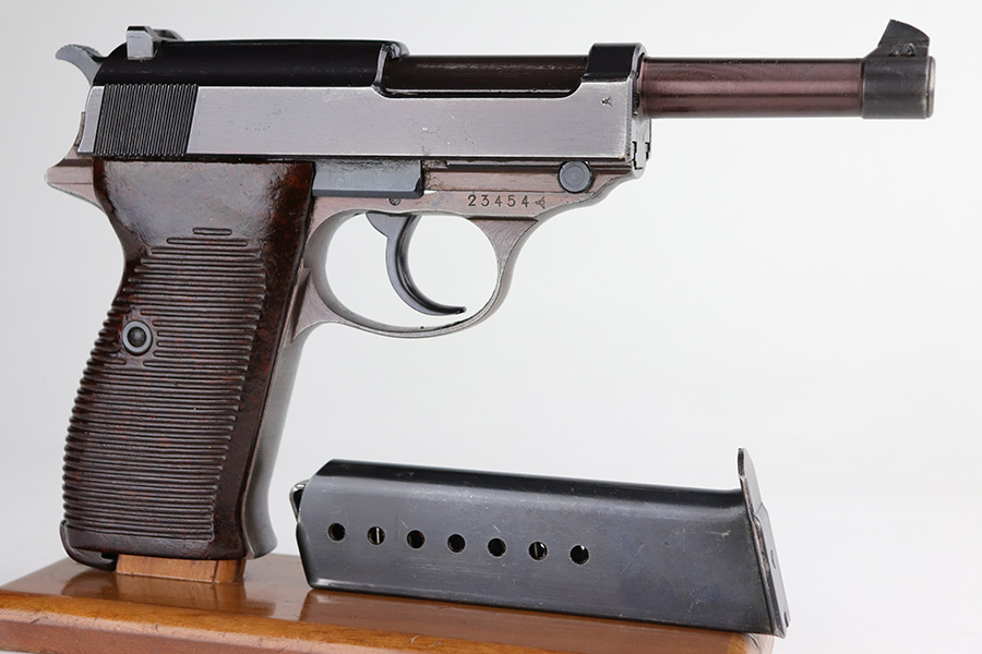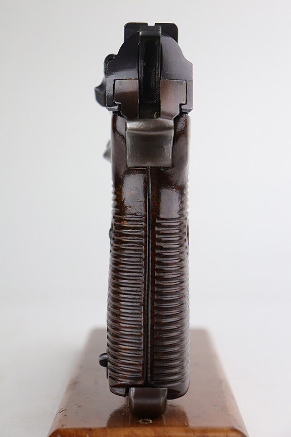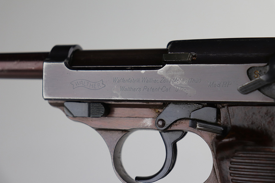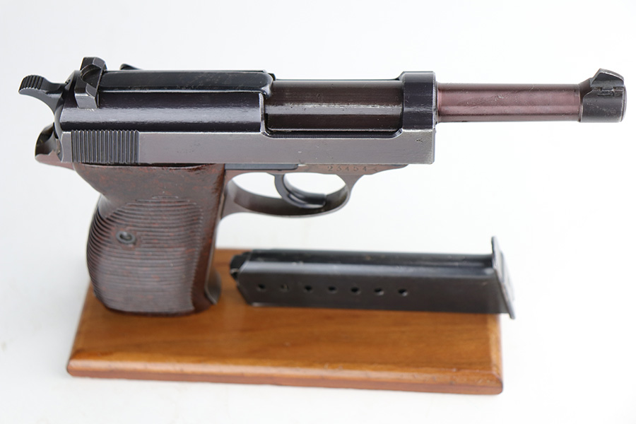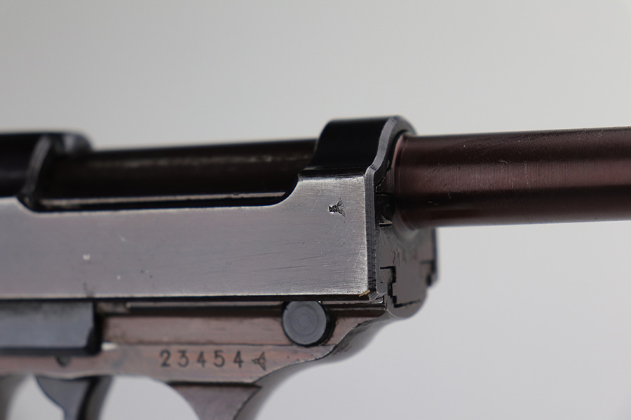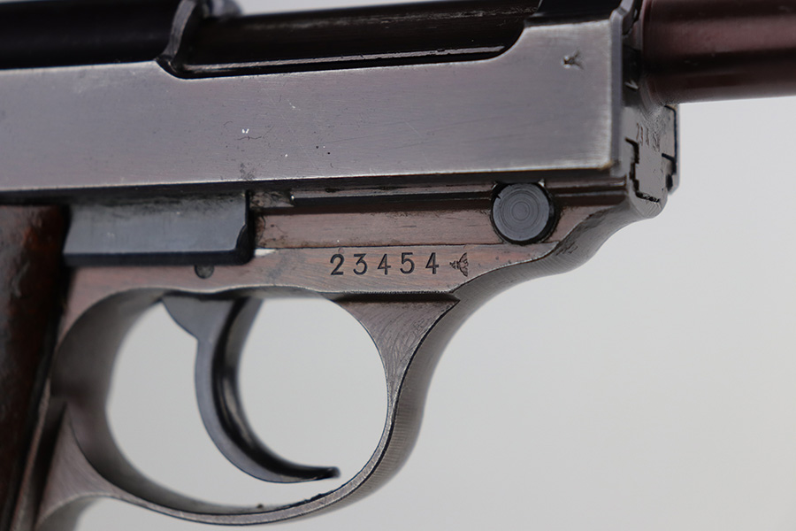 9/10/21 – This is a very nice example of a scarce commercial Mod HP made during WW2. It is all matching and has the proper “Eagle N” commercial proofs. The whole gun has a really nice plumb color to it. It has retained about 90% of this original finish. Most of the wear is on the front strap. There is also very minor wear on the high edges of the slide and around the muzzle. An area of splotchy discoloration on the left side of the slide. One small area of minor pitting on the underside of the frame. Comes with excellent reddish grips and a period-correct magazine. The magazine is not waffen-proofed. Minty bore. De-cocker is functional.
