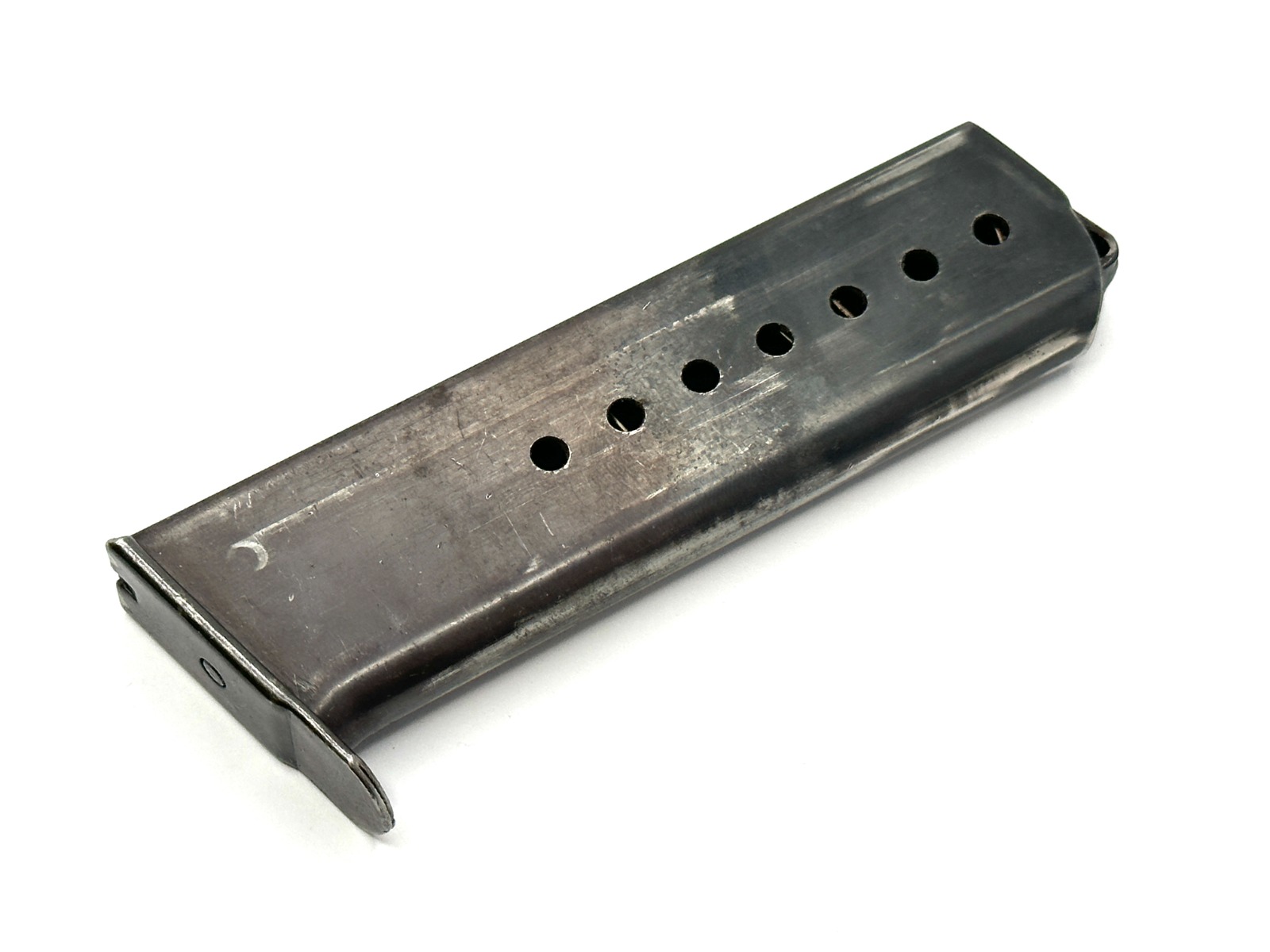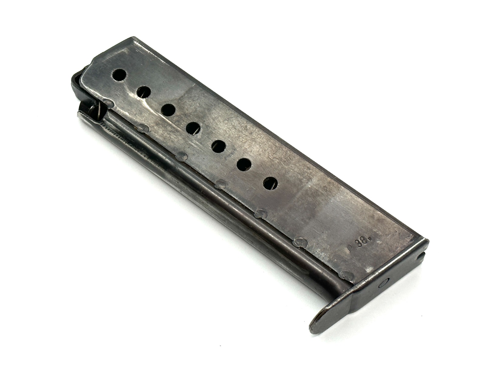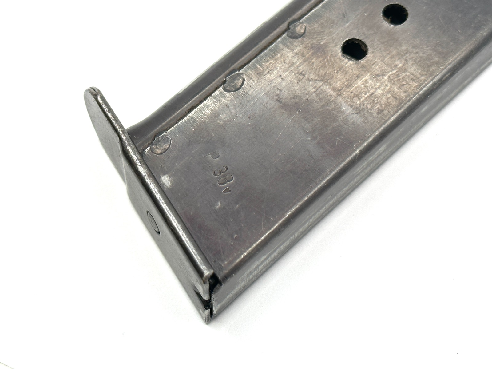 8/14/23 – This is a good condition Walther P.38v commercial magazine. This magazine retains about 70% of its original bluing finish, showing wear on the spine and front spine despite the strong spring’s excellent retention and butter-smooth operation. On the bottom left side of the tube is stamped P.38v. The spine has no markings or stamps.