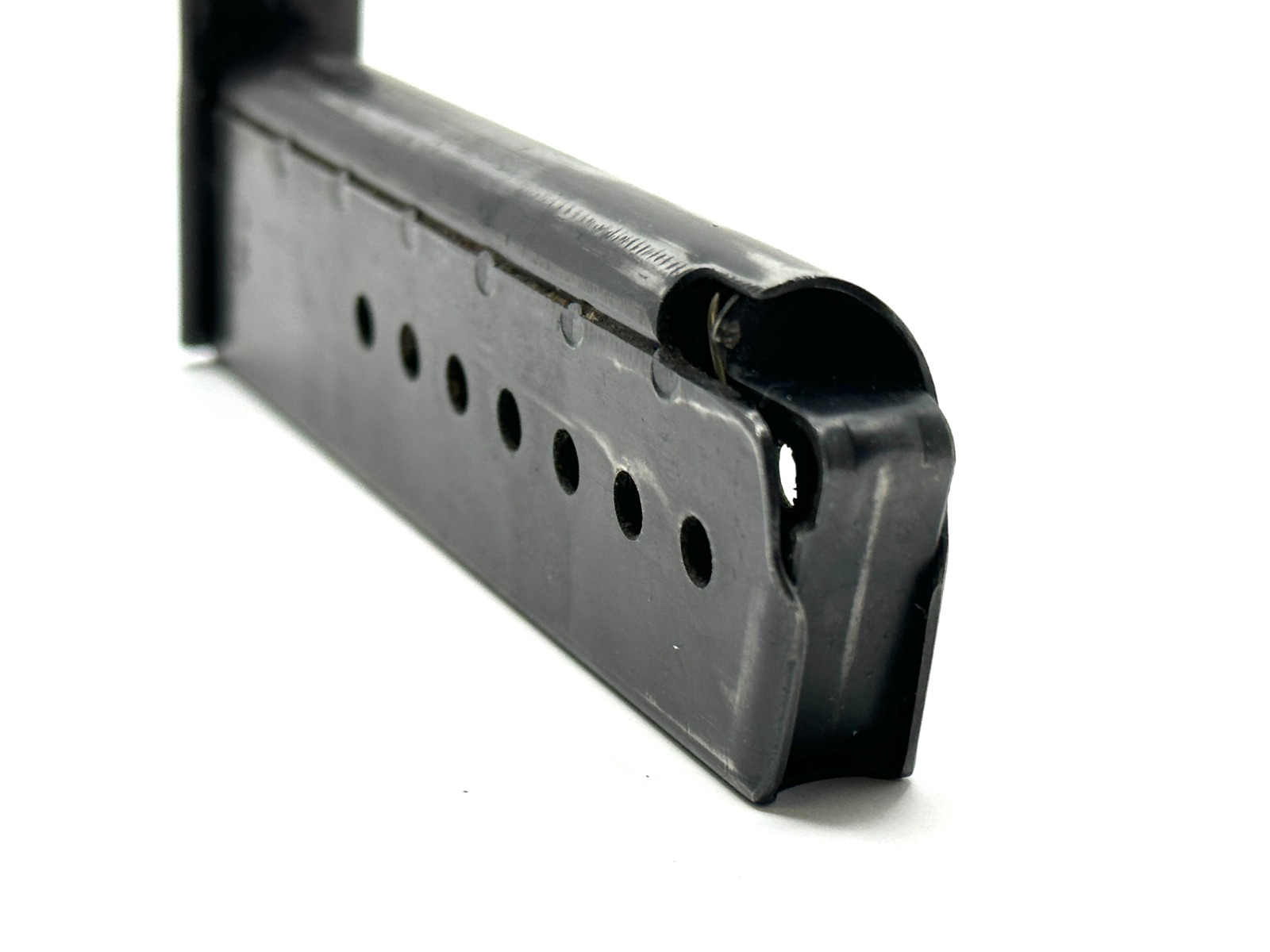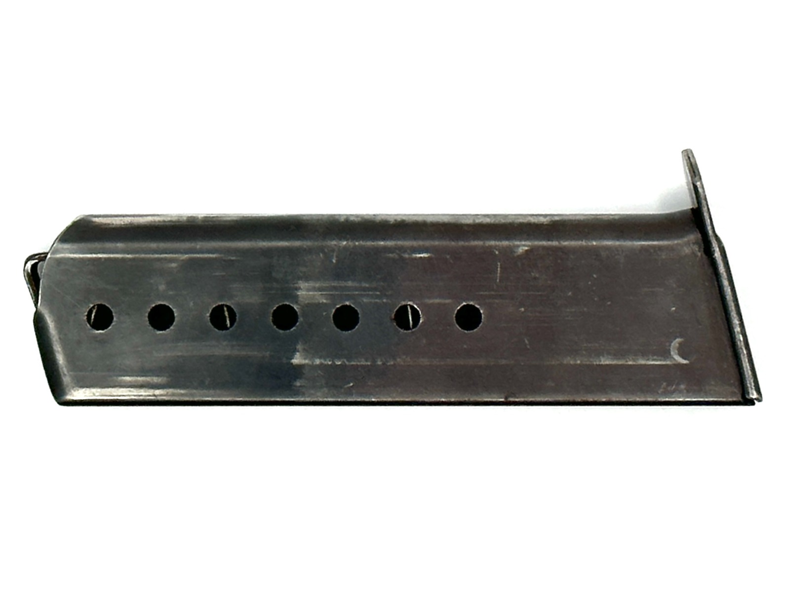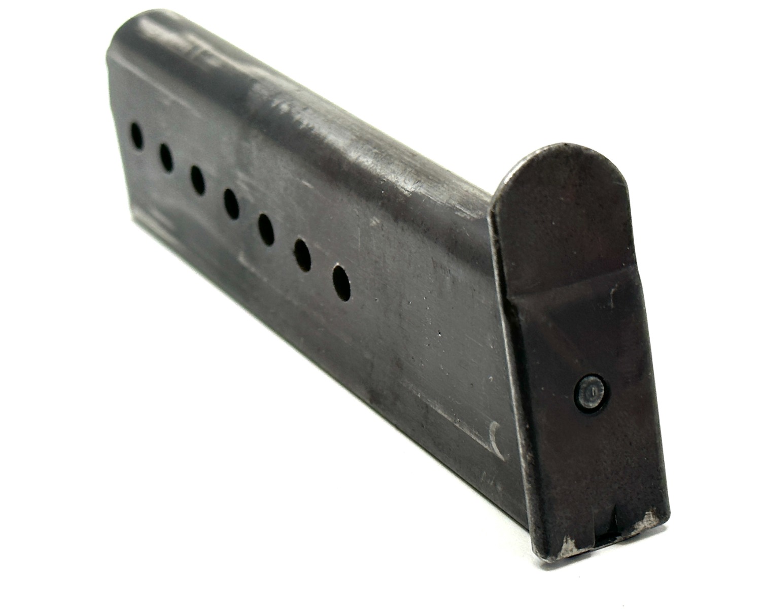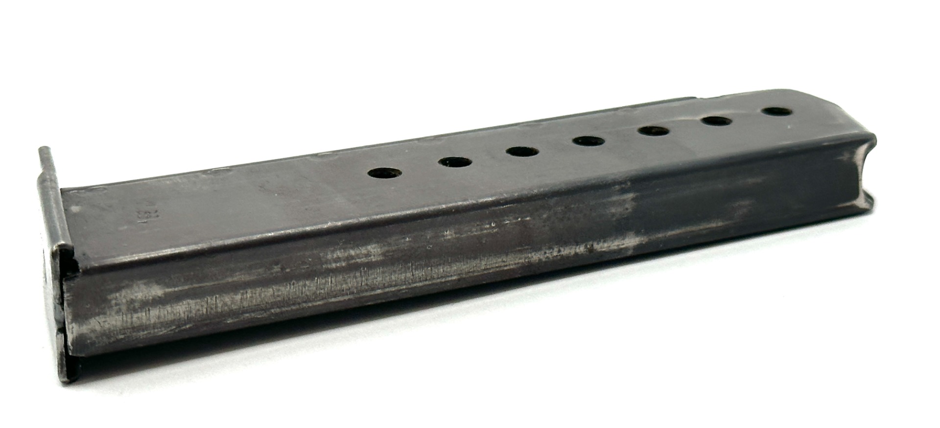 8/14/23 – This is a good condition Walther P.38v commercial magazine. This magazine retains about 70% of its original bluing finish, showing wear on the spine and front spine despite the strong spring’s excellent retention and butter-smooth operation. On the bottom left side of the tube is stamped P.38v. The spine has no markings or stamps.