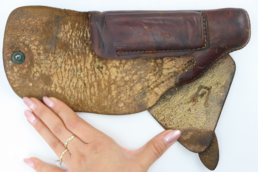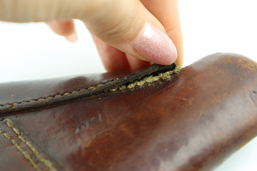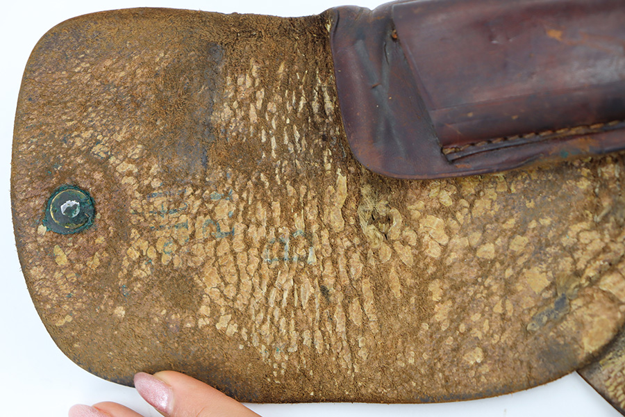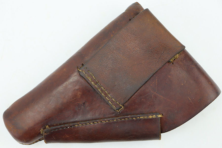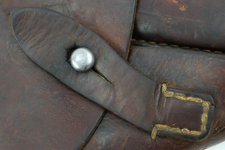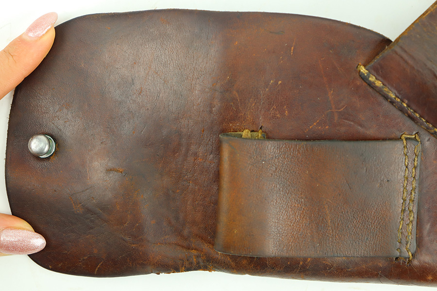 1/2/24 – This is an unmarked commercial style holster for a Walther PPK or similar sized 7.65mm Axis pistol. The style is correct and similar to other WW2 examples we’ve encountered. The holster shows normal use wear and typical pliability throughout. The leather is all original and intact, as is the stitching. Aluminum closure stud. Some light scuffs throughout the exterior leather.