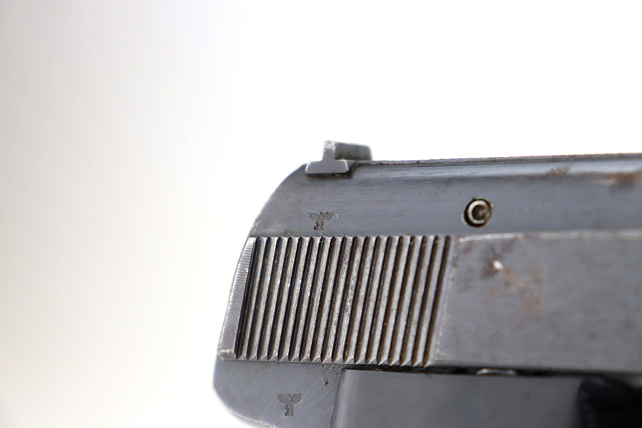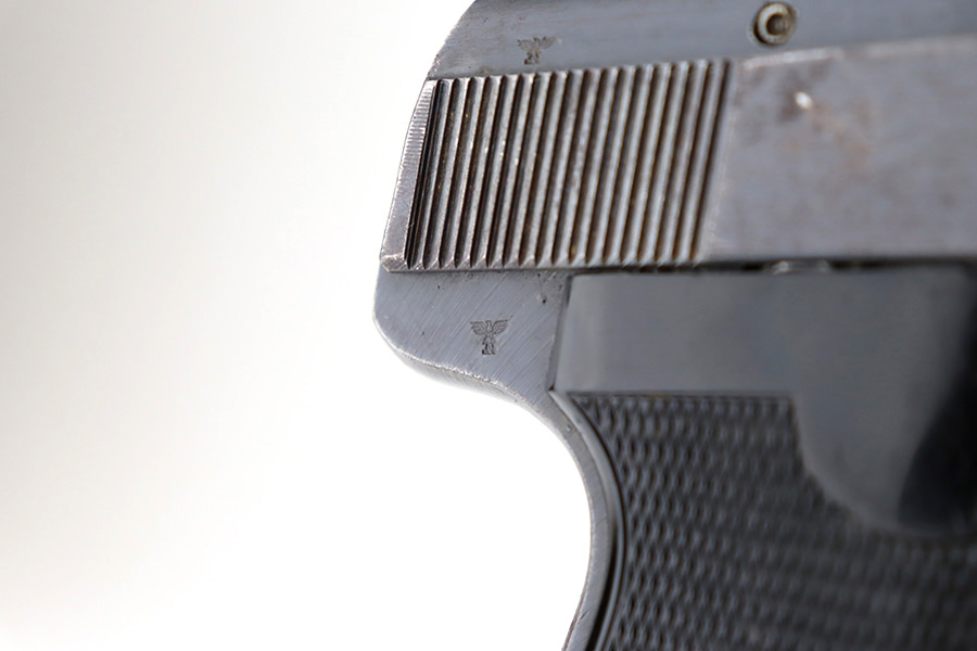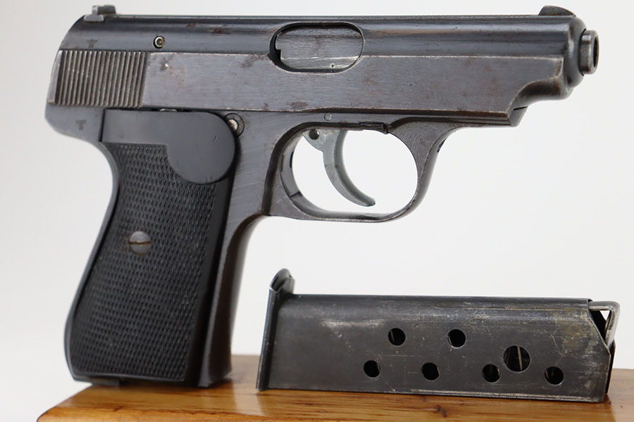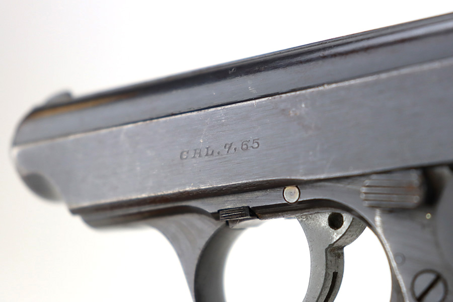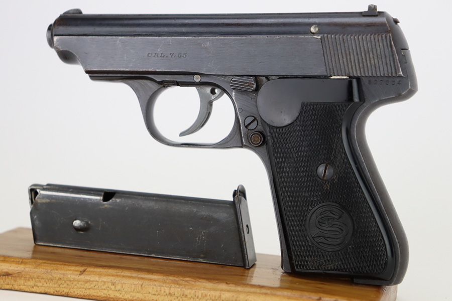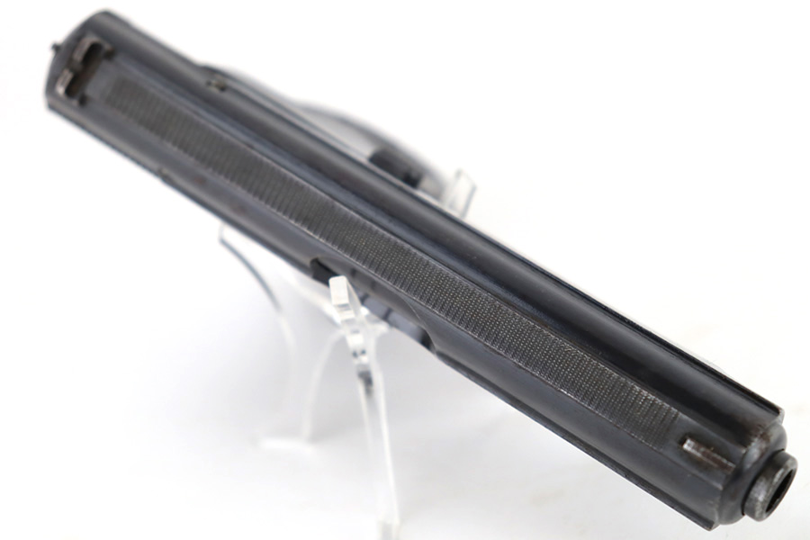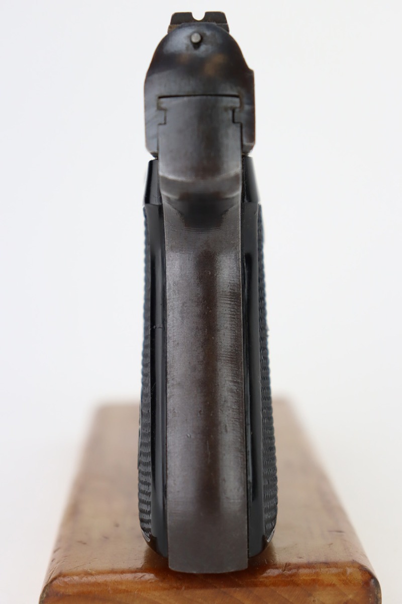 12/13/23 – This is a very nice Sauer 38h sold in the commercial market during WW2. All matching and “Eagle N” proofed with no military markings. The original finish rates about 97% with very minor high edge wear. While there is very little actual finish loss, there are tiny handling marks on the right side of the slide and areas of spotty oxidation on the left side of the gun and on the grip straps. Fitted with nice period-correct black bakelite grips and comes with one half-moon magazine. Mint bore.