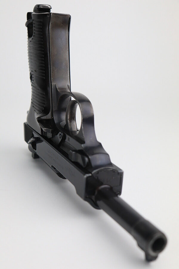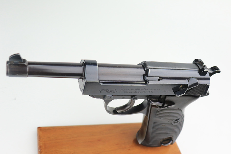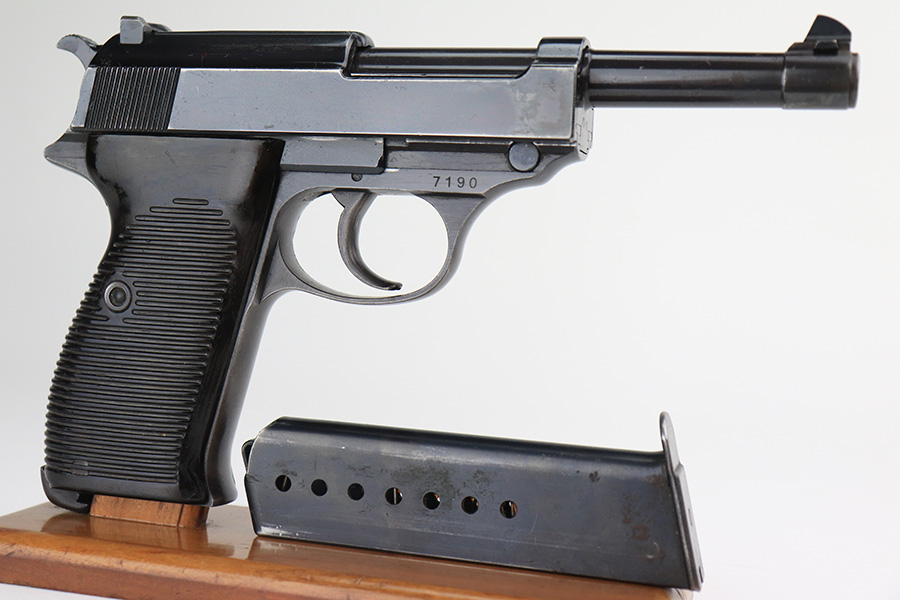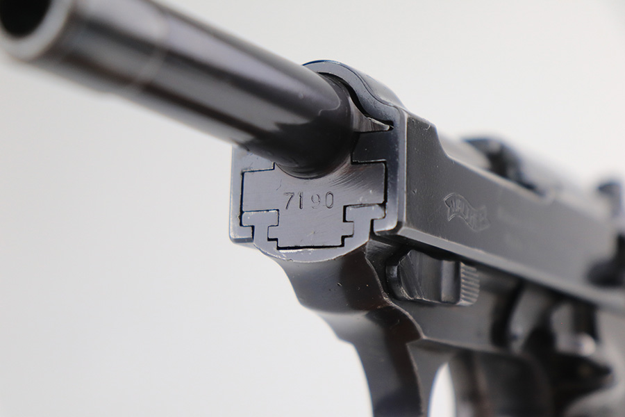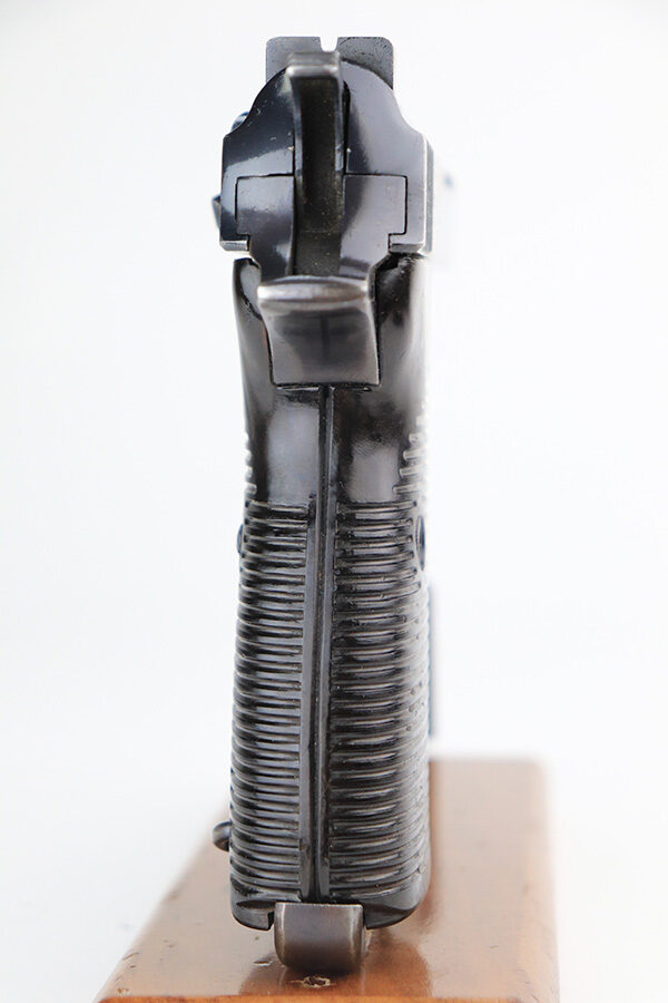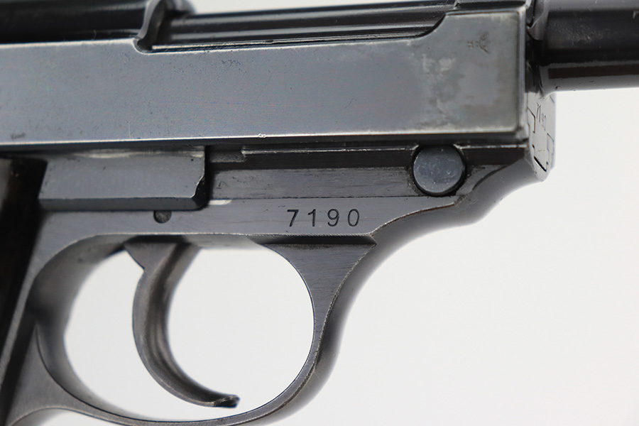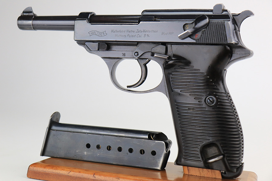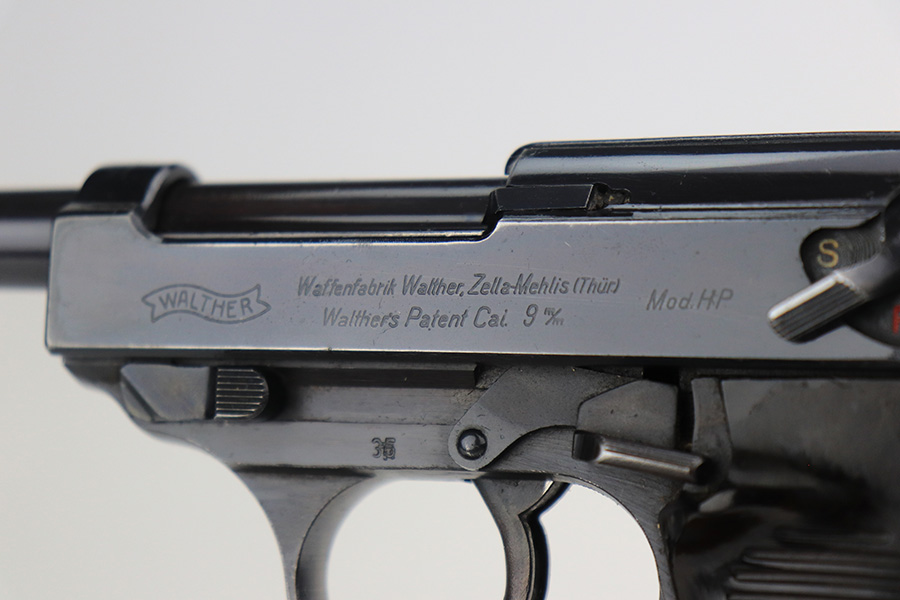 12/13/21 – This is a very nice example of a Walther Mod HP sold in the commercial market around 1940. It is all matching and has the proper “Eagle N” commercial proofs. It has retained about 93-94% of its high polish finish. There is very minor wear around the high edges of the slide and around the muzzle. An area of discoloration around the very front edge of the right side of the slide. There is thinning and very minor patina on the front strap. There are some tiny handling marks/light scratches on the barrel and underside of the trigger guard. Comes with period-correct bakelite grips and a properly un-marked commercial magazine. The bore is vey shiny with strong rifling and some areas of minor freckling.