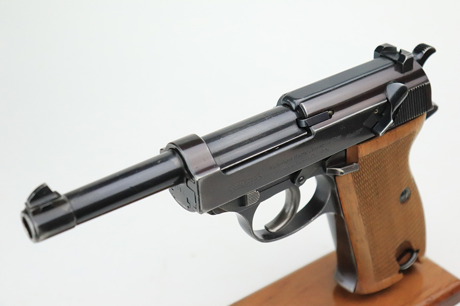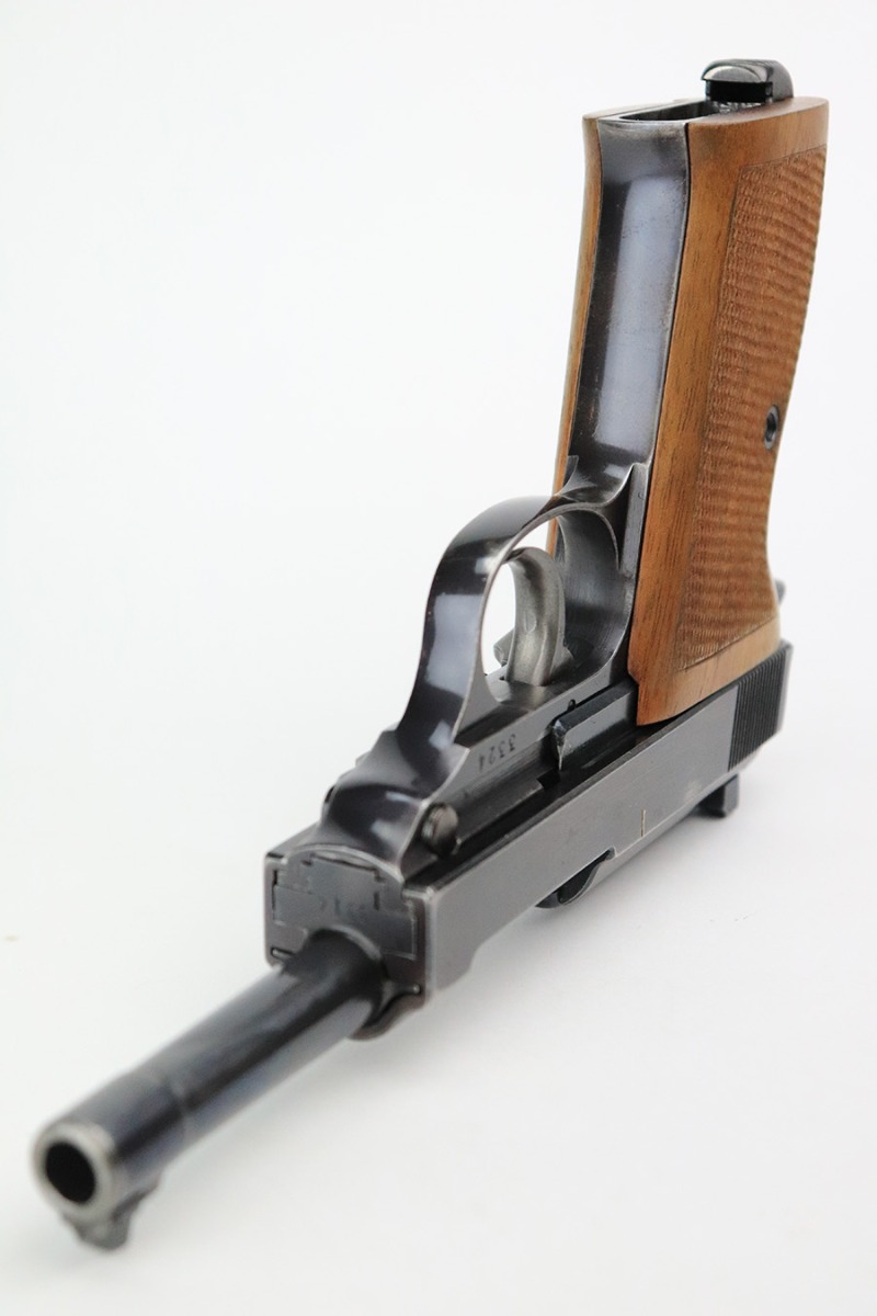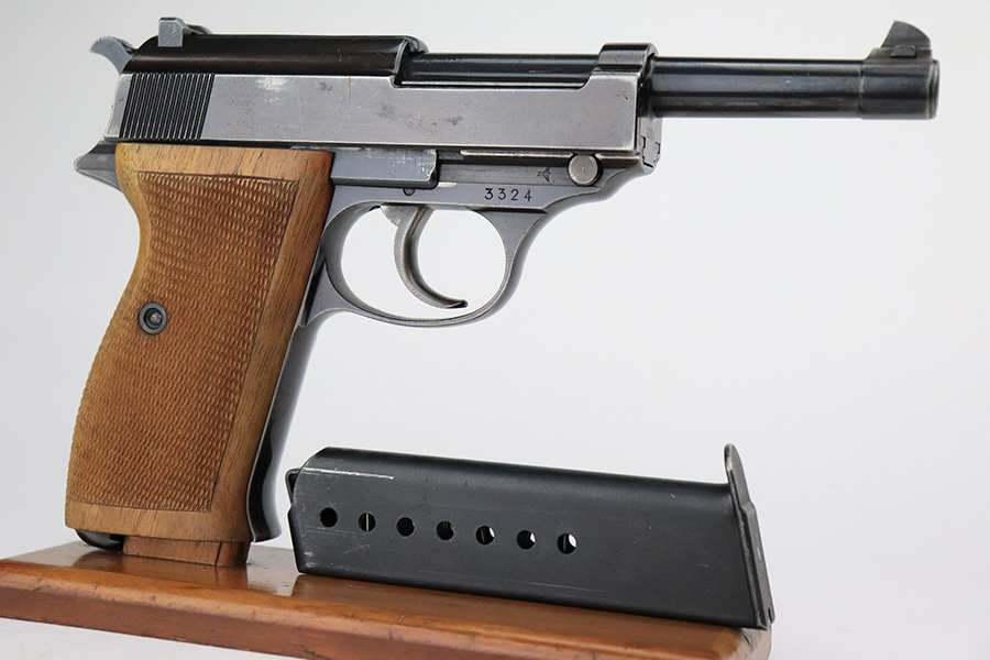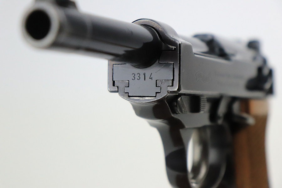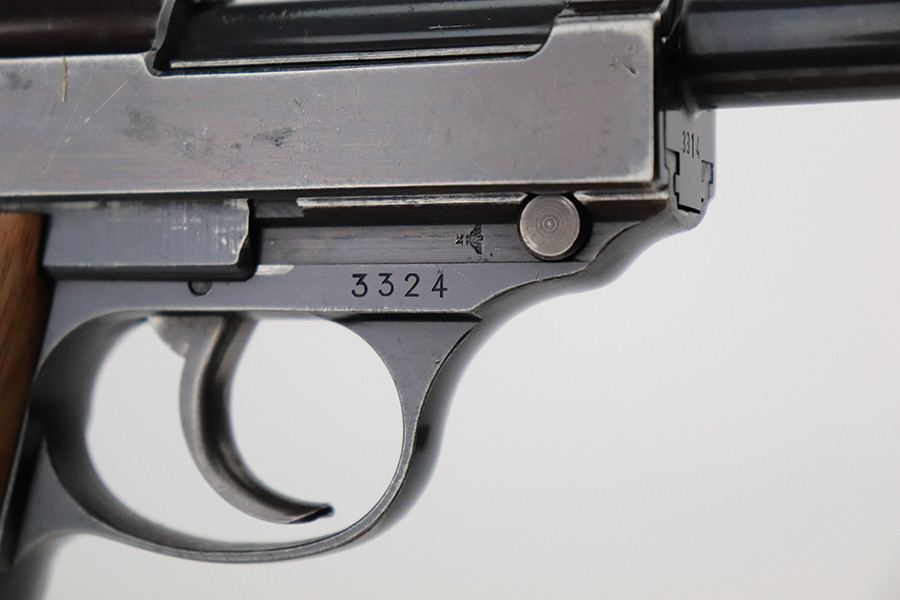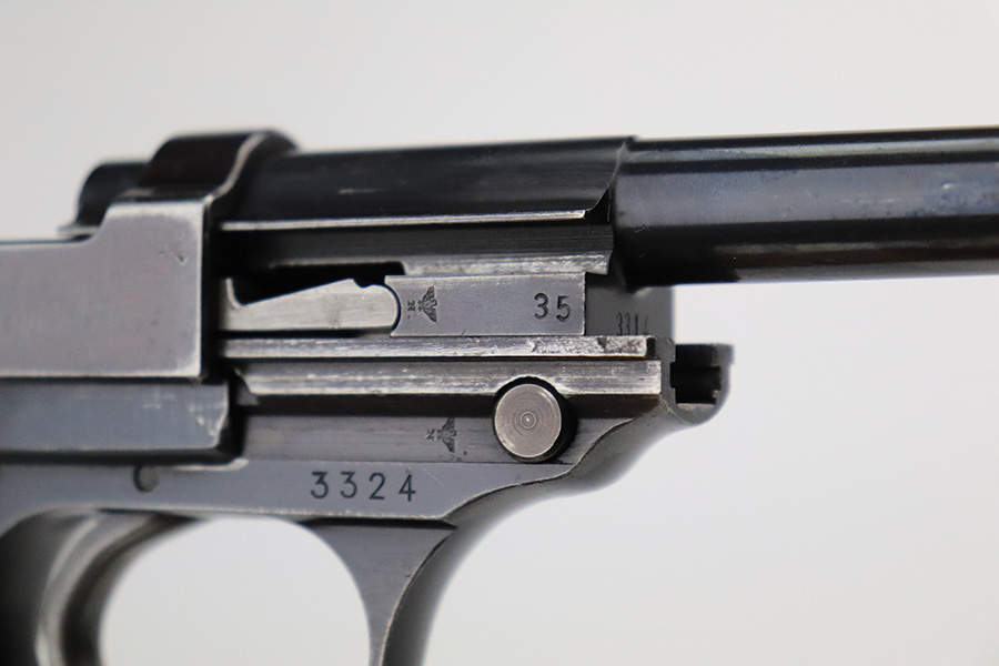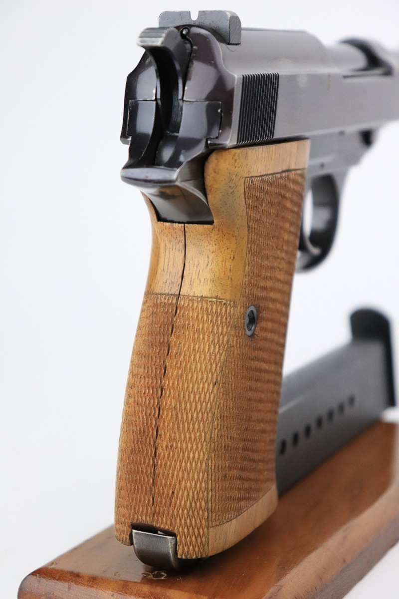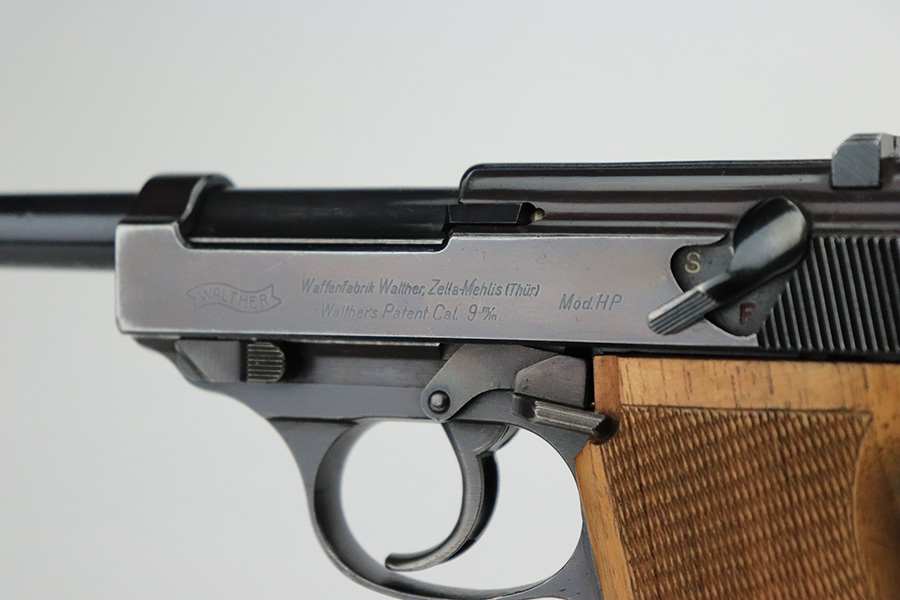 7/19/22 – This is an excellent example of a Walther Mod HP sold in the commercial market in about 1940. The gun is entirely mismatched, has the proper “Eagle N” commercial proofs, and has retained about 94-95% of its original high polish finish. Slight plumb color to the bluing. Generally, there is minor wear around the high edges, light scratchy wear along the right side of the slide, and very minor thinning on the front strap. There are some tiny scratches along the barrel as well. Comes with a set of excellent post-war wood grips and an un-marked magazine. Minty bore. The de-cocker works sporadically.