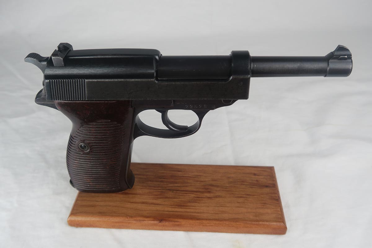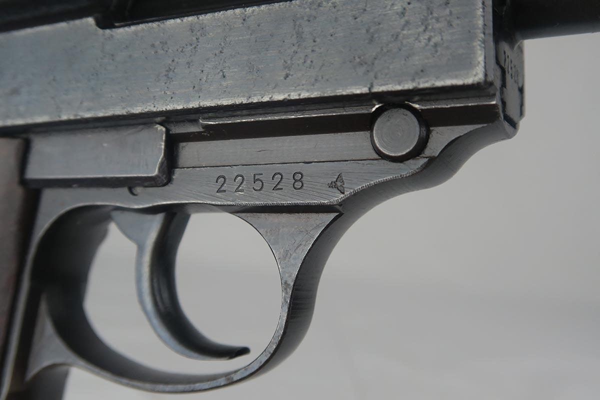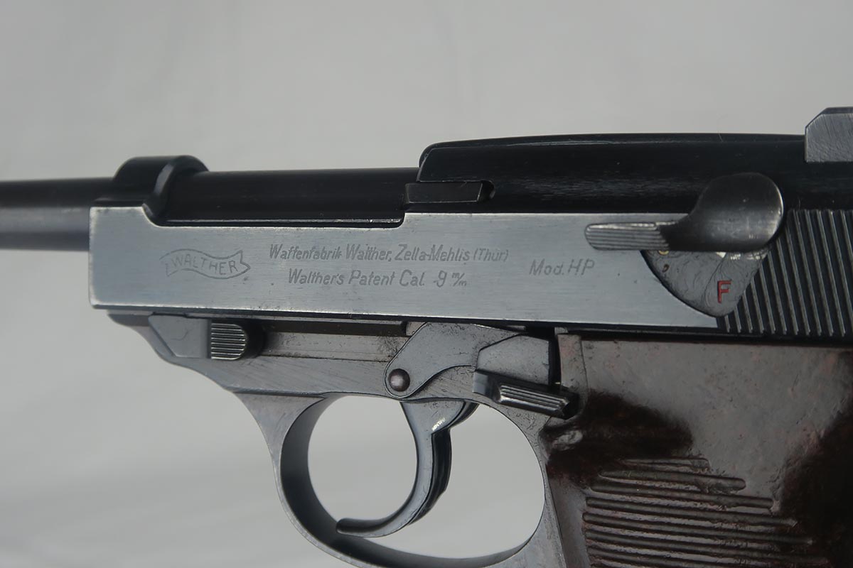 8/8/17 – This is a commercially issued Walther Model HP P.38 from the Nazi era. It is all original and matching with about 95% bluing remaining. There is some finish loss near the muzzle and front edges of the slide, and some thinning on the right side of the slide. Frame and slide are Eagle/N proofed. Excellent reddish Walther grips and P.38v marked mag. Excellent bore, as well.