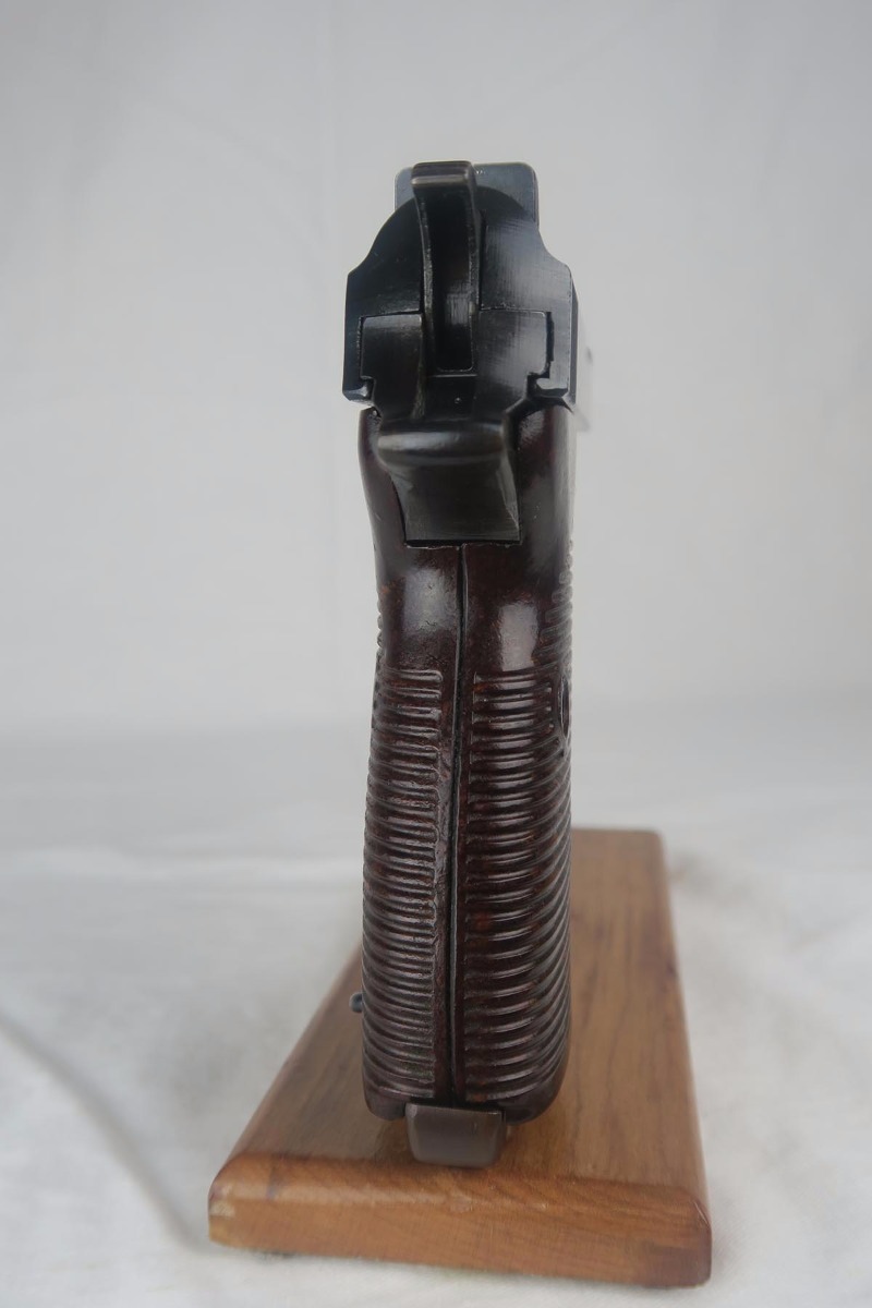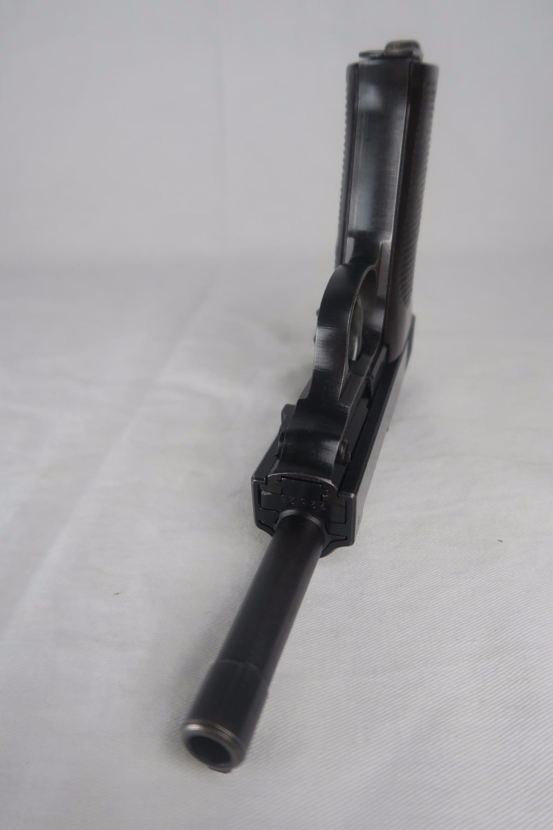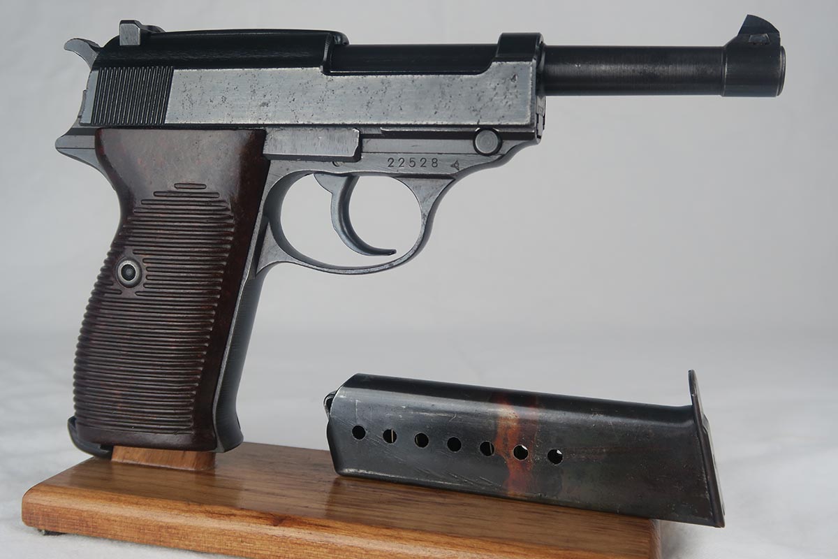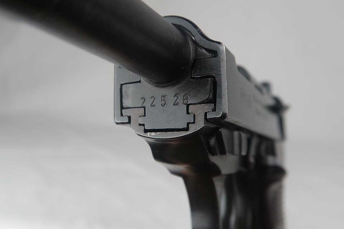 8/8/17 – This is a commercially issued Walther Model HP P.38 from the Nazi era. It is all original and matching with about 95% bluing remaining. There is some finish loss near the muzzle and front edges of the slide, and some thinning on the right side of the slide. Frame and slide are Eagle/N proofed. Excellent reddish Walther grips and P.38v marked mag. Excellent bore, as well.