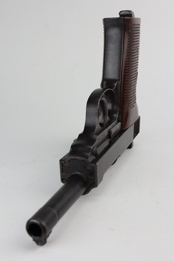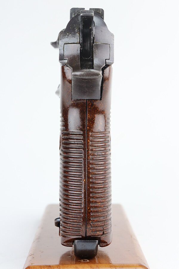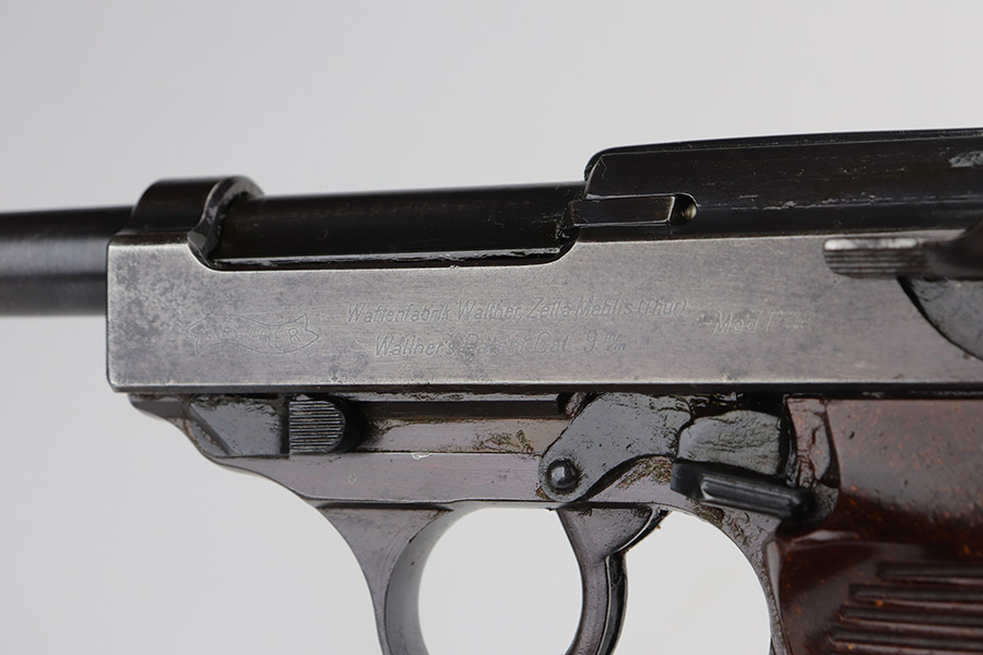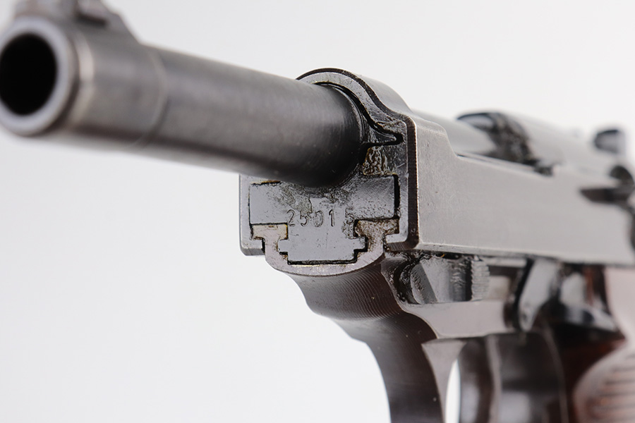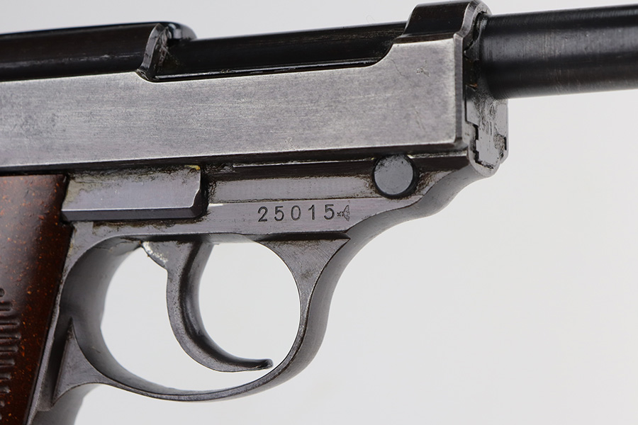 6/11/21 – This is a very nice example of a commercial Walther Mod P.38 manufactured during WW2. The gun is all matching and has the proper “Eagle N” proofs. It has retained about 93% of its original slightly plumb-colored finish. There is very minor thinning on both sides of the slide and minor wear around the muzzle. Spotty oxidation on both sides of the slide. Comes with excellent grips and a period-correct magazine. The bore is mint. De-cocker is functional.