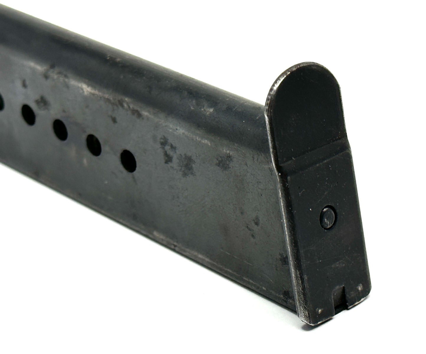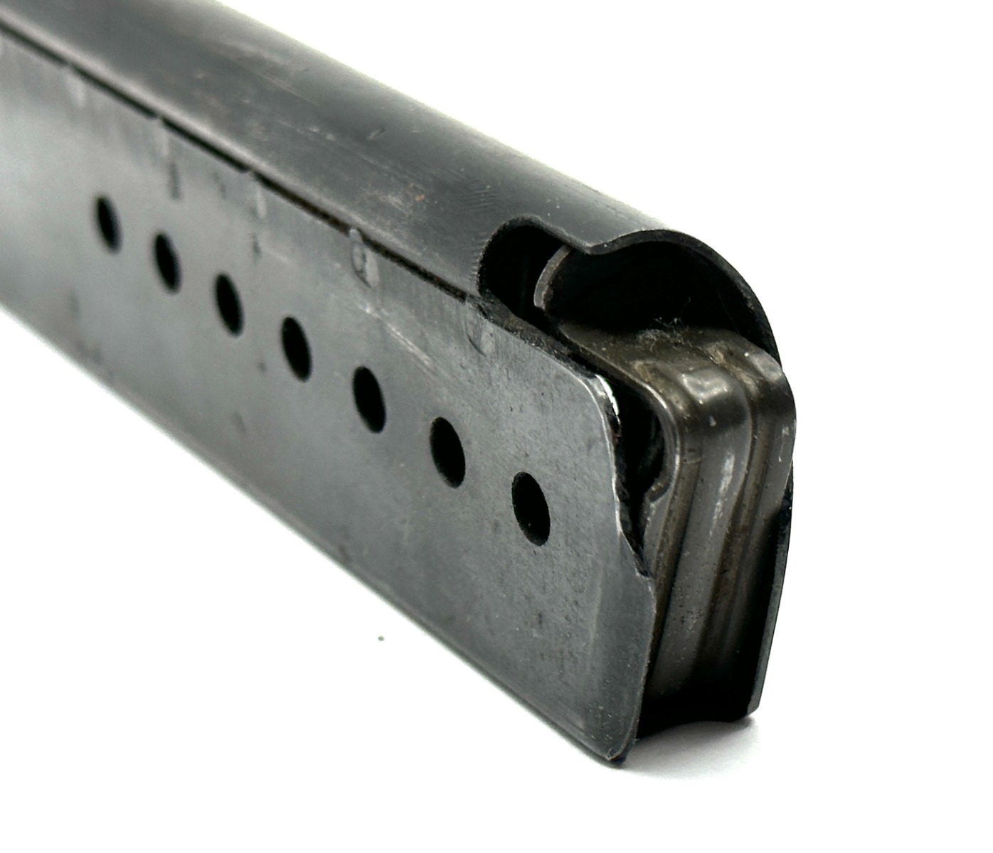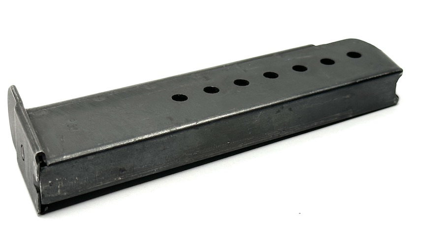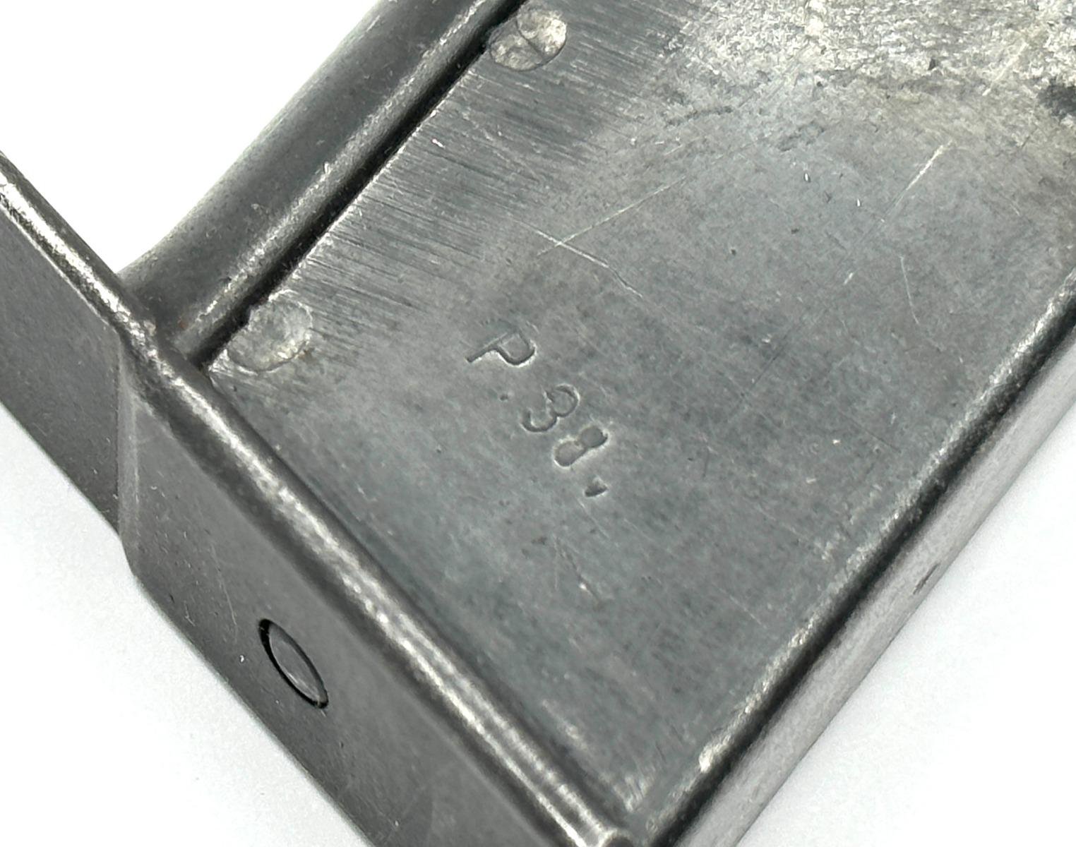 7/18/23 – This is a great condition commercial Walther P.38v Magazine. This magazine is without rust or pitting, retains 90+% of its original bluing finish, and has a strong functional spring. There is only one marking on the bottom left side of the magazine P.38v, with no military acceptance marks/proof marks on the spine.