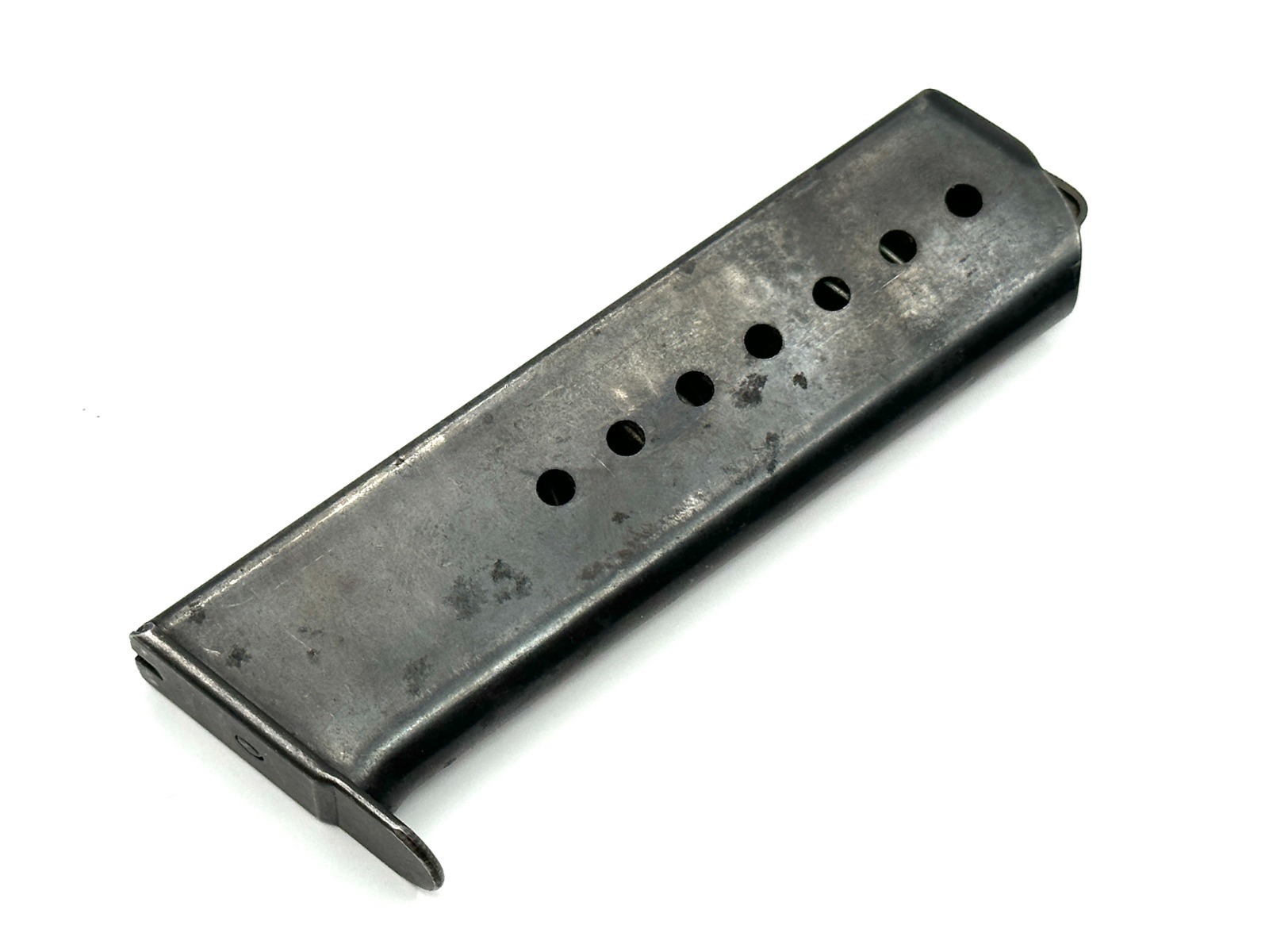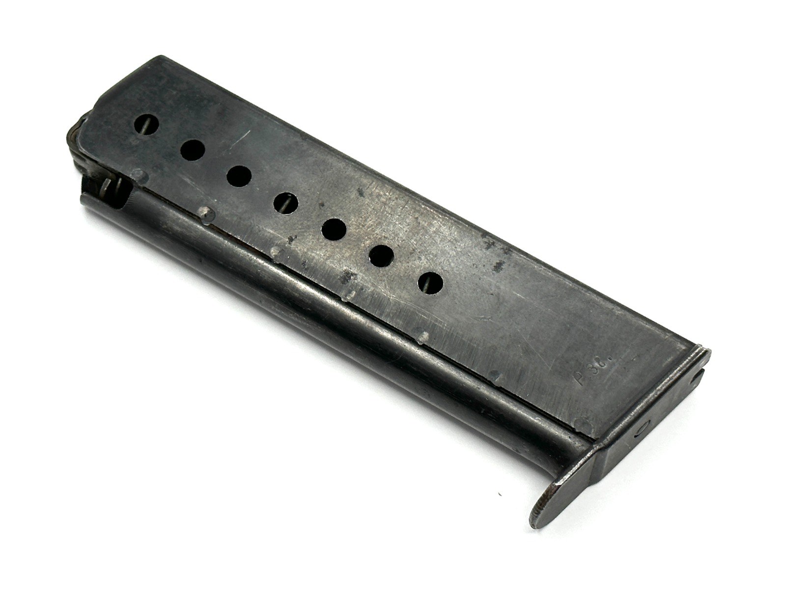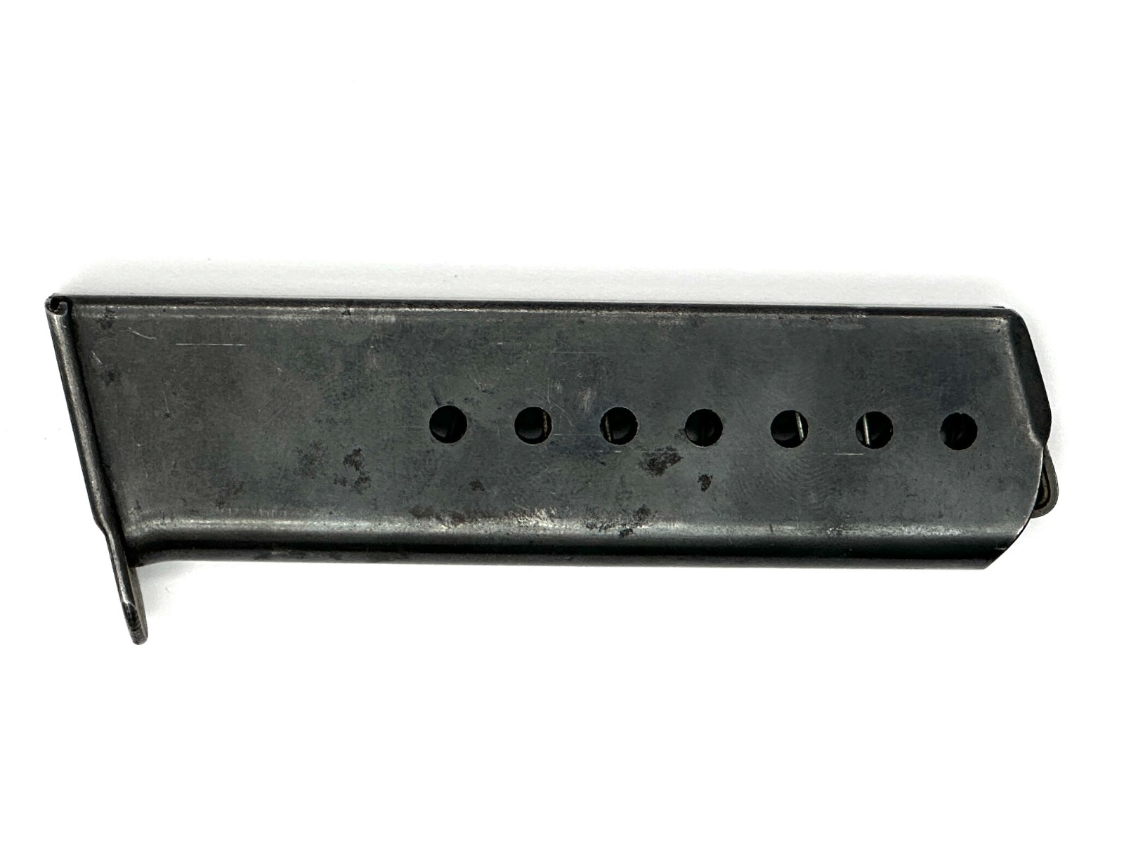 7/18/23 – This is a great condition commercial Walther P.38v Magazine. This magazine is without rust or pitting, retains 90+% of its original bluing finish, and has a strong functional spring. There is only one marking on the bottom left side of the magazine P.38v, with no military acceptance marks/proof marks on the spine.