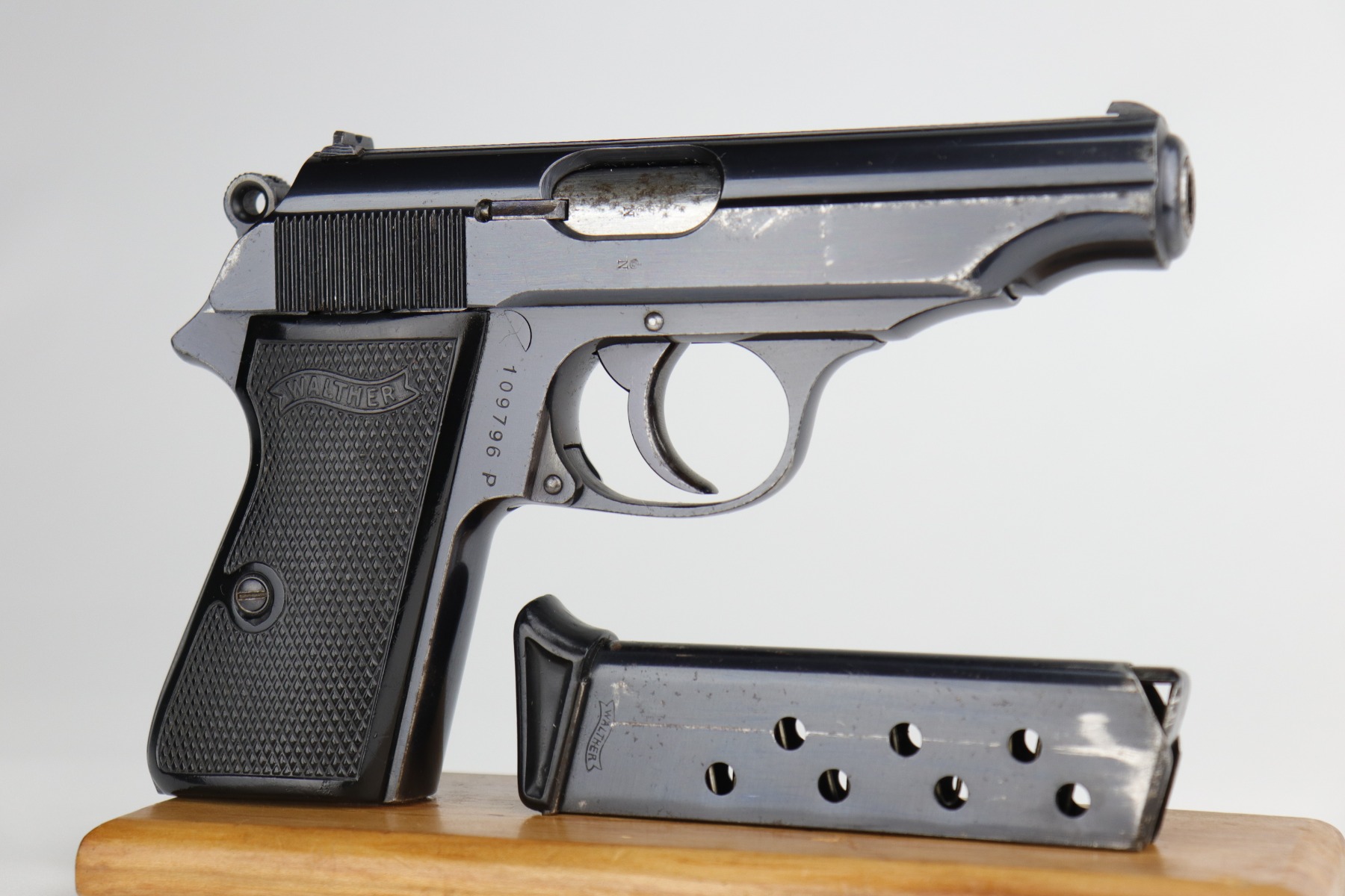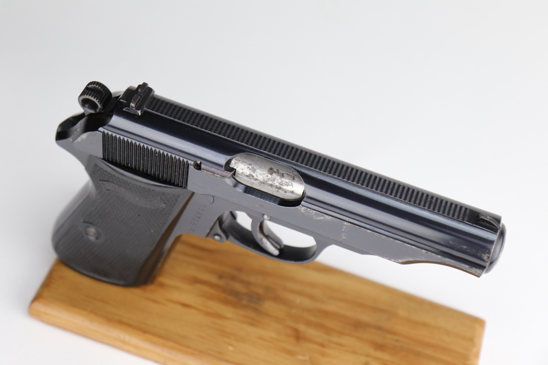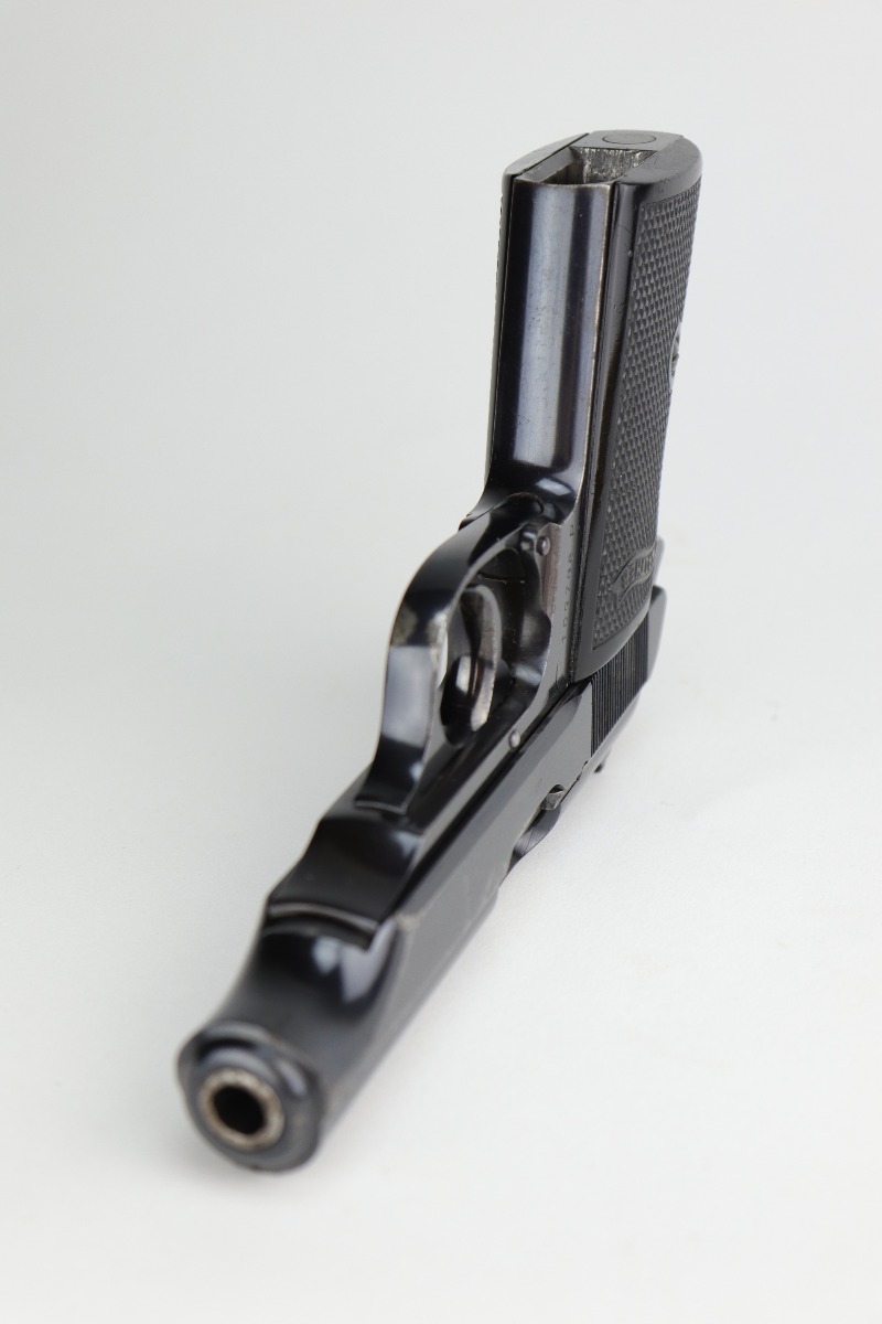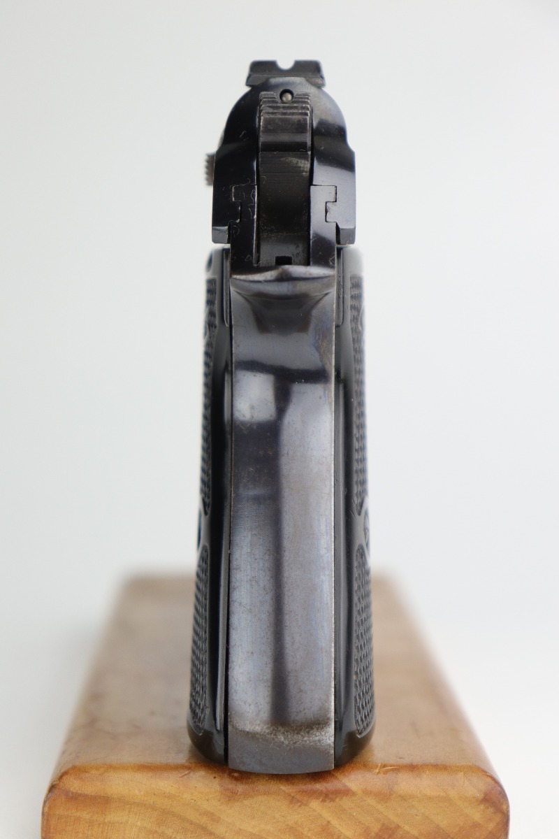 9/17/20 – This is a very nice example of a commercial Walther PP pistol made for the commercial market in 1938. The gun is all matching, has “Crown N” proofs, and comes with a period-correct black finger extension magazine. This pistol has retained about 92% of its original bluing. There are areas of spotty wear and freckling around the muzzle and along the sides of the slide. Small spots of similar wear at the back of the slide and on the underside of the trigger guard. There is minor freckling and tiny scratches on the straps. There is a spot of wear at the base of the back strap. The bore is shiny with very good rifling. The gun is fully functional. Comes with excellent period-correct grips.