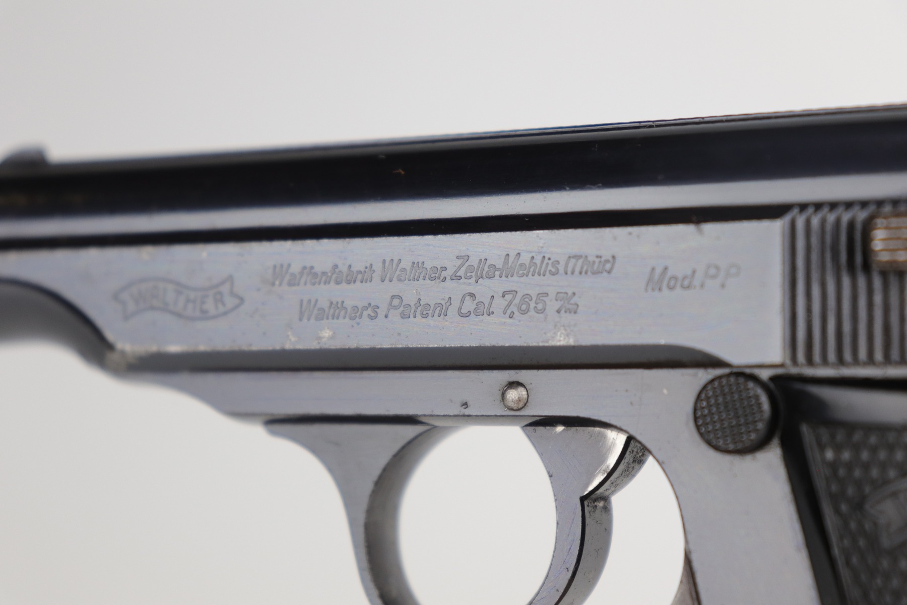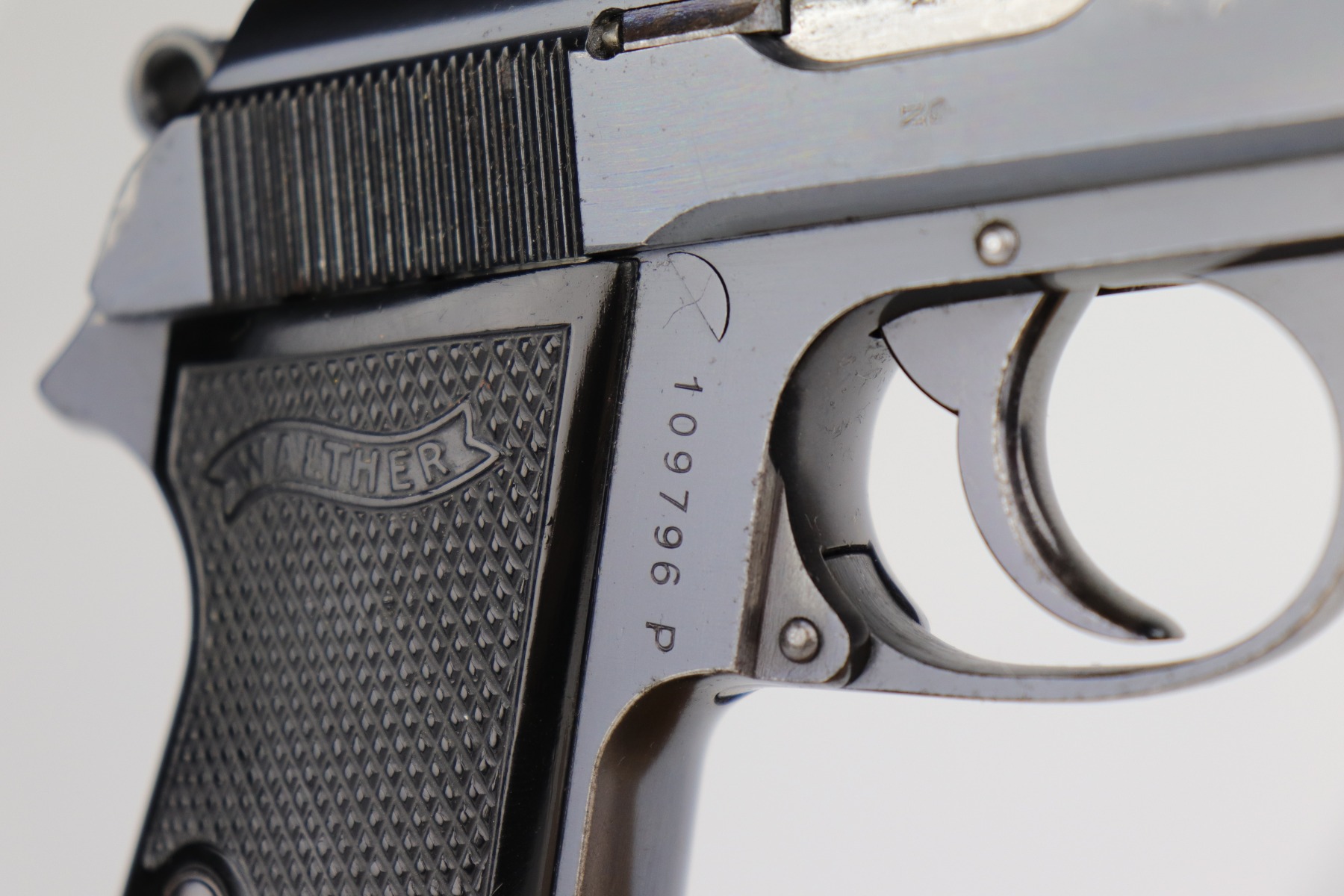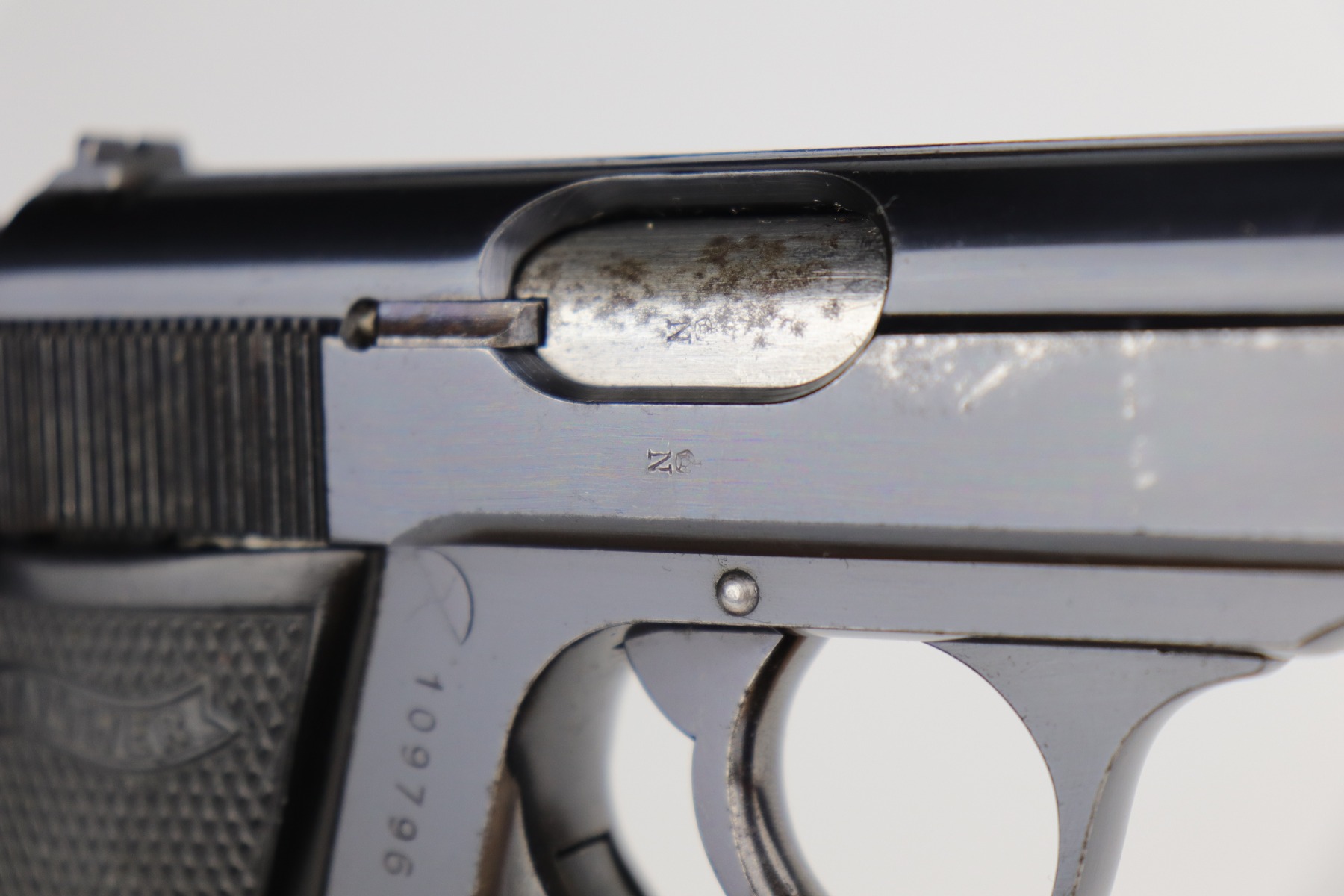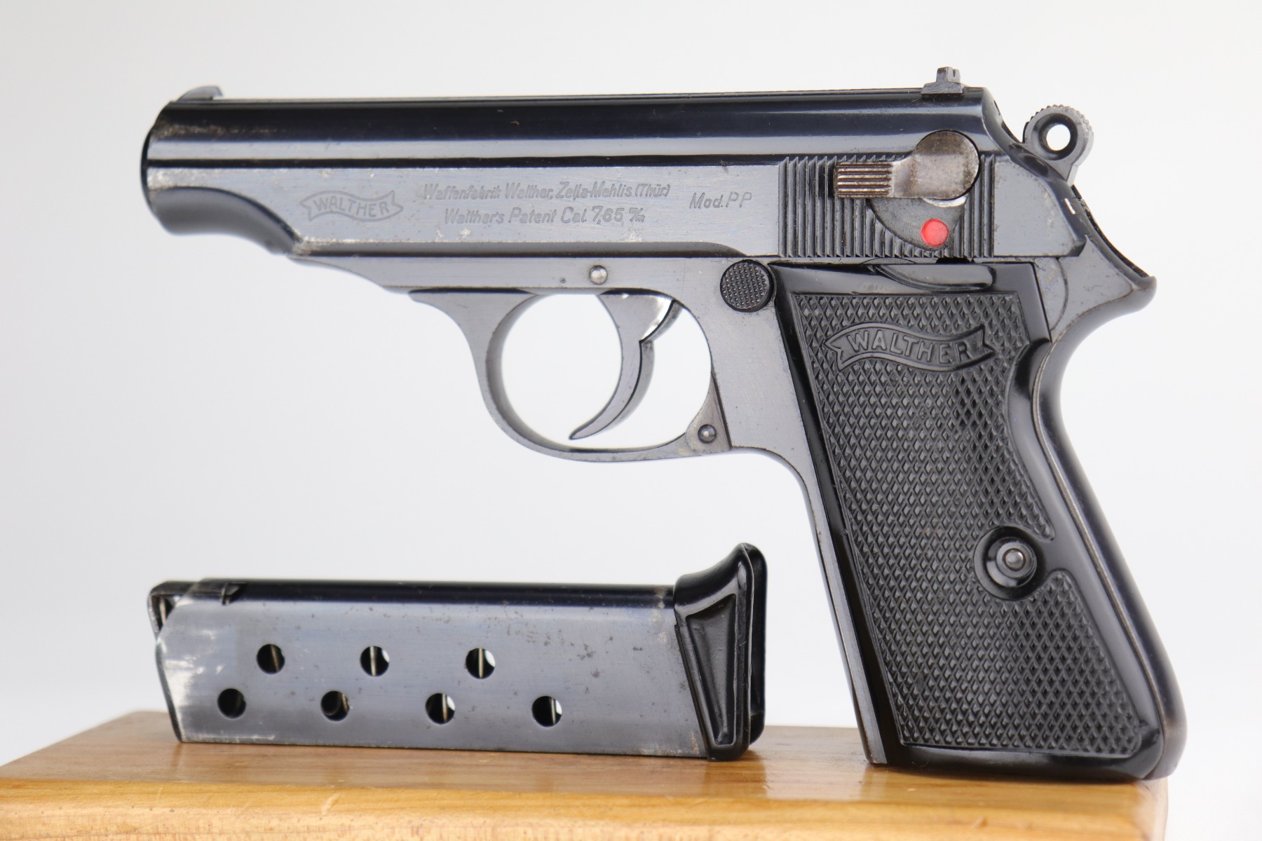 9/17/20 – This is a very nice example of a commercial Walther PP pistol made for the commercial market in 1938. The gun is all matching, has “Crown N” proofs, and comes with a period-correct black finger extension magazine. This pistol has retained about 92% of its original bluing. There are areas of spotty wear and freckling around the muzzle and along the sides of the slide. Small spots of similar wear at the back of the slide and on the underside of the trigger guard. There is minor freckling and tiny scratches on the straps. There is a spot of wear at the base of the back strap. The bore is shiny with very good rifling. The gun is fully functional. Comes with excellent period-correct grips.