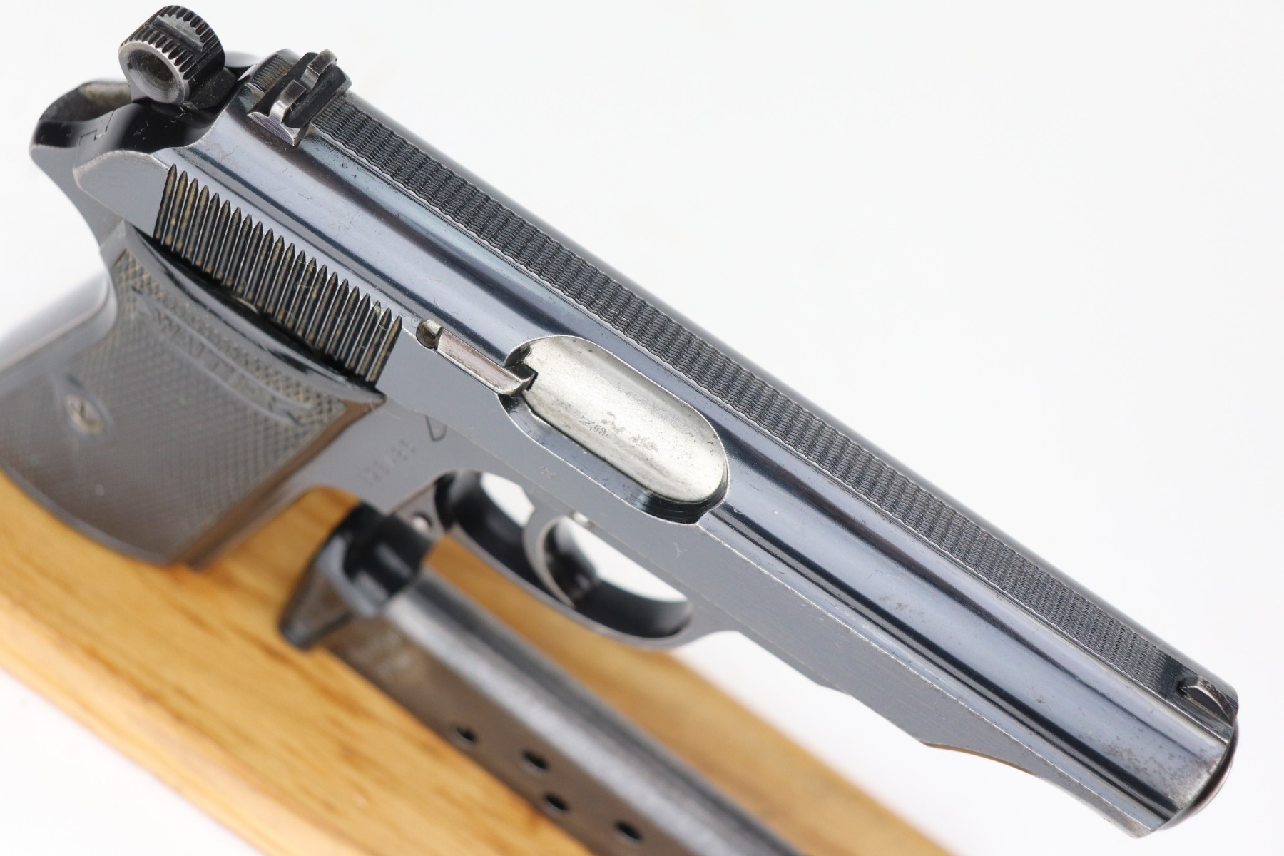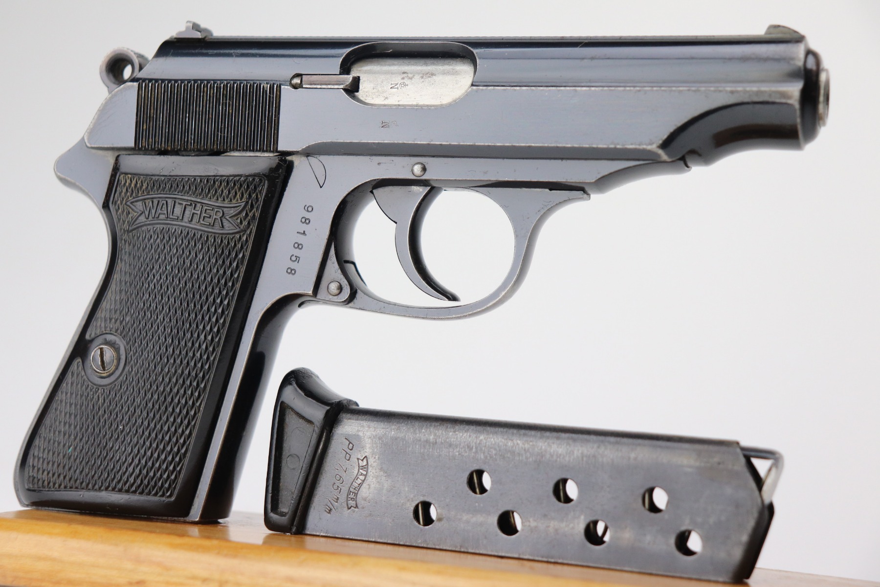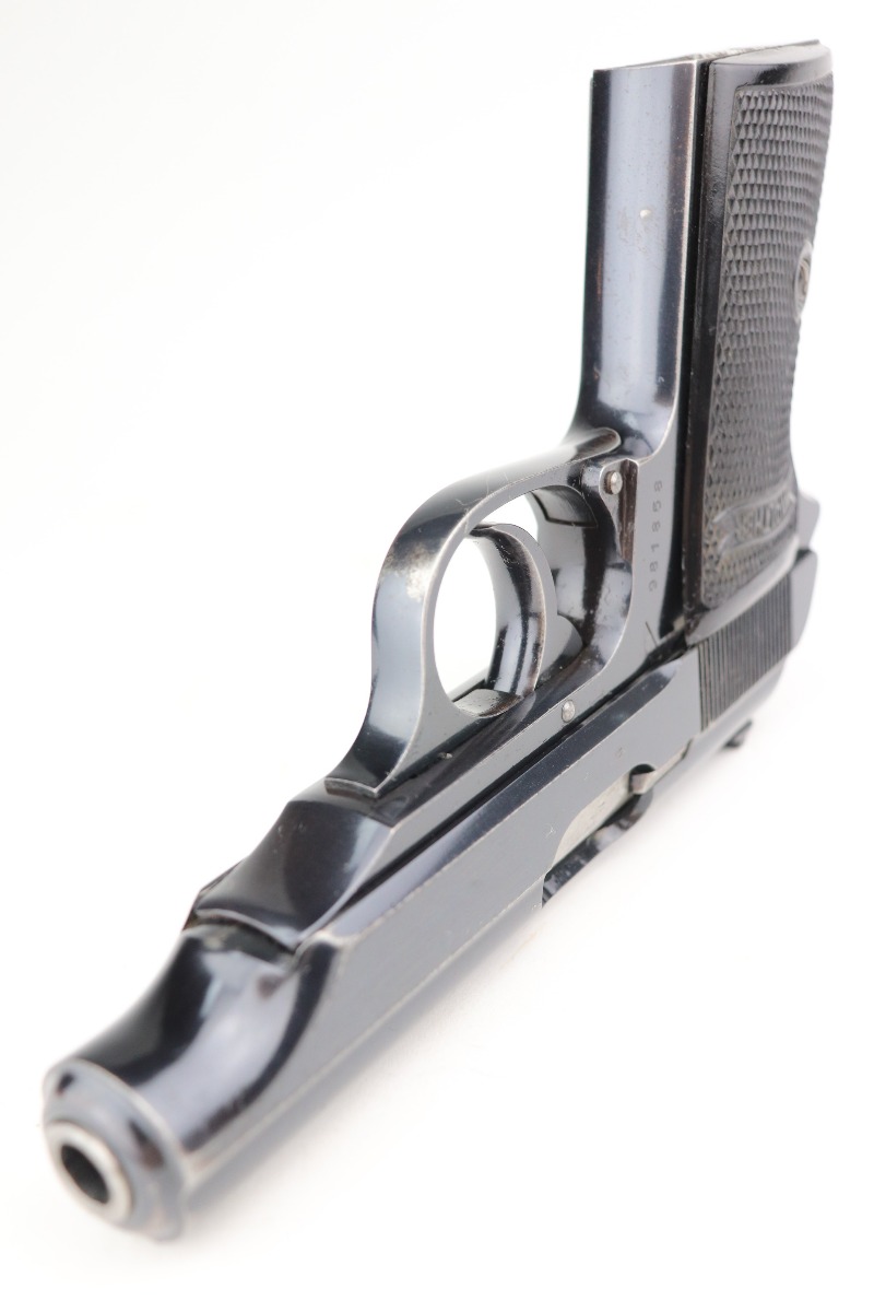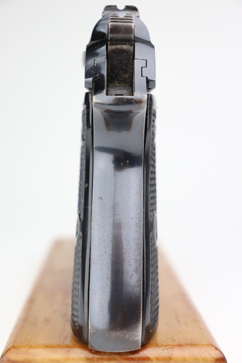 2/5/21 – This is an excellent example of a Walther PP sold in the commercial market in 1938. It is all matching and has the proper “Crown N” proofs. The gun has retained about 95% of its original bluing. There are areas of minor wear around the muzzle, high edges of the slide, a few small spots on the front strap, and at the base of the back strap. There is some very light freckling here and there most noticeable on the straps. It comes with excellent grips and a wartime finger extension magazine. The bore is minty except for a very slight, almost un-noticeable, bulge in the barrel near the muzzle.