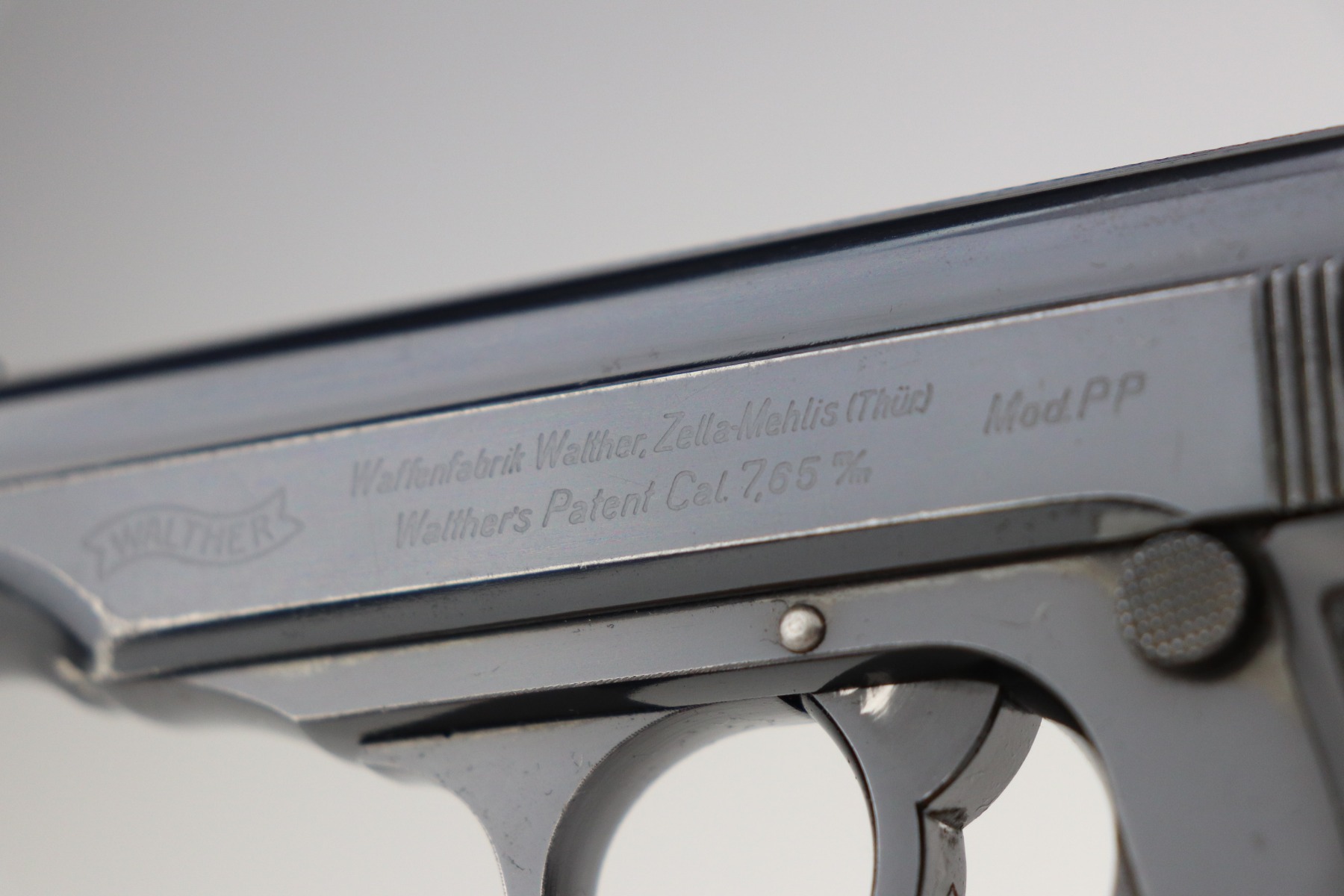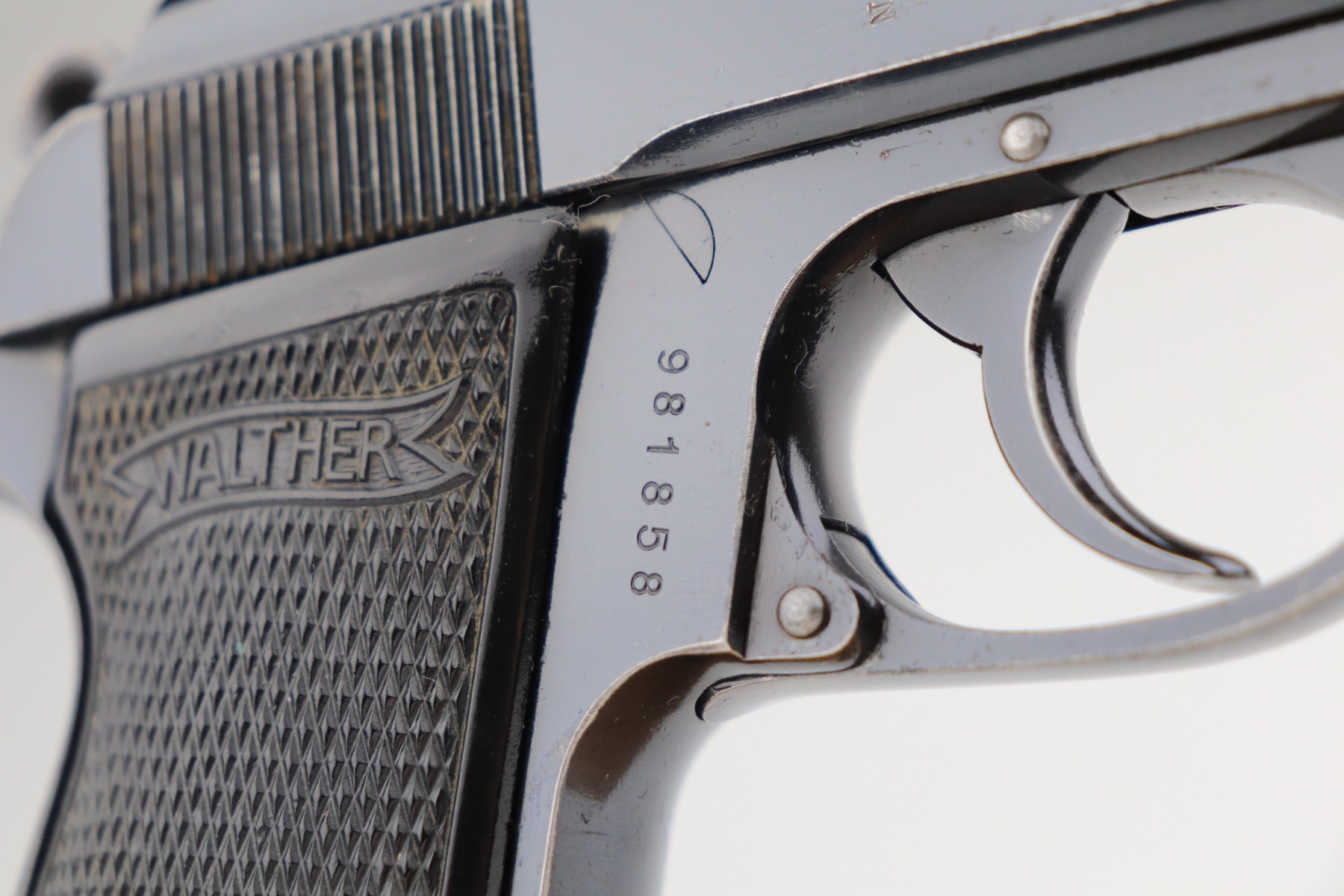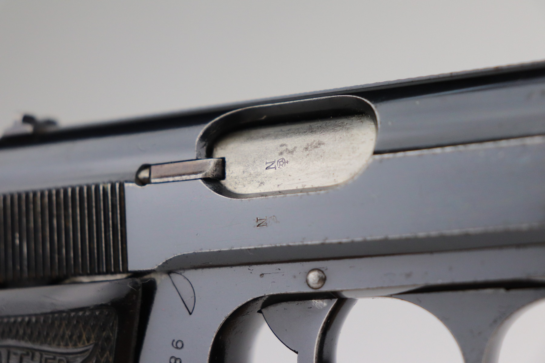2/5/21 – This is an excellent example of a Walther PP sold in the commercial market in 1938. It is all matching and has the proper “Crown N” proofs. The gun has retained about 95% of its original bluing. There are areas of minor wear around the muzzle, high edges of the slide, a few small spots on the front strap, and at the base of the back strap. There is some very light freckling here and there most noticeable on the straps. It comes with excellent grips and a wartime finger extension magazine. The bore is minty except for a very slight, almost un-noticeable, bulge in the barrel near the muzzle.