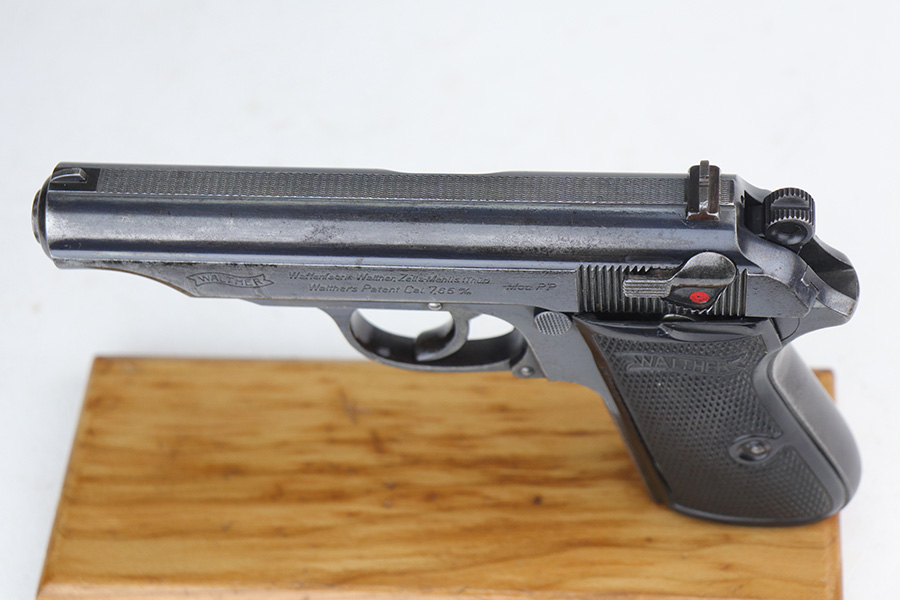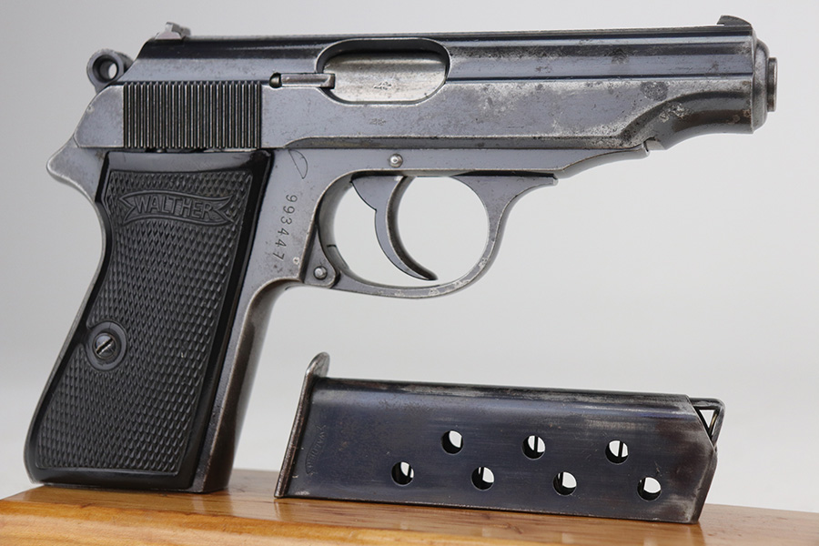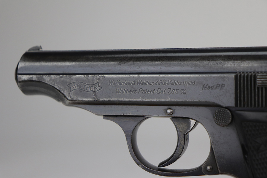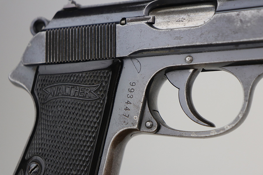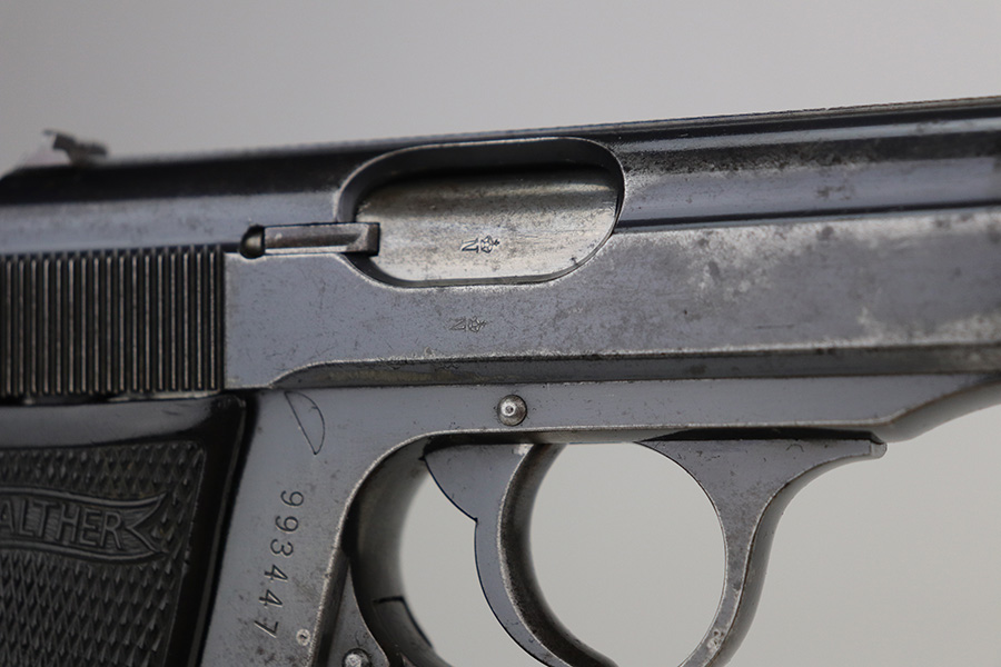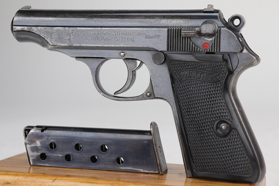 11/10/21 – This is a nice example of a Walther PP sold in the commercial market in 1938. It is all matching and has the proper “Crown N” commercial proofs. The gun has retained roughly 75% of its original high polish finish. There are areas of significant spotty finish loss throughout, most noticeable on both sides of the slide and on the grip straps. There are areas of spotty oxidation throughout and areas with tiny pits on the front half of the slide. Comes with nice black bakelite grips – there is a separation crack along the edge of the left panel. Also comes with a period-correct Walther banner-only magazine. Mint bore.