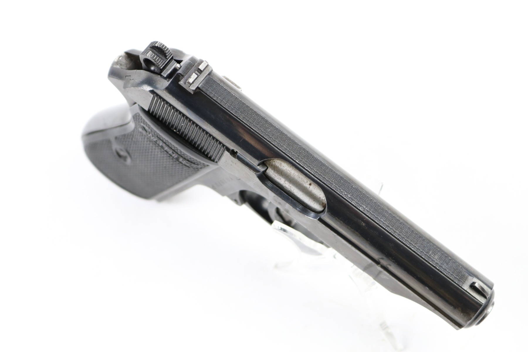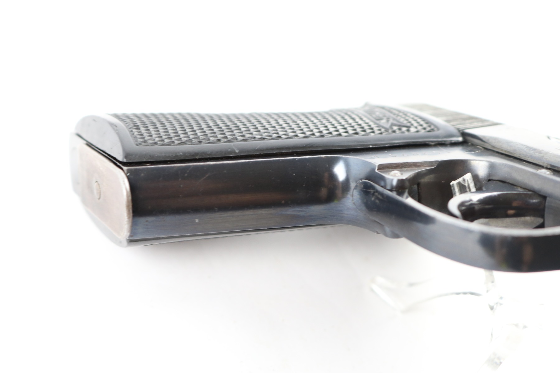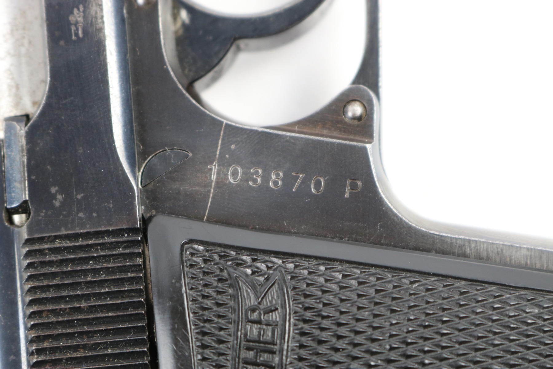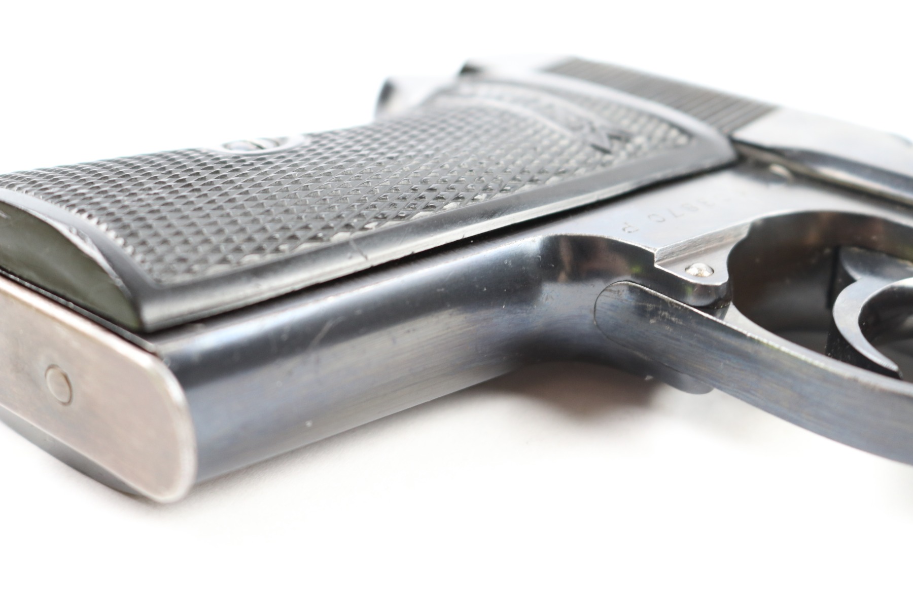 5/17/18 – This is an original WW2 production commerical Walther PP pistol. The gun has all original and correct parts, including the magazine. The pistol has edge wear and slide wear throughout – especially on the right side of the slide where there’s more significant discoloration. The straps are fairly clean with minimal wear. The grips have no cracks or chips. Bore rates at 9 out of 10 with no major issues and clean rifling. Guaranteed all original and authentic.