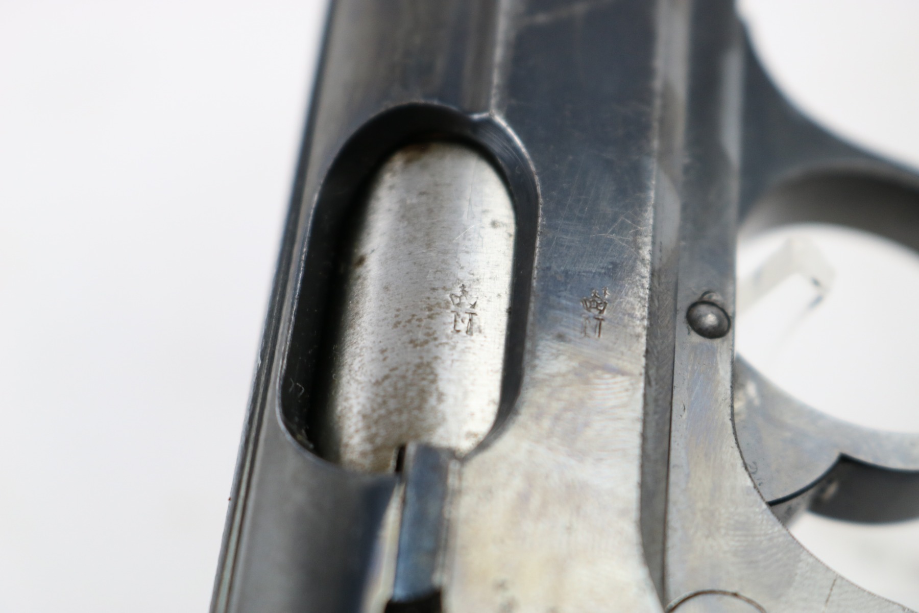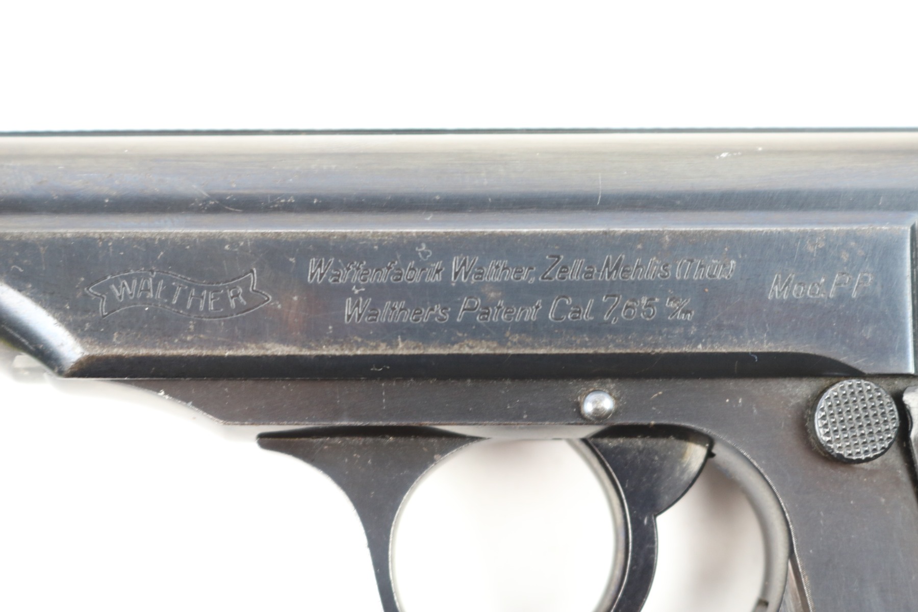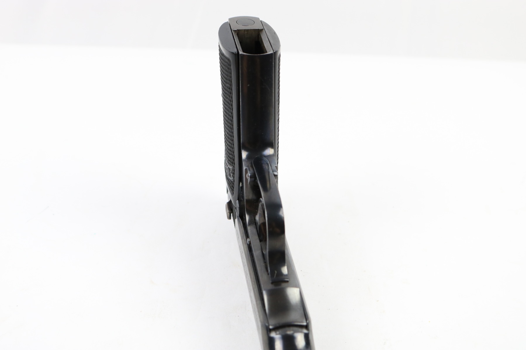 5/17/18 – This is an original WW2 production commerical Walther PP pistol. The gun has all original and correct parts, including the magazine. The pistol has edge wear and slide wear throughout – especially on the right side of the slide where there’s more significant discoloration. The straps are fairly clean with minimal wear. The grips have no cracks or chips. Bore rates at 9 out of 10 with no major issues and clean rifling. Guaranteed all original and authentic.