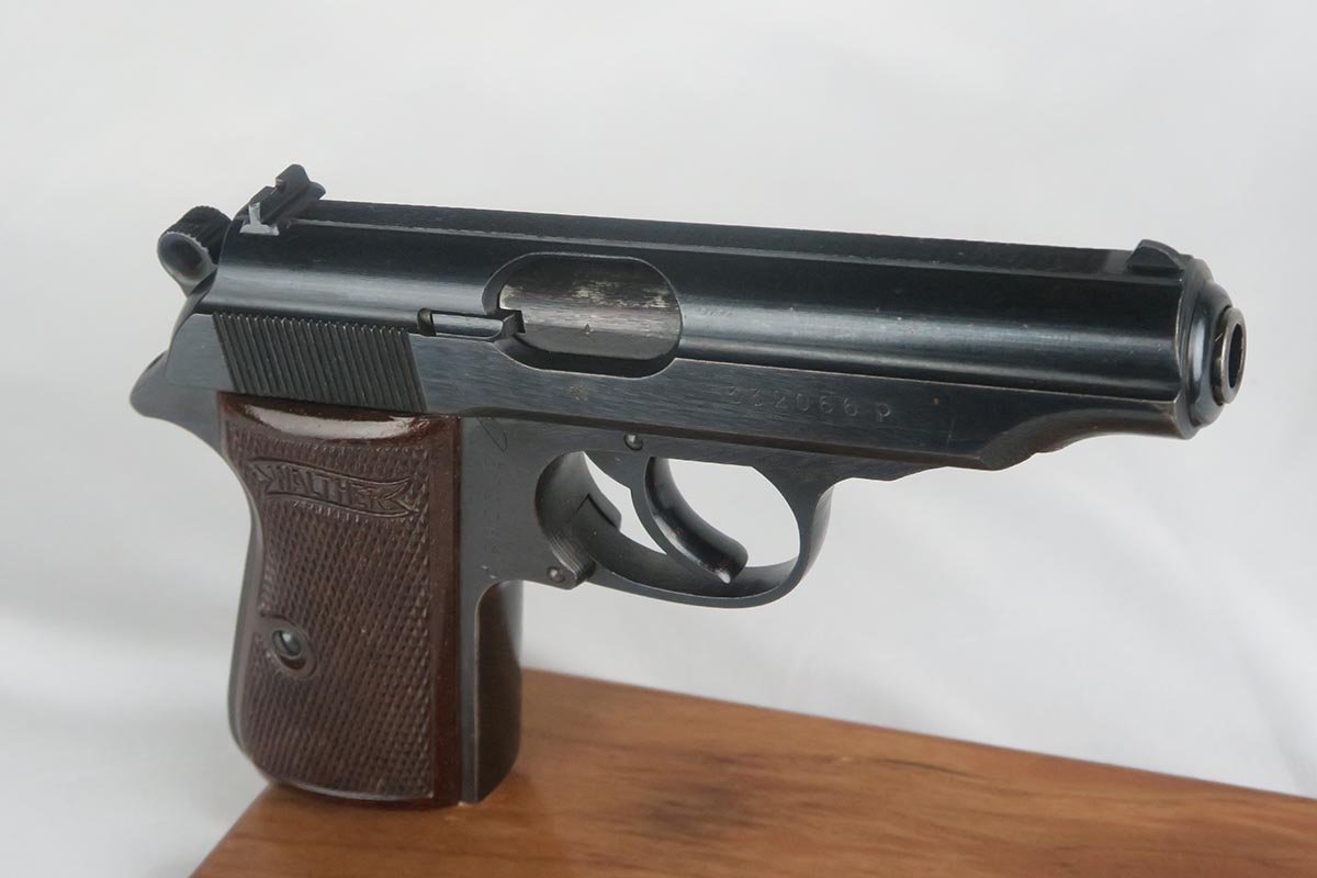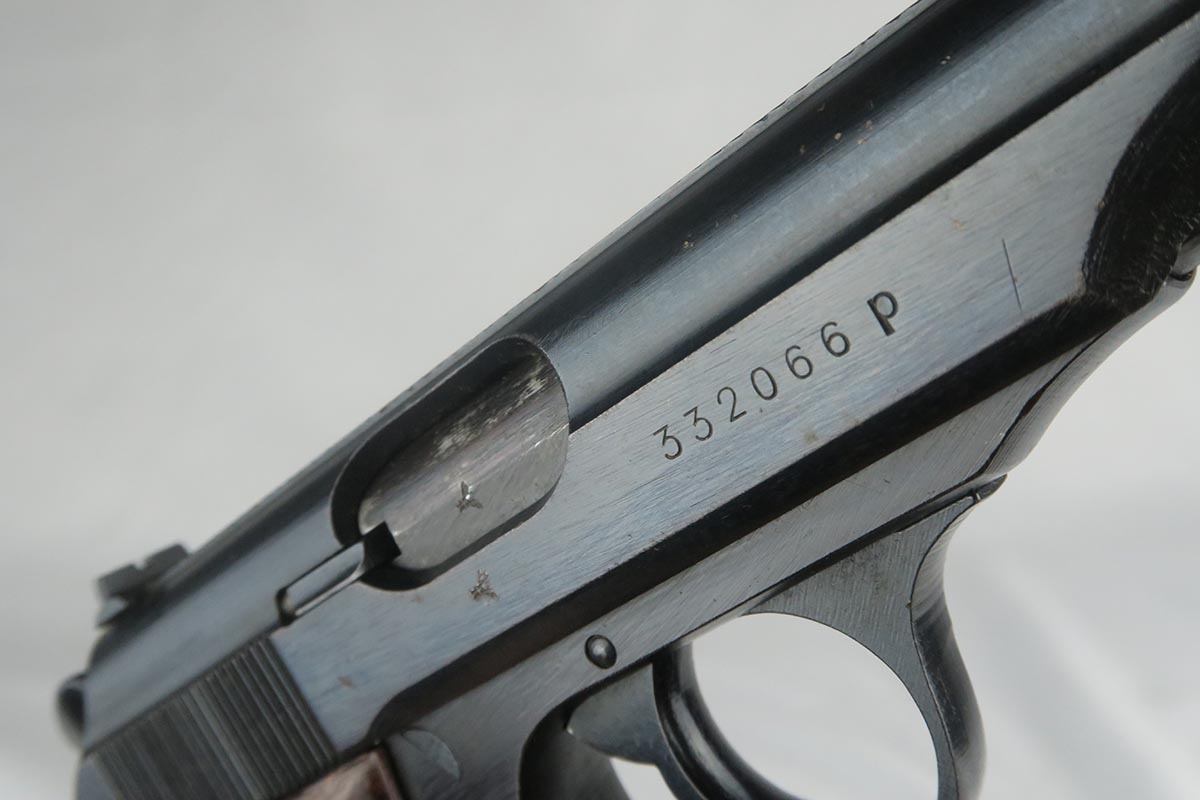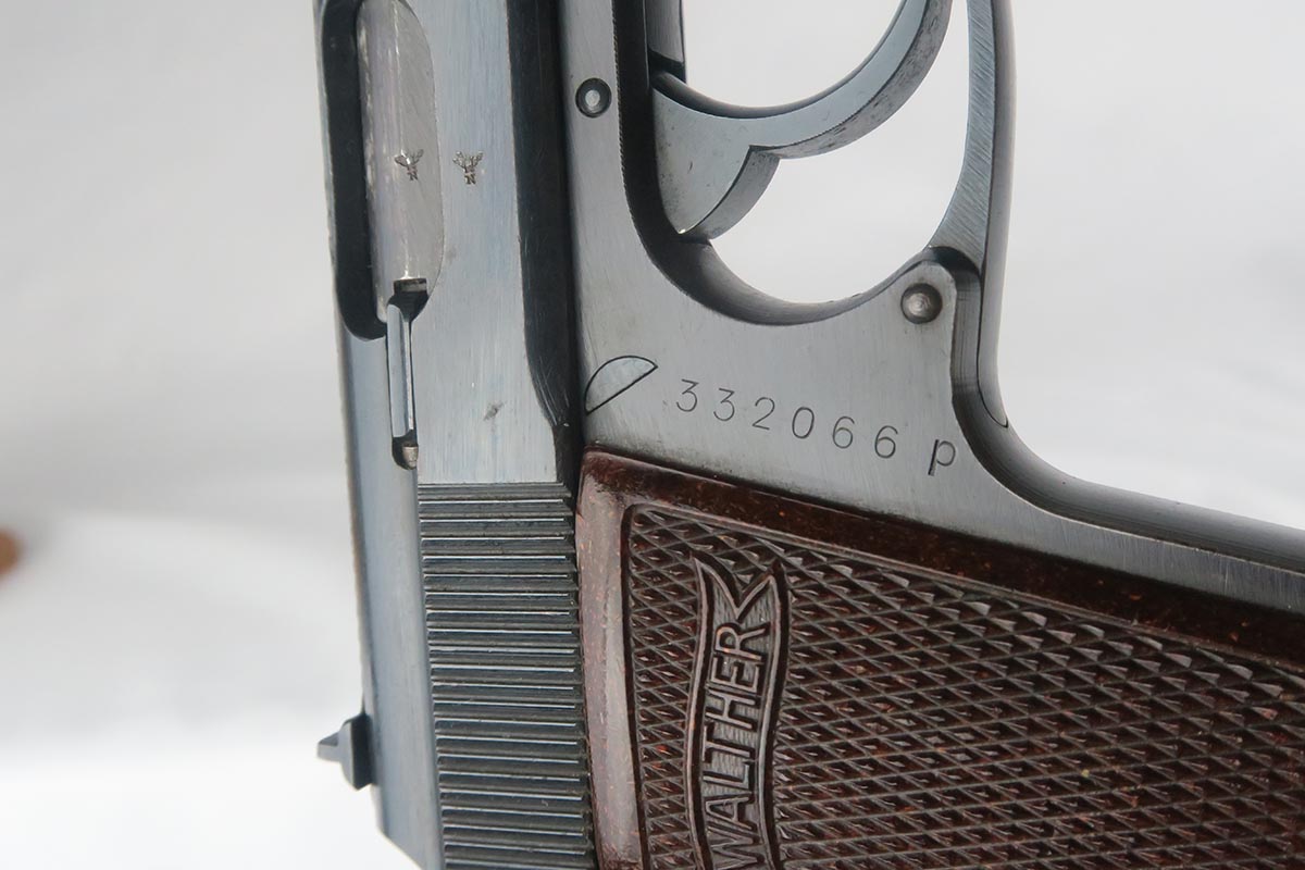 11/7/17 – This a very nice commercial Walther PP from near the end of the war.  All original and matching, the finish rates at about 97-98% with some muzzle wear and edge thinning.  The top of the left side slide has an area with what may be little flecks of white paint.  I thought they were some dings in the metal at first but they have no texture and don’t appear to be corrosion either.  Excellent reddish grips and wartime magazine.  Eagle/N proofs.  Mint bore.