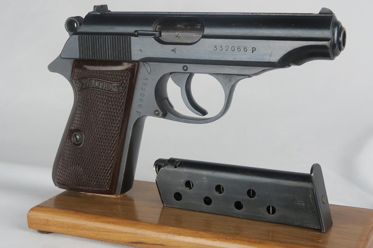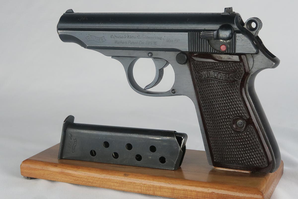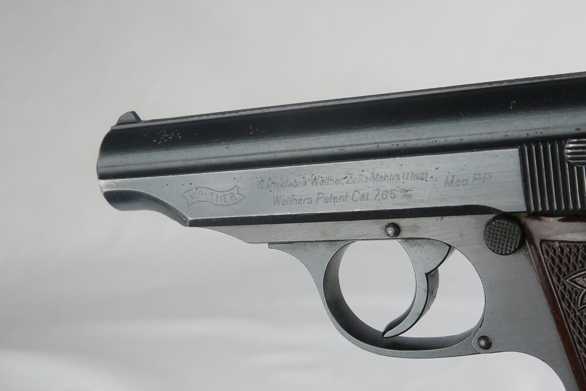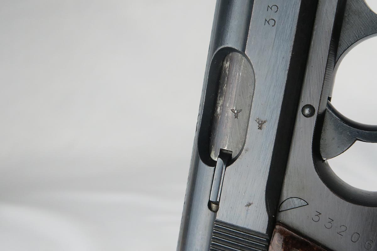 11/7/17 – This a very nice commercial Walther PP from near the end of the war.  All original and matching, the finish rates at about 97-98% with some muzzle wear and edge thinning.  The top of the left side slide has an area with what may be little flecks of white paint.  I thought they were some dings in the metal at first but they have no texture and don’t appear to be corrosion either.  Excellent reddish grips and wartime magazine.  Eagle/N proofs.  Mint bore.