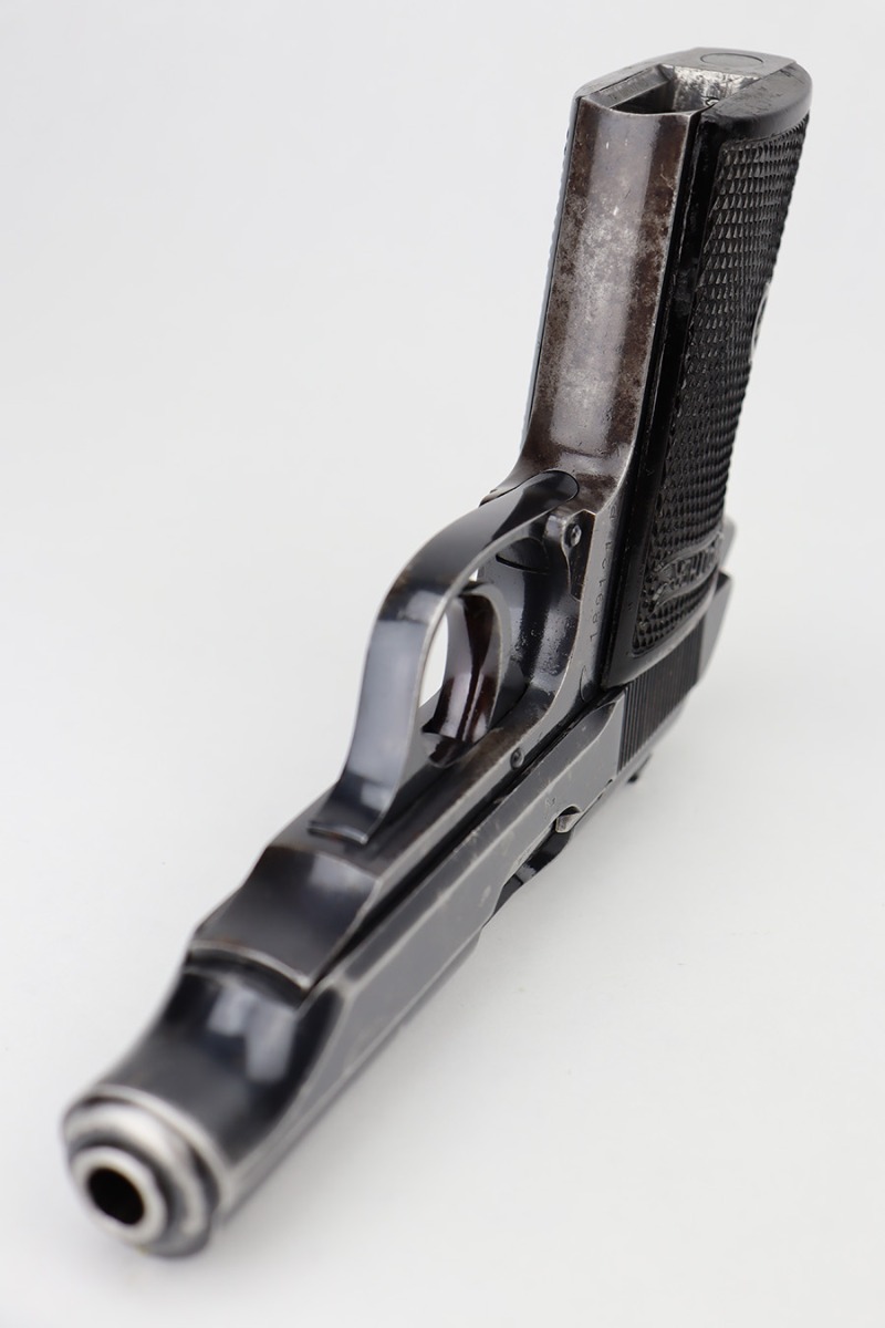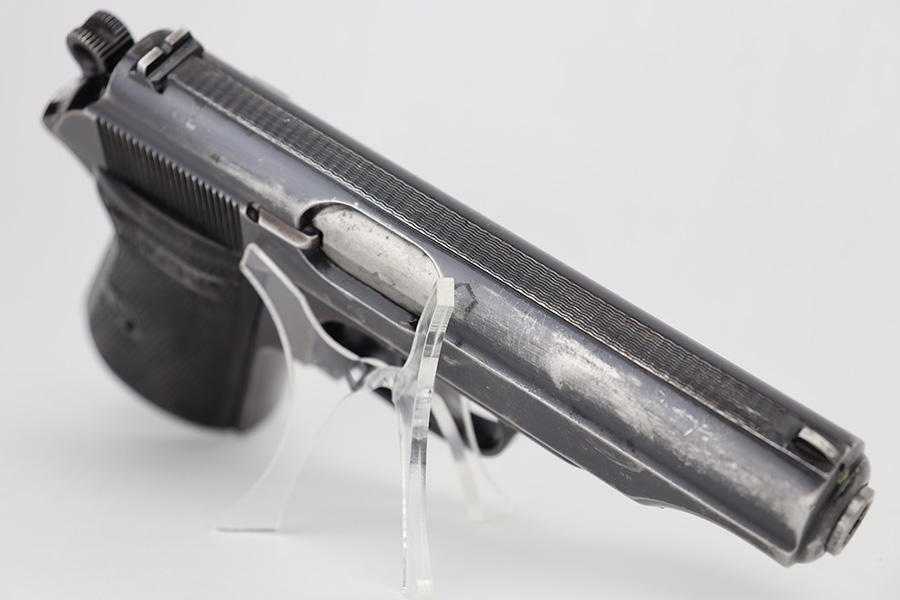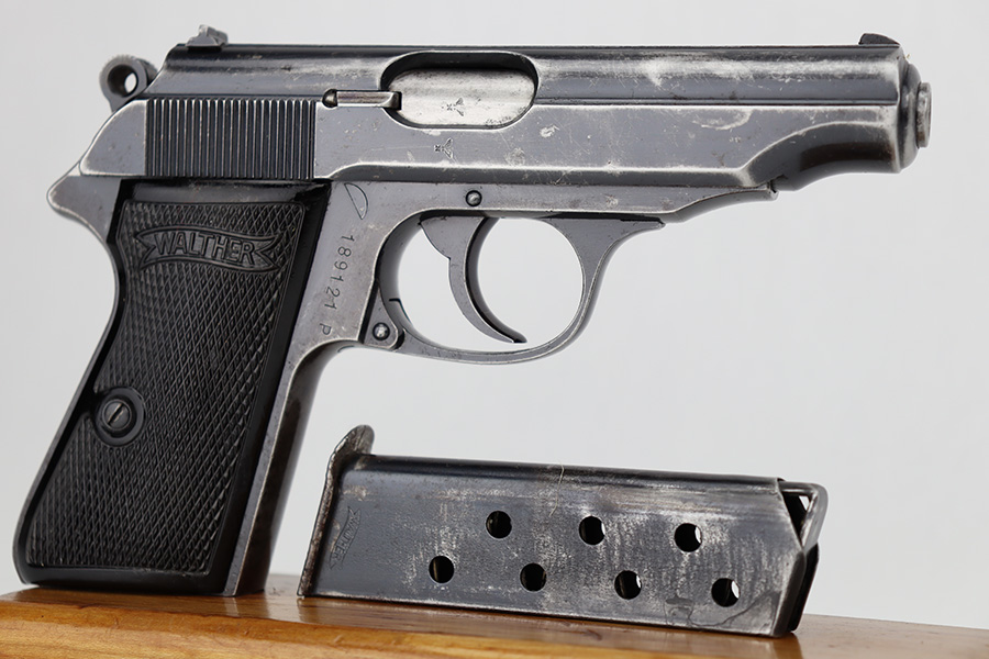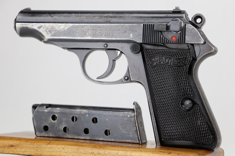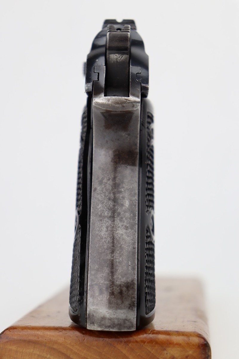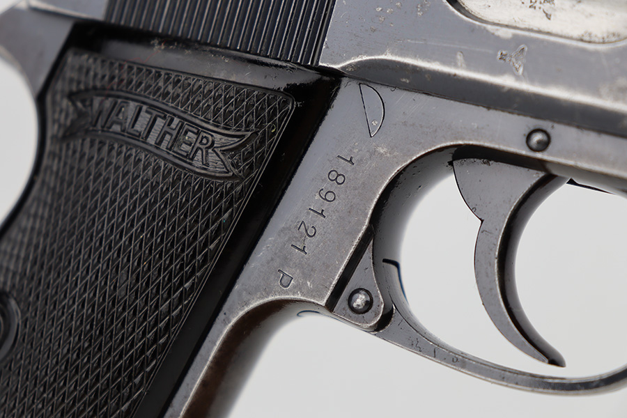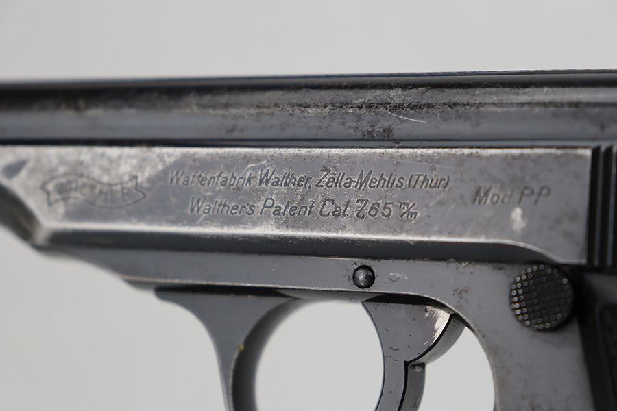 6/15/23 – This is a Walther PP sold in the commercial market in 1940. It is all matching and has the proper “Eagle N” commercial proofs. It has retained roughly 60% of its original finish with spotty wear and finish loss throughout. Spotty oxidation on the grip straps as well. Fitted with very nice period-correct black bakelite grips and comes with a Walther banner-only magazine. The bore has good rifling, but there is pin-pricking in the grooves.