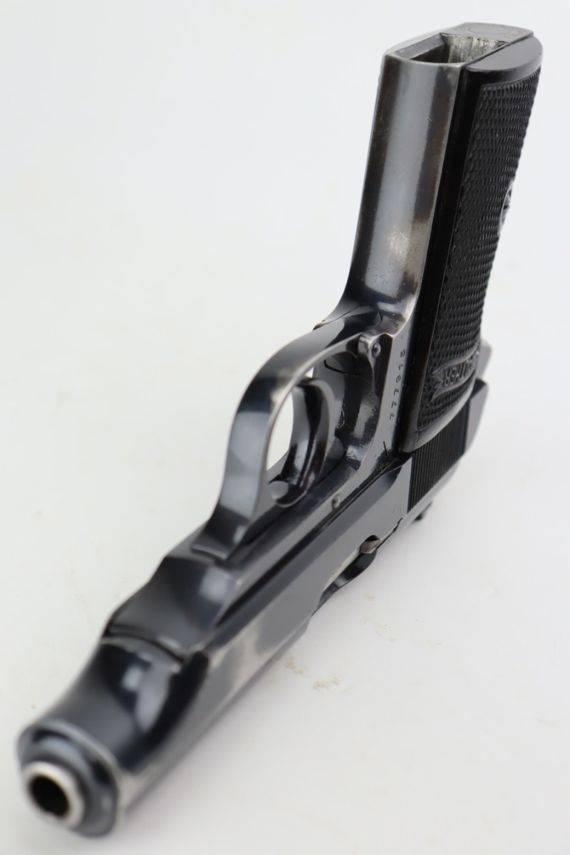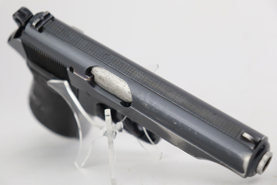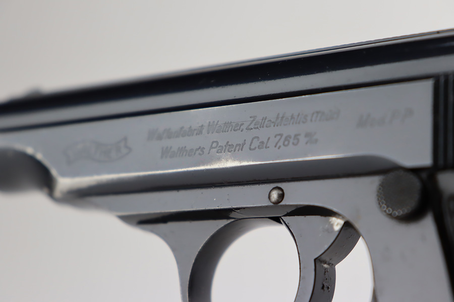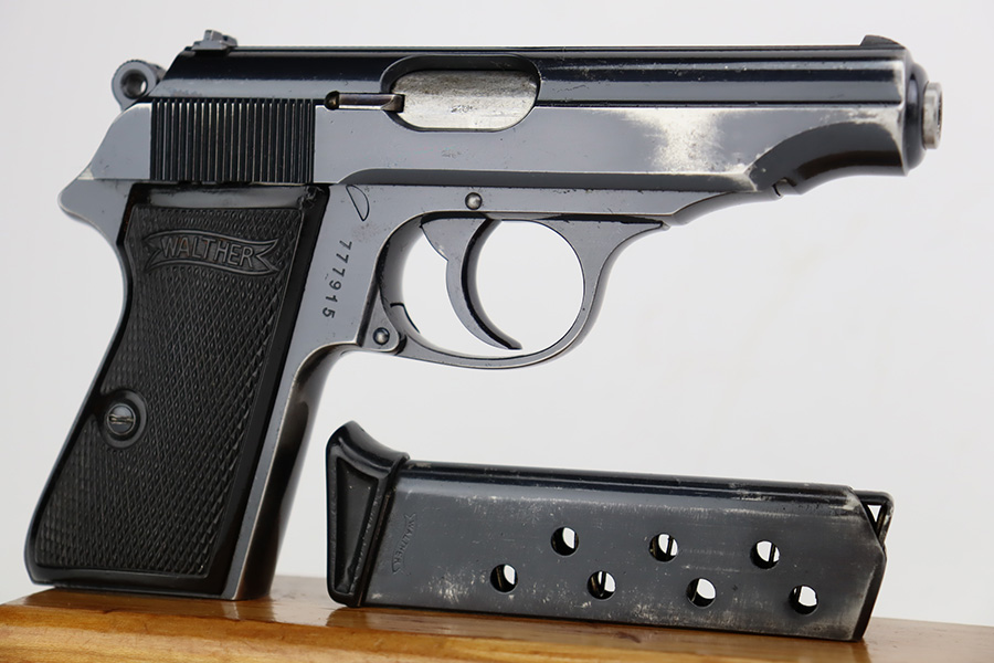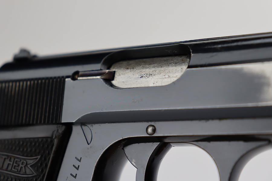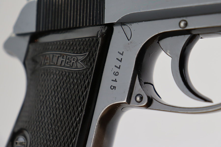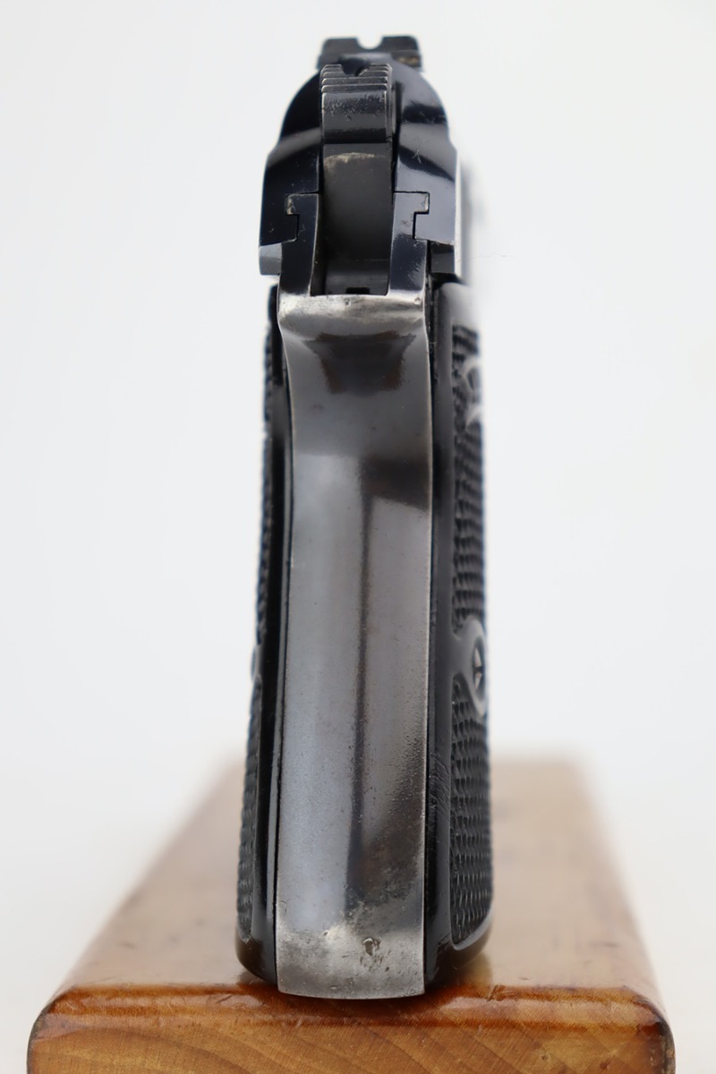 9/19/23 – This is a nice example of a Walther PP sold in the commercial market in 1933. It is all matching and has the proper “Crown N” commercial proofs. It has retained somewhere between 85-90% of its original high polish finish. There is minor wear around the muzzle on the high edges in general. Areas of wear on both grip straps and on the right side of the slide. Fitted with very nice period-correct black bakelite grips. Comes with a period-correct finger extension magazine. The bore is shiny with strong rifling and some light freckling near the muzzle end.