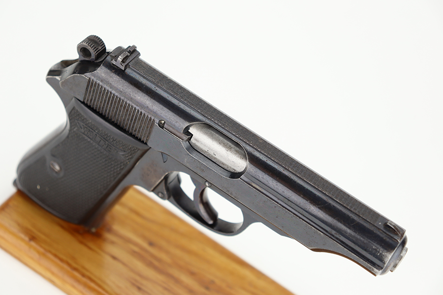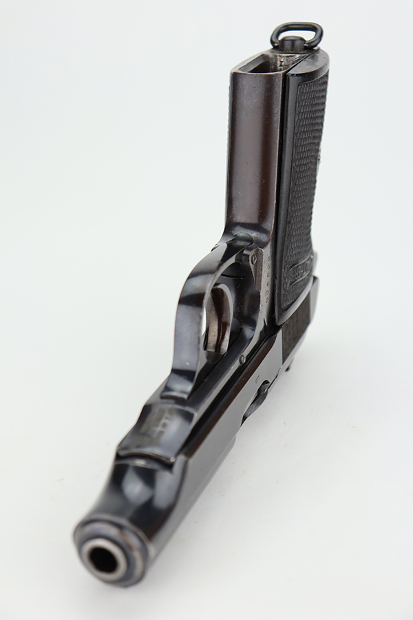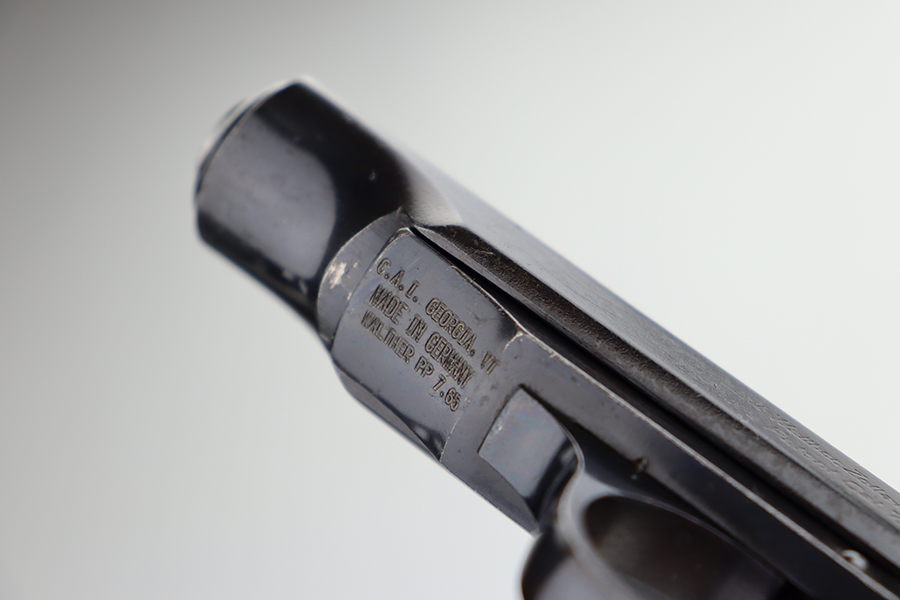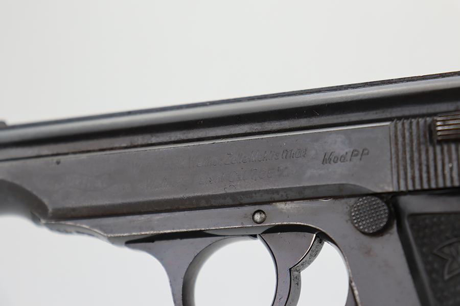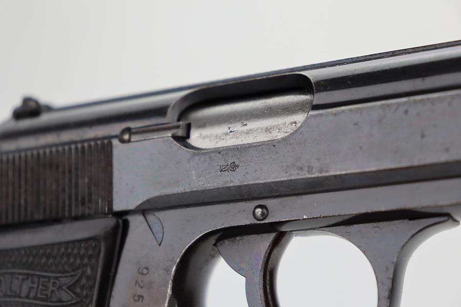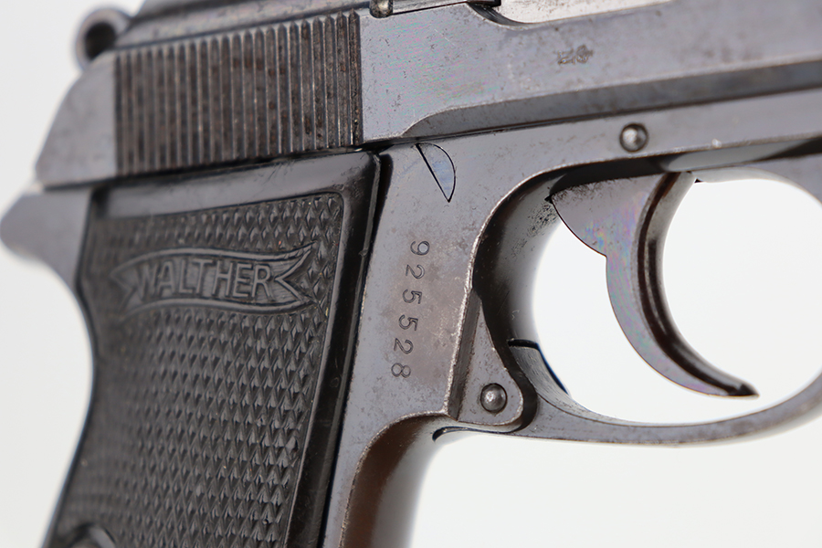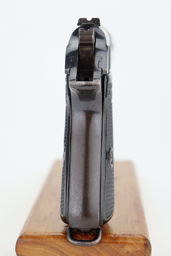 6/11/24 – This is a Walther PP sold in the commercial market in 1936. All matching with the proper “Crown N” commercial proofs. The gun has an old re-blued finish. There is very little actual finish loss, but there are some areas of light freckling here and there and obvious brown patina on the grip straps. Fitted with period-correct black bakelite grips and comes with a post-war finger extension magazine. Post-war police-style lanyard on the butt of the frame. Import mark on the underside of the frame.