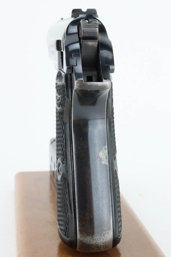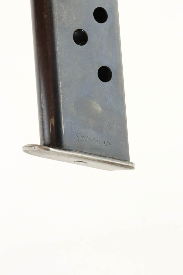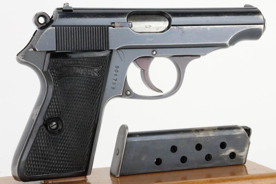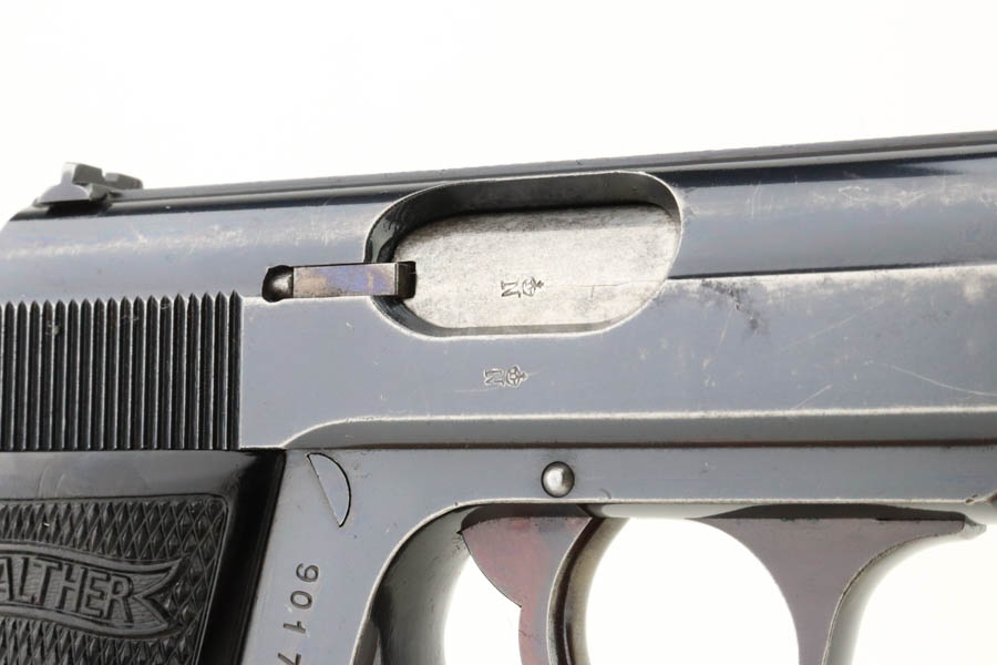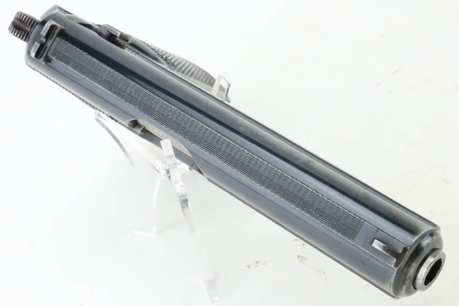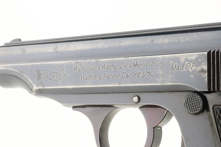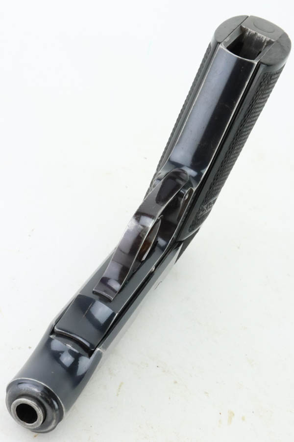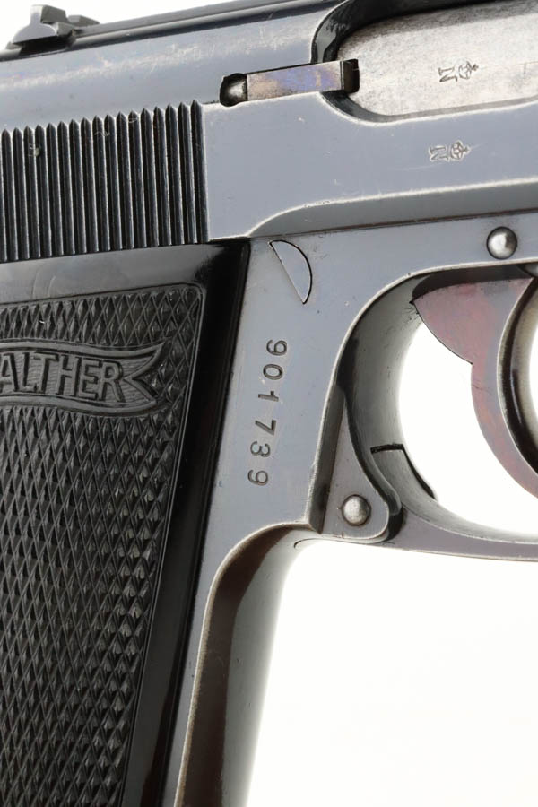 7/10/24 – This is a nice example of a Walther PP sold in the commercial market in 1935. All matching and “Crown N” proofed. Its original finish rates somewhere between 85-90%. There is wear on the grip straps and somewhat spotty wear along both sides of the slide, concentrated mostly around the high edges. Fitted with period-correct black bakelite grips and comes with a proper Walther banner-only magazine. Minty bore.