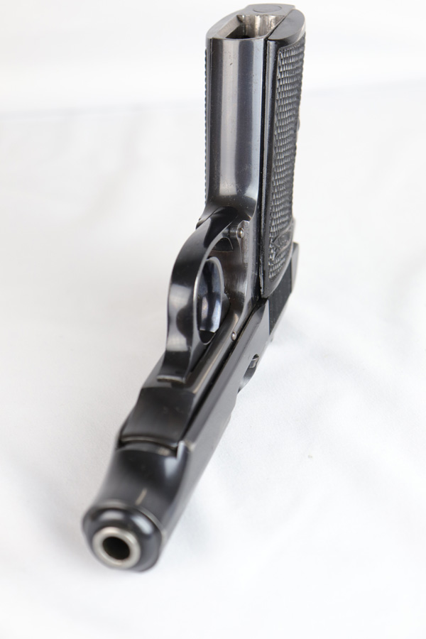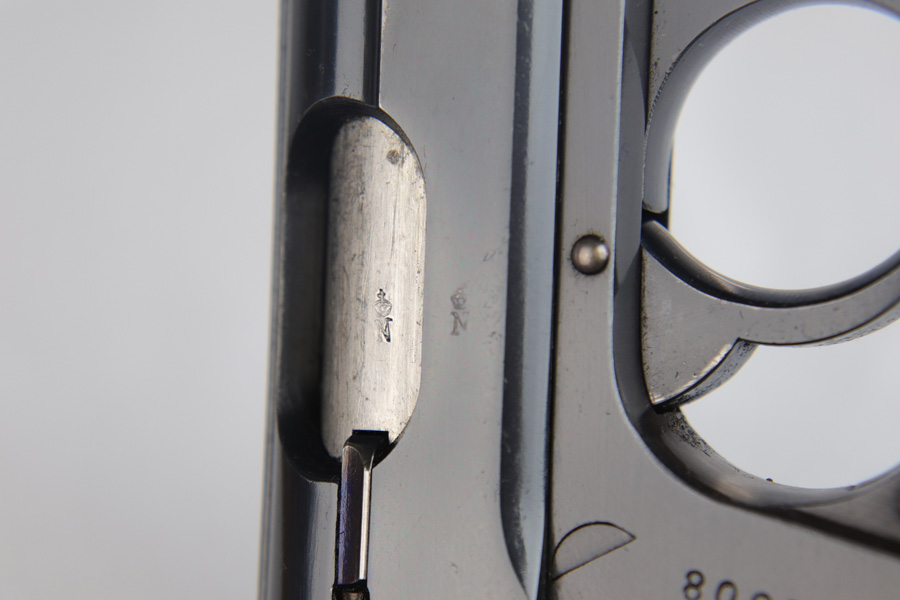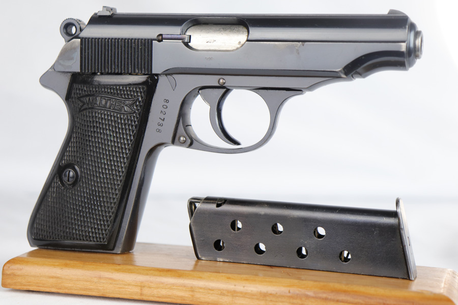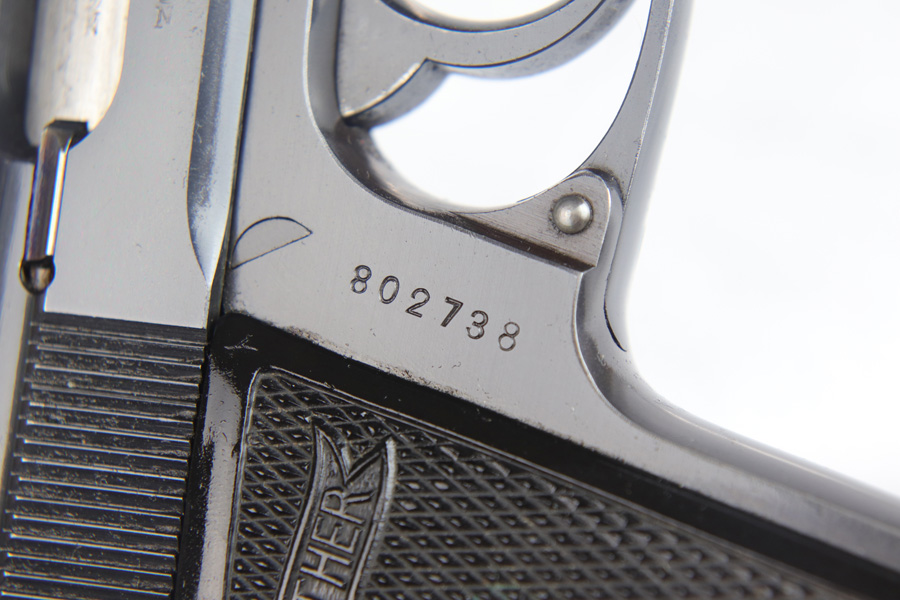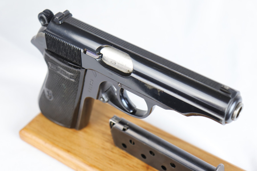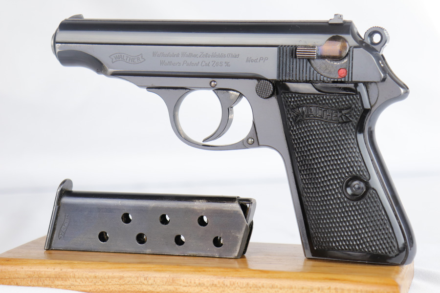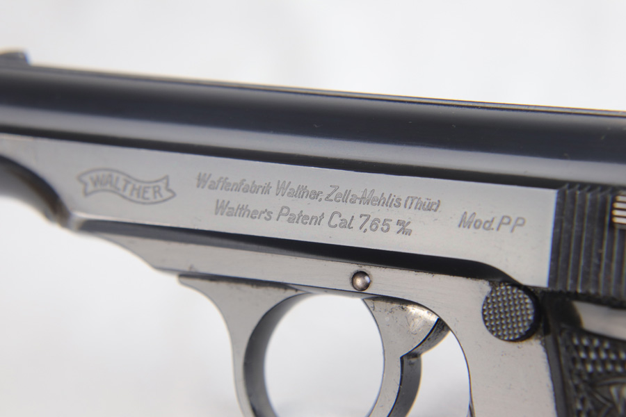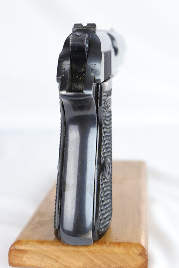 2/6/19 – This is an excellent commercial Walther PP from the early Nazi era. The original high-polish blue rates at about 96% with muzzle and edge wear, and a spot of finish loss on the right side of the slide and the bottom of the back strap. There’s also a minor spot of discoloration on the back of the right side slide. Early 90 degree safety. Weighted grips. Excellent bore. Early banner magazine.