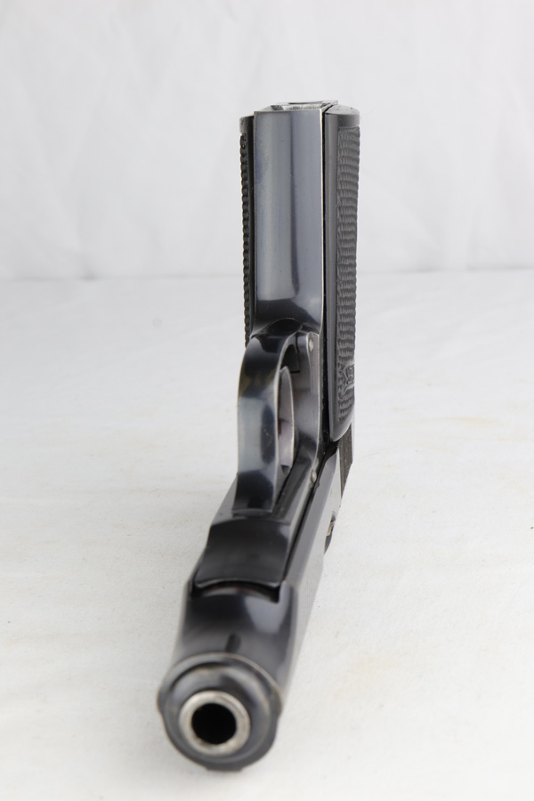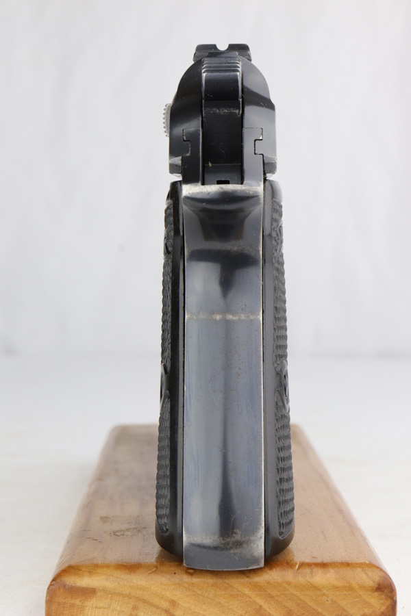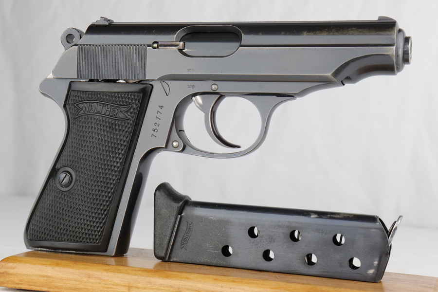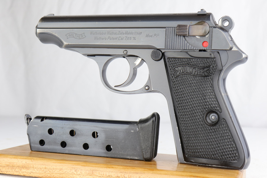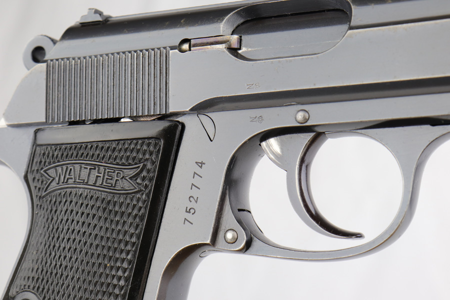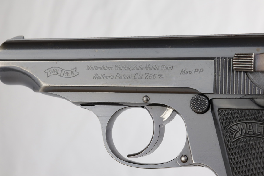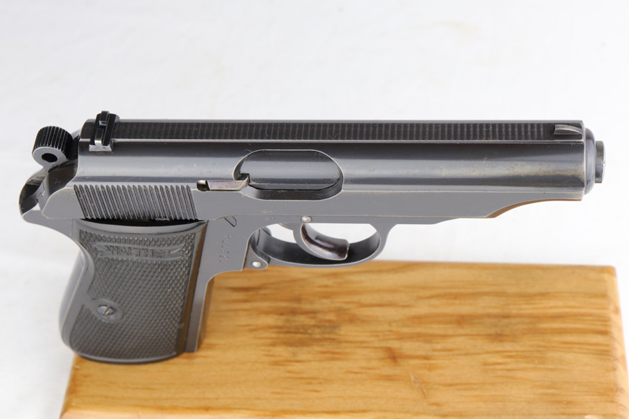3/22/19 – This is a very early and desirable Walther PP with scarce, early features. The pistol is all matching and original, with about 95% high-polish blue remaining. Basic edge and muzzle wear is present, but the majority of finish loss is on the back strap and the rounded portion of the right side slide. Serial dates this pistol to 1930, second year of production, and makes this one of the first 3,000 produced. Early features include the 90 degree safety, slab side magazine with open follower, X-marked grips, extended barrel and fat safety. The grips and magazine are in excellent condition, and the bore is minty. Magazine bottom does have a thin surface crack in it.