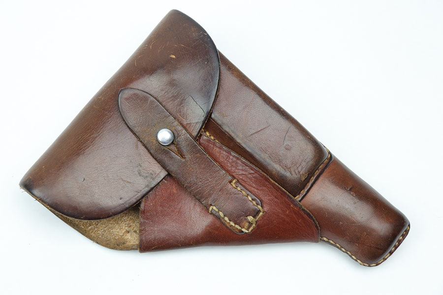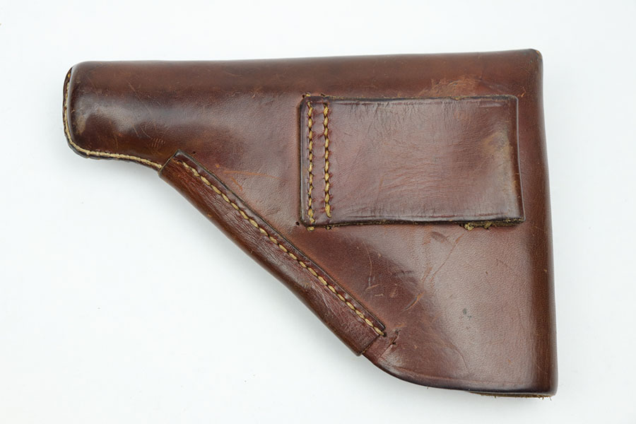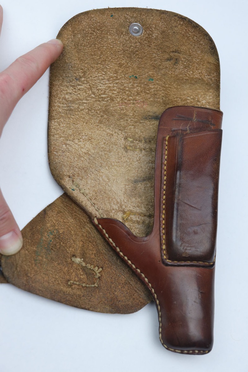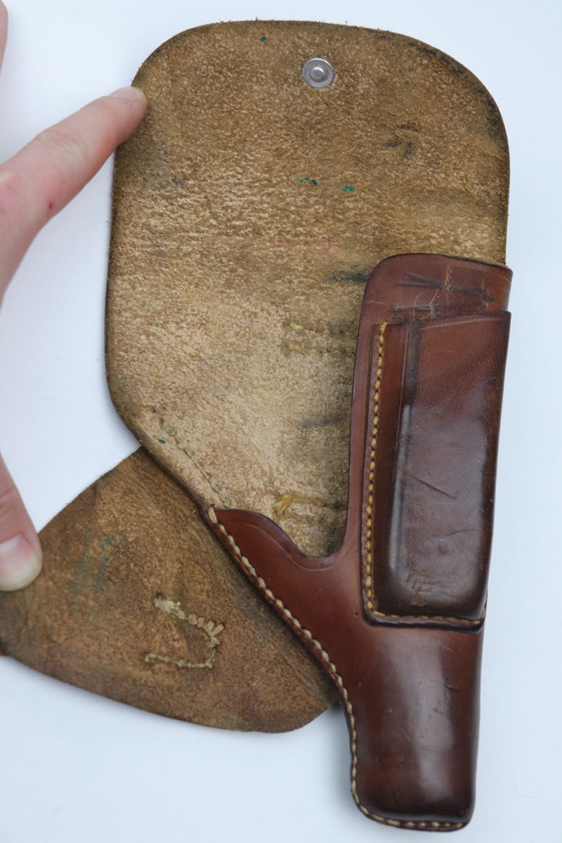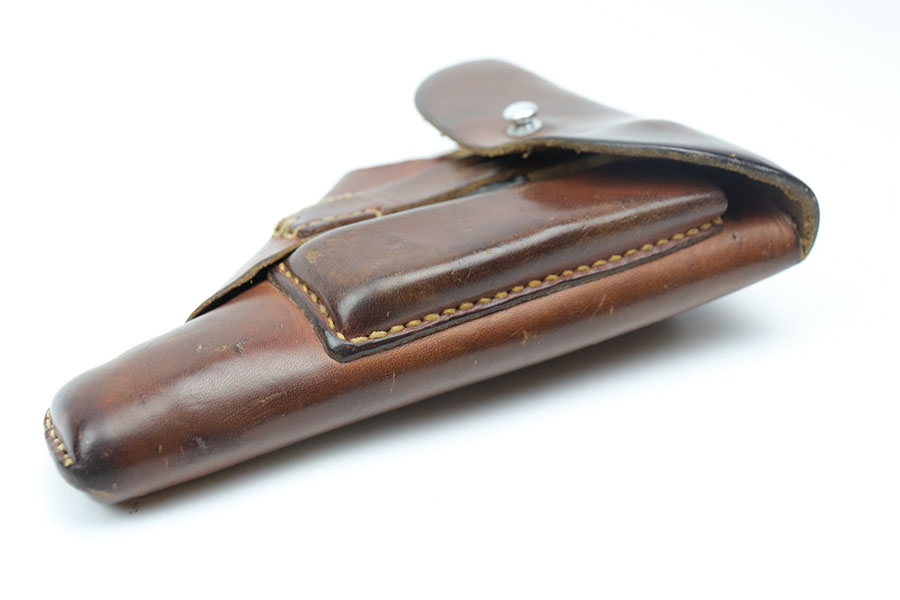 11/10/20 – This is an original WW2 era production holster for a Walther PP or similar sized pistol. The holster has no maker stamps or markings, but the style and aging indicate WW2 production. The leather has normal pliability and wear with no excessive damage. Stitching all original and in tact. A straightforward all correct piece.