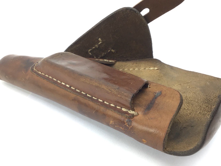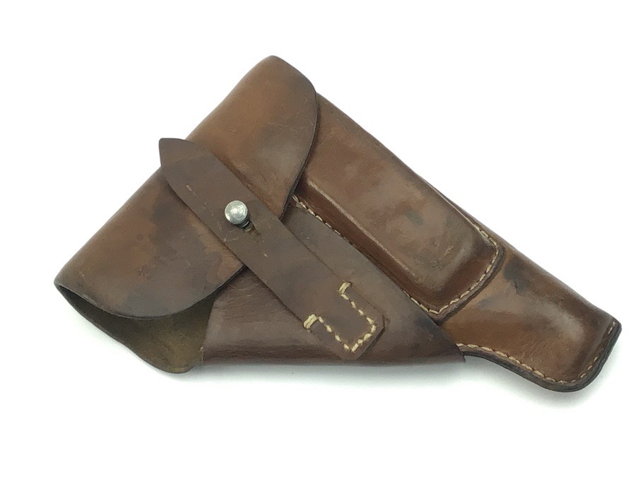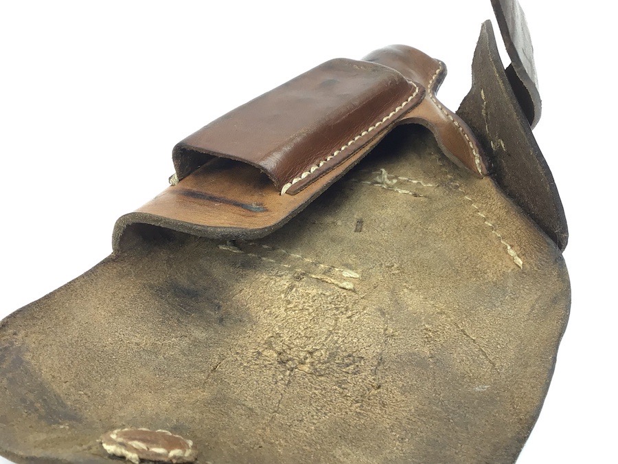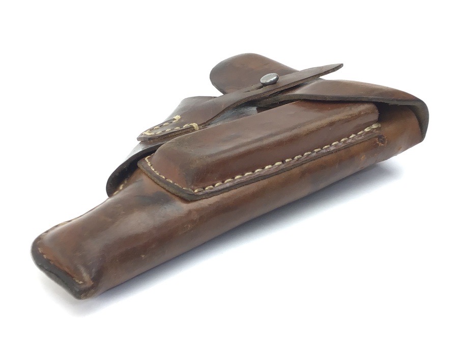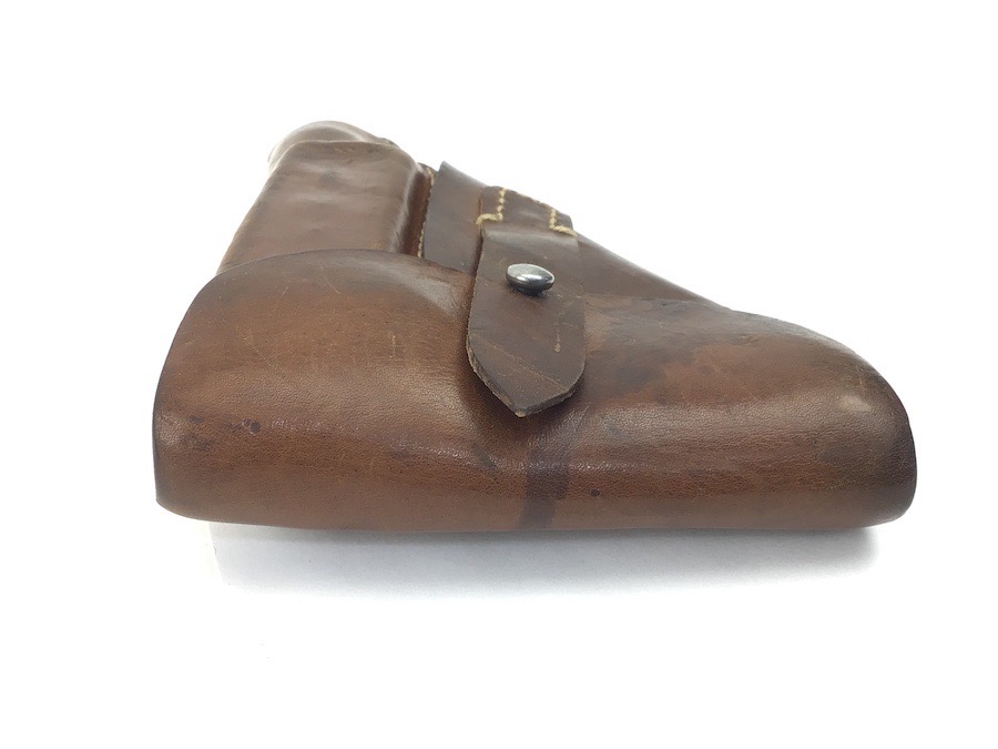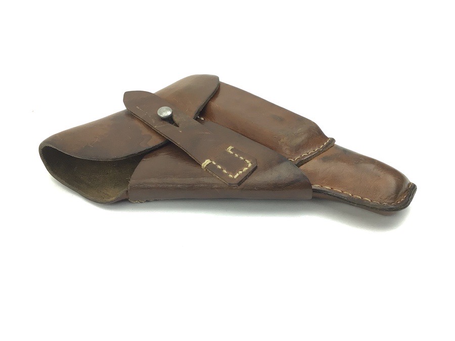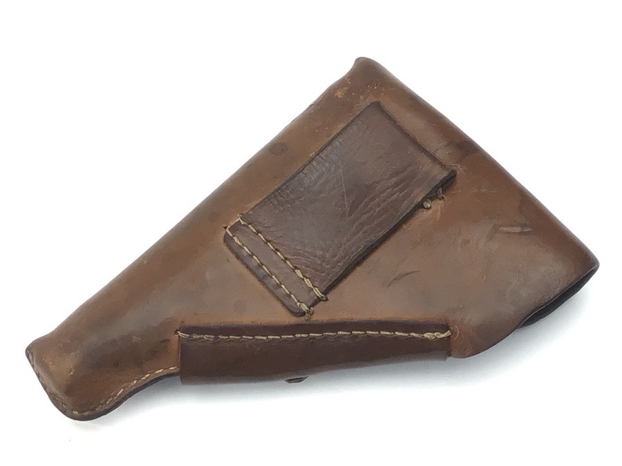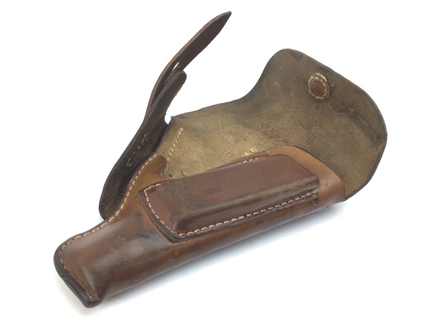 3/10/23 – This is an original WW2 era production holster for a Walther PP or similar sized pistol. The holster has no maker stamps or markings, but the style and stitching indicate WW2 production. The leather has normal pliability and wear with no excessive damage. Stitching all original and in tact. Minor surface stains and scuffs. Fairly clean interior. A straightforward, all correct piece.