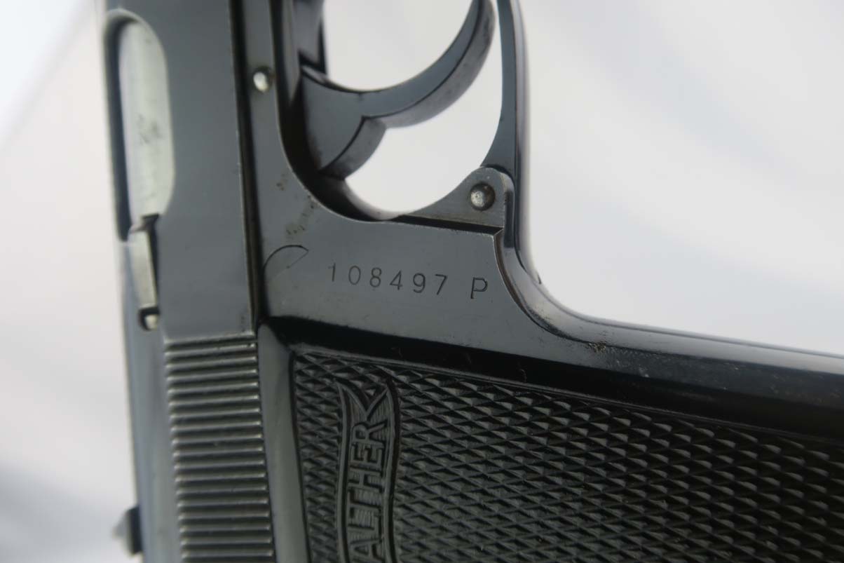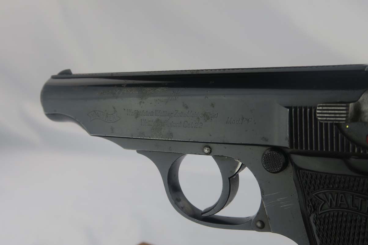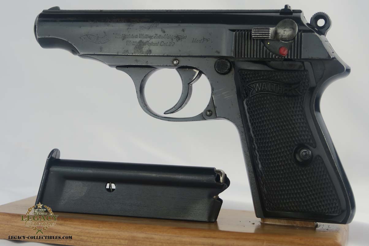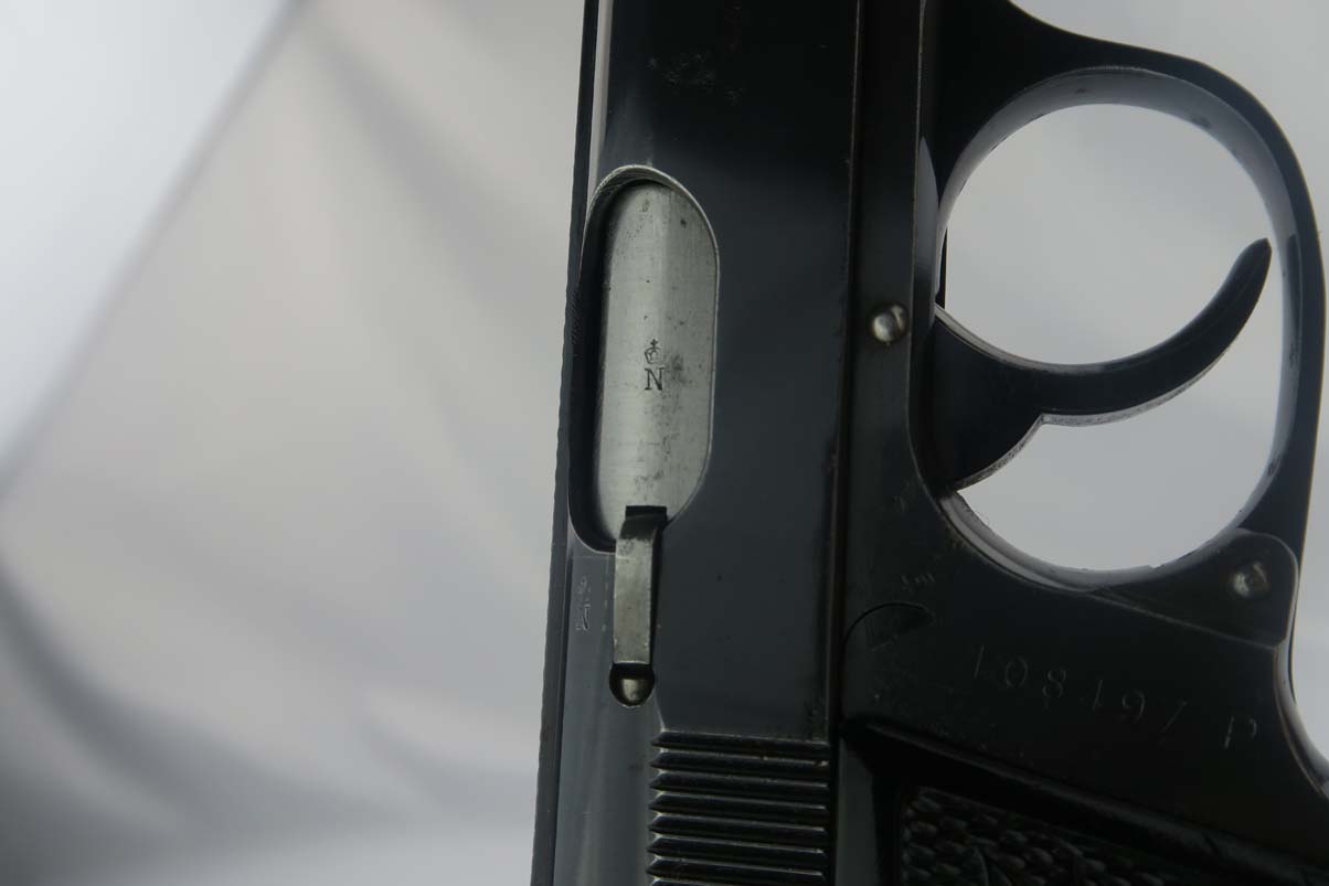 7/13/17 – This is a WW2 era Walther PP, chambered in .22.  The pistol is correct and original, with about 96-97% bluing remaining.  While it does have minimal finish loss, there is noticeable pitting on both sides of the slide.  Proper grips and mag, but the left panel does have a crack in it.  Minty bore.  Would make a great shooter!